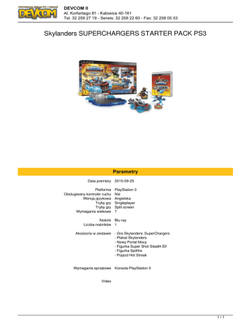 DEVCOM II Al. Korfantego 81 - Katowice 40-161 Tel. 32 259 27 19 - Serwis: 32 259 22 60 - Fax: 32 258 05 53 Skylanders SUPERCHARGERS STARTER PACK PS3 Parametry Data premiery 2015-09-25 Platforma Obsługiwany kontroler ruchu Wersja językowa Tryby gry Tryby gry Wymagania wiekowe PlayStation 3 Nie Angielska Singleplayer Split screen 7 Nośnik Blu-ray Liczba nośników 1 Akcesoria w zestawie - Gra Skylanders: SuperChargers - Plakat Skylanders - Nowy Portal Mocy - Figurka Super Shot Stealth Elf - Figurka Spitfire - Pojazd Hot Streak Wymagania sprzętowe Konsola PlayStation 3 Video 1/1 Powered by TCPDF (www.tcpdf.org)