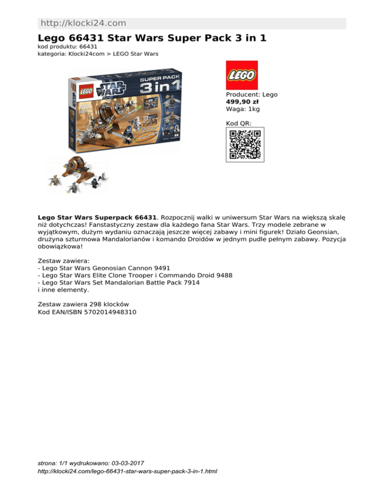 http://klocki24.com Lego 66431 Star Wars Super Pack 3 in 1 kod produktu: 66431 kategoria: Klocki24com > LEGO Star Wars Producent: Lego 499,90 zł Waga: 1kg Kod QR: Lego Star Wars Superpack 66431. Rozpocznij walki w uniwersum Star Wars na większą skalę niż dotychczas! Fanstastyczny zestaw dla każdego fana Star Wars. Trzy modele zebrane w wyjątkowym, dużym wydaniu oznaczają jeszcze więcej zabawy i mini figurek! Działo Geonsian, drużyna szturmowa Mandalorianów i komando Droidów w jednym pudle pełnym zabawy. Pozycja obowiązkowa! Zestaw zawiera: - Lego Star Wars Geonosian Cannon 9491 - Lego Star Wars Elite Clone Trooper i Commando Droid 9488 - Lego Star Wars Set Mandalorian Battle Pack 7914 i inne elementy. Zestaw zawiera 298 klocków Kod EAN/ISBN 5702014948310 strona: 1/1 wydrukowano: 03-03-2017 http://klocki24.com/lego-66431-star-wars-super-pack-3-in-1.html