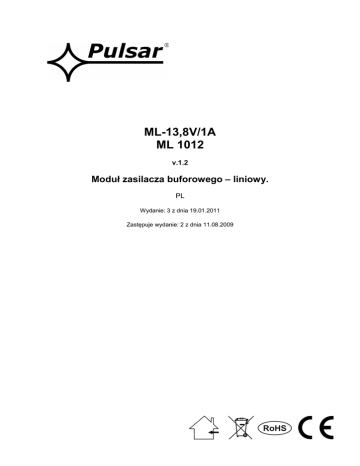 ML-13,8V/1A ML 1012 v.1.2 Moduł zasilacza buforowego – liniowy. PL Wydanie: 3 z dnia 19.01.2011 Zastępuje wydanie: 2 z dnia 11.08.2009 SPIS TREŚCI: 1. Opis techniczny. 1.1. Opis ogólny 1.2. Schemat blokowy 1.3. Opis elementów i złącz modułu zasilacza 1.4. Parametry techniczne 2. Instalacja. 2.1. Wymagania 2.2. Procedura instalacji 3. Sygnalizacja pracy modułu zasilacza. 3.1. Sygnalizacja optyczna 4. Obsługa oraz eksploatacja. 4.1. Przeciążenia lub zwarcie modułu zasilacza 4.2. Praca bateryjna 4.3. Konserwacja 1. Opis techniczny. 1.1. Opis ogólny. Moduł zasilacza buforowego przeznaczony jest do nieprzerwanego zasilania urządzeń wymagających stabilizowanego napięcia 12V/DC (+/-15%). Moduł zasilacza dostarcza napięcia U= 12,0V÷13,8 V DC o wydajności prądowej całkowitej 1A. W przypadku zaniku napięcia sieciowego następuje natychmiastowe przełączenie na zasilanie akumulatorowe. Moduł zasilacza wyposażony jest w zabezpieczenia: przeciwzwarciowe (SCP), przeciążeniowe (OLP), termiczne (OHP). Przystosowany jest do współpracy z akumulatorem ołowiowo-kwasowym, suchym (SLA). Moduł zasilacza kontroluje automatycznie proces ładowania i konserwacji akumulatora, ponadto wyposażony jest w zabezpieczenia wyjścia BAT: przeciwzwarciowe i przed odwrotną polaryzacją podłączenia. Moduł posiada sygnalizację optyczną informującą o stanie pracy (zasilanie AC, wyjście DC). Informacje o typach: Model ML-13,8V/1A ML 1012 MLR-13,8V/1A MLR 1012 MLRK-13,8V/1A MLRK 1012 Opis Moduł zasilacza buforowego 12V DC (liniowy), o całkowitej wydajności prądowej 1A i napięciu wyjściowym 12,0V-13,8V. Moduł zasilacza buforowego 12V DC (liniowy), o całkowitej wydajności prądowej 1A i napięciu wyjściowym 12,0V-13,8V. Wyposażony w układ sygnalizacji braku zasilania AC (praca bateryjna). Moduł zasilacza buforowego 12V DC (liniowy), o całkowitej wydajności prądowej 1A i napięciu wyjściowym 12,0V-13,8V. Wyposażony w układ sygnalizacji braku zasilania AC z regulowanym czasem opóźnienia (praca bateryjna) oraz ochroną akumulatora przed nadmiernym rozładowaniem. 2 1.2. Schemat blokowy (rys.1). Rys.1. Schemat blokowy modułu zasilacza. 1.3. Opis elementów i złącz modułu zasilacza (rys.2, tab.1, tab.2). Tabela 1. Nr [rys.2] [1] [2] [3] [4] [5] Tabela 2. [4], [5] ~AC~ +BAT -BAT +AUX -AUX Opis elementu P1 regulacja napięcia wyjściowego DC AC, AUX sygnalizacja optyczna pracy modułu zasilacza Złącze: AC, AUX(Tab.2) Złącze: BAT(Tab.2) F1 bezpiecznik w obwodzie akumulatora Opis wyjść modułu zasilacza Wejście zasilania AC (patrz dobór transformatora) Wyjście zasilania DC akumulatora (+BAT= czerwony, -BAT=czarny) Wyjście zasilania DC (+AUX= +U, -AUX=GND) 3 Rys.2. Widok modułu zasilacza. 1.4. Parametry techniczne: - parametry elektryczne (tab.3) - parametry mechaniczne (tab.4) Tabela 3. Napięcie zasilania Częstotliwość zasilania Moc modułu zasilacza P Pobór prądu z transformatora Napięcie wyjściowe Czas narastania, opadania i podtrzymania napięcia wyjściowego Zakres nastawy napięcia Zakres regulacji napięcia Napięcie tętnienia Prąd wyjściowy Pobór prądu przez układy modułu zasilacza Prąd ładowania akumulatora Zabezpieczenie przed zwarciem SCP Zabezpieczenie przed przeciążeniem OLP Zabezpieczenie przed zwarciem w obwodzie akumulatora SCP Zabezpieczenie akumulatora przed nadmiernym rozładowaniem UVP 16V÷17V/AC 50Hz (47÷53Hz) 14W max. 1.9A max. (moc transformatora 30VA min.) 12,0V÷13,8Vdc – praca buforowa < 13,8Vdc – praca bateryjna 70ms/70ms/16ms 11,5 V÷14,5 V ± 1% 5mV p-p max. 1A max. 60 mA max. 300 mA max (@7Ah, U bat.=10,0V) 200% ÷ 250% mocy modułu zasilacza - ograniczenie prądu i/lub uszkodzenie bezpiecznika topikowego w obwodzie akumulatora (wymaga wymiany wkładki topikowej) 110% ÷ 150% (@25ºC÷55ºC) mocy modułu zasilacza ograniczenie prądu poprzez bezpiecznik powracalny PTC, ponowne uruchomienie ręczne (awaria wymaga odłączenie obwodu wyjściowego DC) 2A- ograniczenie prądu, bezpiecznik topikowy F1 (awaria wymaga wymiany wkładki topikowej) brak 4 Sygnalizacja optyczna - AC dioda sygnalizująca stan zasilania AC - AUX dioda sygnalizująca stan zasilania DC na wyjściu zasilacza Bezpiecznik F1 Warunki pracy Tabela 4. Wymiary Mocowanie Złącza Wyjście akumulatora BAT Waga netto/brutto - czerwona, stan normalny świeci światłem ciągłym - zielona, stan normalny świeci światłem ciągłym F 2A/250V II klasa środowiskowa, -10°C ÷40°C, należy zapewnić przepływ powietrza wokół zasilacza w celu konwekcyjnego chłodzenia 90 x 55 x 72 (WxHxD) Kołki montażowe x 4 (PCB fi=4,2 mm) Ф0,41÷1,63 (AWG 26-14) Konektory 6,3F-2,5 0,12kg/0,16kg 2. Instalacja. 2.1. Wymagania. Moduł zasilacza buforowego przeznaczony jest do montażu przez wykwalifikowanego instalatora, posiadającego odpowiednie (wymagane i konieczne dla danego kraju) zezwolenia i uprawnienia do przyłączania (ingerencji) w instalacje 230V/AC oraz instalacje niskonapięciowe. Urządzenie powinno być zamontowane w pomieszczeniach zamkniętych zgodnie z II klasą środowiskową, o normalnej wilgotności powietrza (RH=90% maks. bez kondensacji) i temperaturze z zakresu -10°C do +40°C. Moduł zasilacza powinien pracować w pozycji pionowej tak, aby zapewnić swobodny konwekcyjny przepływ powietrza przez otwory wentylacyjne obudowy. Przed przystąpieniem do instalacji, należy sporządzić bilans obciążenia zasilacza. W czasie normalnej eksploatacji suma prądów pobieranych przez odbiorniki nie może przekroczyć I=1A z uwzględnieniem prądu ładowania akumulatora Ibat max. Ponieważ moduł zasilacza zaprojektowany jest do pracy ciągłej nie posiada wyłącznika zasilania, dlatego należy zapewnić właściwą ochronę przeciążeniową w obwodzie zasilającym. Należy także poinformować użytkownika o sposobie odłączenia zasilacza od napięcia sieciowego (najczęściej poprzez wydzielenie i oznaczenie odpowiedniego bezpiecznika w skr