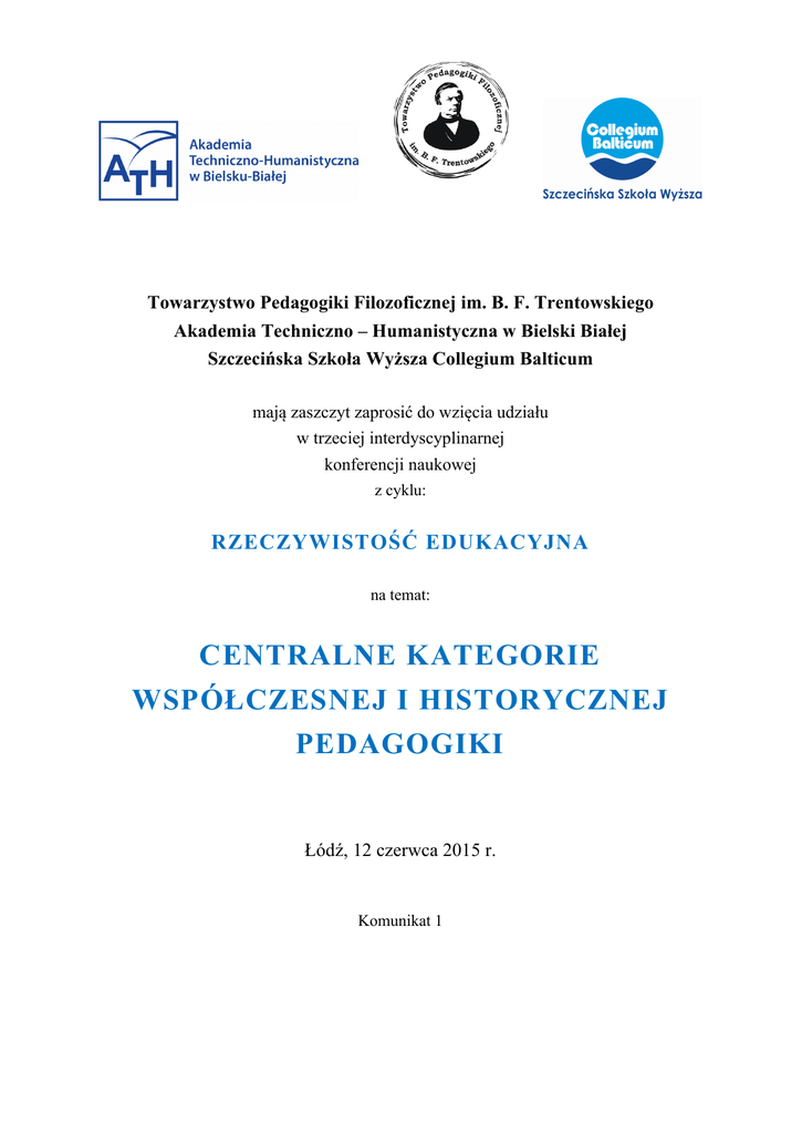 Towarzystwo Pedagogiki Filozoficznej im. B. F. Trentowskiego Akademia Techniczno – Humanistyczna w Bielski Białej Szczecińska Szkoła Wyższa Collegium Balticum mają zaszczyt zaprosić do wzięcia udziału w trzeciej interdyscyplinarnej konferencji naukowej z cyklu: RZECZYWISTOŚĆ EDUKACYJNA na temat: CENTRALNE KATEGORIE WSPÓŁCZESNEJ I HISTORYCZNEJ PEDAGOGIKI Łódź, 12 czerwca 2015 r. Komunikat 1 Projektowane spotkanie naukowe jest kontynuacją prac badawczych prowadzonych w ramach projektu TPF - RZECZYWISTOŚĆ EDUKACYJNA, którego efektem są opublikowane dwa tomy serii pod tym samym tytułem. Pierwszy, wprowadzający w szeroką problematykę współczesnych problemów pedagogiki, jako dyscypliny teoretycznej i praktycznej nosi tytuł Rzeczywistość edukacyjna. Tropy i wątki interpretacyjne (2013). Tom drugi podjął jeden z kluczowych problemów nowoczesnej pedagogiki, ponieważ został poświęcony swobodzie i przymusowi w wychowaniu. Złożoność analizowanej problematyki sugeruje tytuł – Wolność a wychowanie. Problemy, dylematy, kontrowersje (2014). Obecna propozycja wspólnej debaty sięga również do rdzenia refleksji pedagogicznej, która nie może abstrahować od rozpoznania swojego aparatu naukowego, od podstawowych pojęć których treść oraz interpretacja (teoretyczna i praktyczna) ma dalekosiężne konsekwencje. Żadna dyscyplina naukowa nie może zrezygnować z badań podstawowych, jeśli chce zachować intersubiektywny charakter, jeśli pragnie dialogu, który będzie prowadził – w bliższej lub dalszej perspektywie – do konstruktywnych konkluzji. Z tą świadomością potrzeby precyzowania pojęć, którymi posługujemy się na co dzień, zapraszamy do udziału w konferencji specjalistów różnych dyscyplin naukowych (pedagogów, językoznawców, historyków, filozofów, psychologów, socjologów i innych). Wielogłos i różnice interpretacyjne nie powinny stanowić przeszkody w poszukiwaniu wspólnego mianownika łączącego zróżnicowane środowiska i ich rozumienie procesu edukacji. Istotnym składnikiem planowanej konferencji jest podjęcie badań nad względną trwałością i zmiennością pojęć w pedagogice polskiej, europejskiej, światowej. Oznacza to, że chcielibyśmy ukierunkować nasze badania także ku ujęciom problemowym na gruncie historiografii edukacyjnej w opozycji do tradycyjnych, statycznych ujęć idiograficznych po to, aby pro- i retrogresywnie zbadać związki między współczesnym i minionym rozumieniem pojęć oraz ustalić potencjalny kierunek tych przemian. W literaturze pedagogicznej istnieje pewna liczba prac, które definiowały różne kategorie – przykładowo można wskazać na twórczość J. Rutkowiak, T. Hejnickiej-Bezwińskiej, Z. Melosika czy J. Górniewicza. Żywotność tej problematyki jest tym istotniejsza, im bardziej język dzisiejszej nauki skłania się ku zapożyczeniom z języków obcych, redukując lub wręcz rugując nasze tradycje oraz bieżące potrzeby wynikające choćby z codziennej komunikacji pedagogicznej. Czy język naszych badań i narracji ma być zanurzony w metaforach, tropach i neologizmach czy bardziej zależy nam na posługiwaniu się pojęciami o jasnych walorach poznawczych, zdefiniowanych możliwie precyzyjnie i otwierających przestrzeń racjonalnej dyskusji? Poza rozważaniami o charakterze ogólnym, naukoznawczym zachęcamy do dyskusji nad pojęciami, które nie stanowią w naszej propozycji jakiegoś sprecyzowanego rusztowania kategorialnego, natomiast sygnalizują pewną przestrzeń, w której możemy się poruszać, ale i poza nią wykroczyć. Do takich pojęć zaliczamy m.in. edukację, wychowanie, kształcenie, humanizm, kulturę, podmiotowość, wolność, człowieczeństwo, miłość, szczęście, braterstwo, solidaryzm społeczny, charakter, odpowiedzialność, rywalizację, pracę, uczciwość, zaufanie, twórczość, transgresję, dekonstrukcję, telehormizm, integrację, dezintegrację, samodzielność, samorządność, emancypację, tolerancję, selekcję, wyobraźnię, przyjemność, mądrość, piękno, prawdę, dobro, sprawiedliwość, paideię, demokrację, egalitaryzm, neoliberalizm, neopragmatyzm, neokantyzm, pluralizm, dwoistość, dychotomie, aporie i wiele innych. Liczymy na konstruktywne i pogłębione interpretacje podjętych badawczo kategorii, ich strukturalizację i analizę wzajemnych powiązań. Jesteśmy również otwarci na propozycje zagadnień wynikających z własnych zainteresowań i prowadzonych badań naukowych, a pozostających w kontekście tematu konferencji. Sekretarze konferencji: mgr Magdalena Milczarek Dorota Harendarz Przewodniczący konferencji: dr hab. Sławomir Sztobryn, prof. ATH dr Krzysztof Kamiński, SSW CB Komitet naukowy: Prof. dr hab. Irena Adamek Prof. dr hab. Aleksandra Żukrowska Prof. dr hab. Stanisław Gałkowski Dr hab. Jadwiga Lach-Rosocha Dr hab. Marek Bernacki Dr hab. Dariusz Stępkowski Dr hab. Sławomir Sztobryn Dr Krzysztof Zdziarski Terminarz – informacje ogólne Sekretarze konferencji: mgr Magdalena Milczarek [email protected], tel. 505084921 Przewodniczący konferencji: dr hab. Sławomir Sztobryn, prof. ATH dr Krzysztof Kamiński, SSW CB Dorota Harendarz [email protected], tel. 730370520 Miejsce konferencji: Centrum Szkoleniowo Konferencyjne ul. Kopcińskiego 16/18, 90-232 Łódź, tel. (48 42) 635-54-90 Sprawy organizacyjne: 1. Zgłoszenia udziału w konferencji wraz z tytułem wystąpienia podczas konferencji należy przesłać na adres e-mailowy [email protected] do 15 maja 2015 r. (Karta zgłoszenia znajduje się w załączniku). 2. Tekst wystąpienia należy złożyć w formie elektronicznej organizatorom konferencji najpóźniej do 30 czerwca 2015 r.: [email protected] (normy wydawnicze zamieszczamy poniżej). 3. Przewidujemy wpisowe 300 zł, które zostanie przeznaczone na organizację konferencji oraz przygotowanie recenzowanej monografii tematycznej. Wpisowe należy wpłacić na konto TP