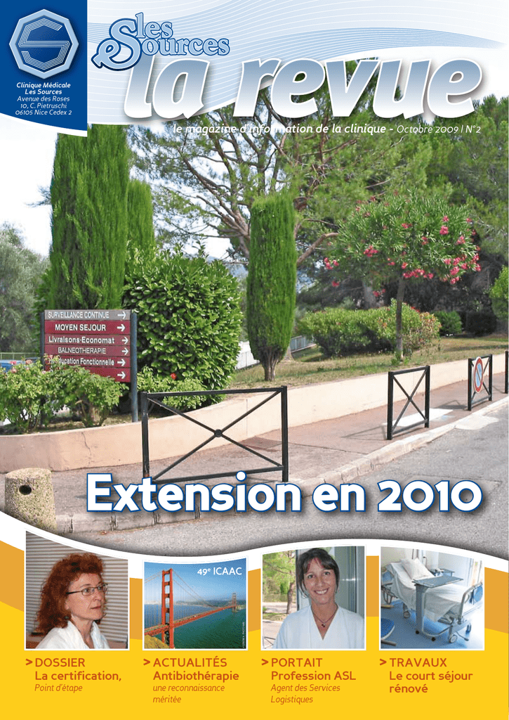 Clinique Médicale Les Sources Avenue des Roses 10, C. Pietruschi 06105 Nice Cedex 2 le magazine d’information de la clinique - Octobre 2009 | N°2 Extension en 2010 © SOBERKA - PHOTOWAY 49e icaac > DOSSIER La certification, Point d’étape > Actualités Antibiothérapie une reconnaissance méritée > Portait Profession ASL Agent des Services Logistiques > Travaux Le court séjour rénové EDITO éditorial par le Dr E.H. Benmansour, directeur général Nous vivons, décidément, une époque complexe où se mélangent crise financière, pré-pandémie grippale, réforme hospitalière, qualité environnementale… C’est donc dans ce contexte riche en événements structurels et conjoncturels que notre Clinique doit évoluer, progresser, se développer pour le plus grand bien de ses malades et des professionnels qui l’animent. Nos préoccupations sont multiples et complémentaires. C’est ainsi que notre Clinique a traversé, avec quelques succès, l’épreuve de la visite de certification dont l’aboutissement formel est prévu pour la fin du mois d’octobre 2009. On peut, d’ores et déjà, penser que nous aurons une certification avec suivi pour le critère relatif aux “Conditions d’administration du médicament au patient garantissant la conformité à la prescription et à la traçabilité de l’acte” et deux recommandations invitant la Clinique à poursuivre sa démarche d’amélioration de la qualité sur les points “Maîtrise des conditions de dispensation des médicaments” et “Prise en charge de la douleur”, critères sur lesquels nous travaillons régulièrement et que nous pensons pouvoir régler avant la fin du 1er trimestre 2010. D’autres projets mobilisent notre énergie et méritent d’être rappelés à l’attention de tous. SOMMAIRE Tout en poursuivant les développements nécessaires de nos activités, Mémoire, Cardio-Gériatrie et Plaies Chroniques, nous travaillons aujourd’hui au lancement de l’Éducation Thérapeutique du Patient (ETP) en partenariat avec l’Institut Régional de Prévention de la Sénescence (IRIPS) et au dépôt d’une demande d’autorisation pour l’ouverture d’un Accueil de Jour pour les personnes atteintes de la Maladie d’Alzheimer ou de troubles apparentés. Je ne saurais trop recommander à tous une grande vigilance et beaucoup de rigueur en matière de prévention et d’hygiène, une solidarité dans la prise en charge de nos malades et, enfin, calme et sérénité en toutes circonstances. C’est à ces conditions que nous pourrons traverser ensemble cette épreuve supplémentaire. Enfin, il nous faudra mettre en œuvre la loi “hôpital, patients, santé et territoires” (loi HPST) qui vise à réorganiser et moderniser le système de santé. Cette réforme a pour but de rénover en profondeur le pilotage des établissements de santé. Elle va engendrer des modifications importantes dans la façon de travailler (nouvelle gouvernance, nouvelles responsabilités médicales et administratives, recomposition de l’offre de soins, coopération sanitaire…). La Clinique n’échappera pas à la règle de la modernisation et à l’application des nouveaux principes de fonctionnement. Analyser, comprendre, anticiper les mutations qui affectent, en particulier, notre champ d’intervention et développer notre stratégie pour mieux nous adapter, voilà nos axes de réflexion et d’action. Ces enjeux auxquels nous sommes confrontés ne peuvent être atteints qu’avec un engagement fort de chacun d’entre nous, une mobilisation de toutes nos compétences, de nos énergies et une adhésion unanime des femmes et des hommes qui font vivre l’Établissement au quotidien. La crise sanitaire annoncée depuis maintenant plusieurs mois et qui semble prendre forme - la pandémie grippale A H1N1 - a fait l’objet d’un travail Les défis à relever sont nombreux. Le succès dépend de nous. Il est à notre portée pour le bien des patients qui nous confient leur santé. 3 | Travaux 12 |Portrait La modernisation en marche 5 |La certification Point d’étape 7 |Qualité et sécurité Le “Paquet Hygiène” 8 |Santé et hygiène de vie Prise en charge nutritionnelle des personnes âgées 10 |Dossier 2 particulièrement lourd qui a mobilisé des médecins, des soignants, des médico-techniques et la Direction, afin de formaliser les procédures et protocoles nécessaires et de construire notre Plan de Continuité de l’Activité (PCA). Logiciel d’antibiothérapie Une reconnaissance méritée Profession, ASL (Agent des Services Logistiques) en bio-nettoyage 14 |Financement Le financement des établissements de santé 15 |Informatique Une priorité, la migration de notre sih 16 |Soins La coordination des soins infirmiers, medico-techniques et de rééducation 19 |Actualité - En bref par le Dr E.H. Benmansour, directeur général Les travaux ont atteint leur rythme de croisière. Prévu initialement pour une durée de trois ans, le programme de rénovation et de modernisation, amorcé depuis 2007, se poursuit de manière globalement satisfaisante, avec des retards limités et des coûts maîtrisés. die d’Alzheimer ou de troubles apparentés, l’amélioration de l’hébergement (création d’un circuit de déambulation, regroupement des lieux de vie et d’activité) et l’amélioration du confort des patients par la création de salles d’activités modulaires. Ce projet a vu, au mois de mai dernier, le Département de Réanimation et Surveillance Continue intégrer son nouvel espace, des locaux entièrement réaménagés au 1er étage du bâtiment A. Un parc de stationnement complétera cette extension avec accessibilité aux personnes à mobilité réduite. Ce bâtiment est maintenant entièrement achevé et regroupe, pour une meilleure fonctionnalité, l’ensemble des Départements de Court Séjour - Médecine gériatrique A2 et A3, Réanimation et Surveillance Continue - et du secteur ambulatoi