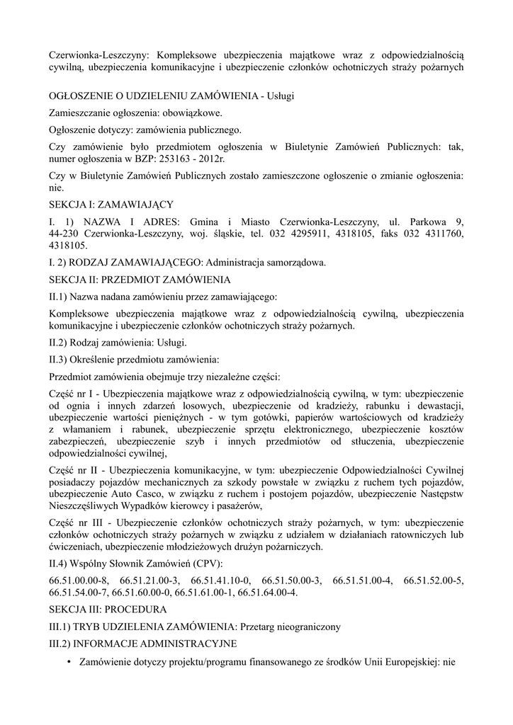 Czerwionka-Leszczyny: Kompleksowe ubezpieczenia majątkowe wraz z odpowiedzialnością cywilną, ubezpieczenia komunikacyjne i ubezpieczenie członków ochotniczych straży pożarnych OGŁOSZENIE O UDZIELENIU ZAMÓWIENIA - Usługi Zamieszczanie ogłoszenia: obowiązkowe. Ogłoszenie dotyczy: zamówienia publicznego. Czy zamówienie było przedmiotem ogłoszenia w Biuletynie Zamówień Publicznych: tak, numer ogłoszenia w BZP: 253163 - 2012r. Czy w Biuletynie Zamówień Publicznych zostało zamieszczone ogłoszenie o zmianie ogłoszenia: nie. SEKCJA I: ZAMAWIAJĄCY I. 1) NAZWA I ADRES: Gmina i Miasto Czerwionka-Leszczyny, ul. Parkowa 9, 44-230 Czerwionka-Leszczyny, woj. śląskie, tel. 032 4295911, 4318105, faks 032 4311760, 4318105. I. 2) RODZAJ ZAMAWIAJĄCEGO: Administracja samorządowa. SEKCJA II: PRZEDMIOT ZAMÓWIENIA II.1) Nazwa nadana zamówieniu przez zamawiającego: Kompleksowe ubezpieczenia majątkowe wraz z odpowiedzialnością cywilną, ubezpieczenia komunikacyjne i ubezpieczenie członków ochotniczych straży pożarnych. II.2) Rodzaj zamówienia: Usługi. II.3) Określenie przedmiotu zamówienia: Przedmiot zamówienia obejmuje trzy niezależne części: Część nr I - Ubezpieczenia majątkowe wraz z odpowiedzialnością cywilną, w tym: ubezpieczenie od ognia i innych zdarzeń losowych, ubezpieczenie od kradzieży, rabunku i dewastacji, ubezpieczenie wartości pieniężnych - w tym gotówki, papierów wartościowych od kradzieży z włamaniem i rabunek, ubezpieczenie sprzętu elektronicznego, ubezpieczenie kosztów zabezpieczeń, ubezpieczenie szyb i innych przedmiotów od stłuczenia, ubezpieczenie odpowiedzialności cywilnej, Część nr II - Ubezpieczenia komunikacyjne, w tym: ubezpieczenie Odpowiedzialności Cywilnej posiadaczy pojazdów mechanicznych za szkody powstałe w związku z ruchem tych pojazdów, ubezpieczenie Auto Casco, w związku z ruchem i postojem pojazdów, ubezpieczenie Następstw Nieszczęśliwych Wypadków kierowcy i pasażerów, Część nr III - Ubezpieczenie członków ochotniczych straży pożarnych, w tym: ubezpieczenie członków ochotniczych straży pożarnych w związku z udziałem w działaniach ratowniczych lub ćwiczeniach, ubezpieczenie młodzieżowych drużyn pożarniczych. II.4) Wspólny Słownik Zamówień (CPV): 66.51.00.00-8, 66.51.21.00-3, 66.51.41.10-0, 66.51.50.00-3, 66.51.54.00-7, 66.51.60.00-0, 66.51.61.00-1, 66.51.64.00-4. 66.51.51.00-4, 66.51.52.00-5, SEKCJA III: PROCEDURA III.1) TRYB UDZIELENIA ZAMÓWIENIA: Przetarg nieograniczony III.2) INFORMACJE ADMINISTRACYJNE • Zamówienie dotyczy projektu/programu finansowanego ze środków Unii Europejskiej: nie SEKCJA IV: UDZIELENIE ZAMÓWIENIA Część NR: 1 Nazwa: Ubezpieczenia majątkowe wraz z odpowiedzialnością cywilną IV.1) DATA UDZIELENIA ZAMÓWIENIA: 21.12.2012. IV.2) LICZBA OTRZYMANYCH OFERT: 1. IV.3) LICZBA ODRZUCONYCH OFERT: 0. IV.4) NAZWA I ADRES WYKONAWCY, KTÓREMU UDZIELONO ZAMÓWIENIA: • InterRisk Towarzystwo Ubezpieczeń S.A. Vienna Insurance Group, ul. Mickiewicza 29, 40-085 Katowice, kraj/woj. śląskie. IV.5) Szacunkowa wartość zamówienia (bez VAT): 481200,00 PLN. IV.6) INFORMACJA O CENIE WYBRANEJ OFERTY ORAZ O OFERTACH Z NAJNIŻSZĄ I NAJWYŻSZĄ CENĄ • Cena wybranej oferty: 397382,00 • Oferta z najniższą ceną: 397382,00 / Oferta z najwyższą ceną: 397382,00 • Waluta: PLN. Część NR: 2 Nazwa: Ubezpieczenia komunikacyjne IV.1) DATA UDZIELENIA ZAMÓWIENIA: 21.12.2012. IV.2) LICZBA OTRZYMANYCH OFERT: 1. IV.3) LICZBA ODRZUCONYCH OFERT: 0. IV.4) NAZWA I ADRES WYKONAWCY, KTÓREMU UDZIELONO ZAMÓWIENIA: • Concordia Polska Towarzystwo Ubezpieczeń Wzajemnych Oddział Śląsko-Małopolski, ul. Mickiewicza 29, 40-923 Katowice, kraj/woj. śląskie. IV.5) Szacunkowa wartość zamówienia (bez VAT): 99840,00 PLN. IV.6) INFORMACJA O CENIE WYBRANEJ OFERTY ORAZ O OFERTACH Z NAJNIŻSZĄ I NAJWYŻSZĄ CENĄ • Cena wybranej oferty: 99506,00 • Oferta z najniższą ceną: 99506,00 / Oferta z najwyższą ceną: 99506,00 • Waluta: PLN. Część NR: 3 Nazwa: Ubezpieczenie członków ochotniczych straży pożarnych IV.1) DATA UDZIELENIA ZAMÓWIENIA: 21.12.2012. IV.2) LICZBA OTRZYMANYCH OFERT: 2. IV.3) LICZBA ODRZUCONYCH OFERT: 0. IV.4) NAZWA I ADRES WYKONAWCY, KTÓREMU UDZIELONO ZAMÓWIENIA: • Concordia Polska Towarzystwo Ubezpieczeń Wzajemnych Oddział Śląsko-Małopolski, ul. Mickiewicza 29, 40-923 Katowice, kraj/woj. śląskie. IV.5) Szacunkowa wartość zamówienia (bez VAT): 55200,00 PLN. IV.6) INFORMACJA O CENIE WYBRANEJ OFERTY ORAZ O OFERTACH Z NAJNIŻSZĄ I NAJWYŻSZĄ CENĄ • Cena wybranej oferty: 45128,00 • Oferta z najniższą ceną: 45128,00 / Oferta z najwyższą ceną: 51024,00 • Waluta: PLN. Niniejsze ogłoszenie o udzieleniu zamówienia zostało zamieszczone w Biuletynie Zamówień Publicznych w dniu 21.12.2012 r.