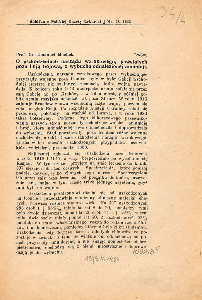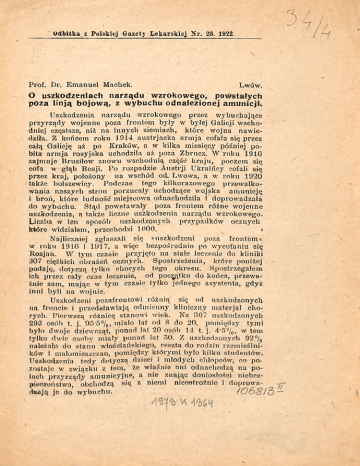 Odbitka z Polskiej Gazety Lekarskiej Nr. 28. 1922. \ Prof. Dr. Emanuel Machek. Lwów. 0 uszkodzeniach narządu wzrokowego, powstałych poza linją bojową, z wybuchu odnalezionej amunicji. Uszkodzenia narządu wzrokowego przez wybuchające przyrządy wojenne poza frontem były w byłej Galicji wscho dniej częstsze, niż na innych ziemiach, które wojna nawie dziła. Z końcem roku 1014 austrjacka armja cofała się przez całą Galicję aż po Kraków, a w kilka miesięcy później po bita armja rosyjska uchodziła aż poza Zbrucz. W roku 1916 zajmuje Brusiłow znowu wschodnią część kraju, poczein się cofa w głąb Rosji. Po rozpadzie Austrji Ukraińcy cofali się przez kraj, położony na wschód od. Lwowa, a w roku 1920 także bolszewicy. Podczas tego kilkorazowego przewałko wania naszych stron porzucały uchodzące wojska amunicję 1 broń, które ludność miejscowa odnachodziła i doprowadzała do wybuchu. Stąd powstawały poza frontem różne wojenne uszkodzenia, a także liczne uszkodzenia narządu wzrokowego. Liczba w ten sposób uszkodzonych przypadków ocznych które widziałem, przechodzi 1000. » Najliczniej zgłaszali się ^uszkodzeni poza frontem« w roku 1916 i 1917, a więc bezpośrednio po wycofaniu się Rosjan. W tym czasie przyjęto na stale leczenie do kliniki 307 ciężkich obrażeń ocznych. Spostrzeżenia, które poniżej podaję, dotyczą tylko chorych tego okresu. Spostrzegałem ich przez cały czas leczenia, od początku clo końca, przewa żnie sam, mając w tym czasie tylko jednego asystenta, gdyż inni byli na wojnie. Uszkodzeni pozafroutowi różnią się od uszkodzonych na froncie i przedstawiają odmienny kliniczny materjal cho rych. Pierwszą różnicę stanowi wiek. Na 807 uszkodzonych 293 osób t. j. 9 mi ał o lat od 8 do 20, pomiędzy tymi było dwoje dziewcząt, ponad lat 20 osób 14 t. j. 4-5°/0, w tern tylko dwie osoby miały ponad lat ó0. Z uszkodzonych 92°/0 należało do stanu włościańskiego, reszta do rodzin rzemieślni ków i małomieszczan, pomiędzy którymi było kilku studentów. Uszkodzenia tedy dotyczą dzieci i młodych chłopców, co po zostaje w związku z tern, że właśnie oni odnachodzą na po lach' przyrządy amunicyjne, a nie znając doniosłości niebez pieczeństwa, obchodzą się z niemi nieostrożnie i doprowa dzają je do wybuchu. 10631 <3 V 2 Mechanizm uszkodzeń jest również inny, niż na fron cie. Cechą jego jest wybuch w pobliżu. Wpływa na to na przód rodzaj odnalezionych przyrządów wybuchowych. Do nicli należą miedziane kapsle i różne inne przyrządy (zundery), które mają n. p. miny do wybuchu doprowadzić, na boje rewolwerowe i często porzucane patrony karabinowe, dalej krótkie patrony, kcóremi się nabija miny, i znowu wię ksze pudełka z wybuchową masą, najczęściej z metalową mosiężną obwódką, używane do wysadzania mostów, zasieków i okopów (armja niemiecka); czasem odńachodzono już po dłożone miny, których uchodzące wojska do wybuchu nie do prowadziły. Rzadziej były przyczyną uszkodzeń odnalezione bomby, szrapnele i granaty ręczne. Składu przyrządów wy buchowych nie mogliśmy we wszystkich przypadkach z po trzebną dla celów naszych dokładnością stwierdzić. Byłoby pożądanem wiedzieć dokładnie, z jakiego metalu wyrabia się łuski nabojów, płaszcze granatów i szrapneli, jaki jest skład materyj wybuchowych, jakie ich domieszki, gdyż cząstki tych ciał dostają się do oka. Przedmioty amunicyjne wybuchały zbliska, najczęściej w ręku, odrywały palce, kaleczyły ręce i oczy, które były właśnie ’ zwrócone na przedmiot wybuchający. Najczęściej uszkadzały wybuchy patronów karabinowych, których łuski, zdaniem chłopców, przydatne są na cygarnice, byle je uwol nić od zawartości, podobnej do gliny. Często chłopcy przed mioty wybuchowe wrzucali w piec lub ogień, śledząc oczami co się stanie. Uszkodzenia od granatów ręcznych i szrapneli już były podobniejsze do frontowych. Odłamki tych pocisków, tak jak na polu walki, uszkadzały oczy już z pewnej odległości, o-dyż bliżej stojących »bijały. W jednym przypadku granat ręczny wrzucony w ogień zabił 6 chłopców, piekących kar tofle, siódmy, którego wysłano po wodę, znajdował się jeszcze o 15 kroków od ogniska. On opowiedział przebieg wypadku. Było to ostatnie zdarzenie, które widział, stracił bowiem oba oczy. I)© cech pozafrontowych uszkodzeń wojennych należą w dalszym ciągu: 1. Wielorakość uszkodzeń. Jest ich w ka żdym przypadku większa ilość, n. p. liczne ciała obce na twarzy, rany powiek, często różnorakie uszkodzenia oczu. Wszystkich rozpoznań, licząc tylko ich jakość, a nie ilość, było'u naszych 307 chorych — 2.120, a więc 7 na jednego. U jednego z naszych chorych, uszkodzonego na twarzy i obu oczach. °było 12 uszkodzeń, z których każde wymagało kli nicznego leczenia. 2. Stosunkowo często zdarzają się uszkodzenia°obu oczów i obustronne skaleczenia dodatkowych czę- 3 iści narządu wzrokowego. Stwierdzono to u 150 z naszych chorych, co czyni blisko 50°j0. Z innych uszkodzeń najczęst sze były uszkodzenia rąk, piersi, twarzy i głowy. 3. Gwał towność i wielka siła, z którą działały wybuchy. Tego do wodzi zmiażdżenie oka w 4 przypadkach, rozległe rozerwa nie rogówki i twardówki w 10 przypadkach, większe szcze liny powiekowe 14 razy, rany na twarzy i powiekach w 3O°/0 ; kilka razy przebił}' ciała obce powieki i ugrzęzły w oku lub oczodole. Zdarzały się także przypadki, że ciała obce prze bił}'. gałkę oczna na wylot. Za gwałtownością uszkodzeń prze mawia także spostrzeżenie, że na 12G oczów, których ściany przebiły ciała obce, w 49 niebyło poczucia światła, w 47 złe poczucie z brakami w polu widzenia. W wykazach skaleczeń wojennych przez ciała obce, tylko wyjątkowo wspominają autorzy o badaniu poczucia światła, którego wyniki mają tak wielkie znaczenie w r