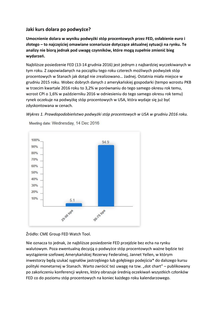 Jaki kurs dolara po podwyżce? Umocnienie dolara w wyniku podwyżki stóp procentowych przez FED, osłabienie euro i złotego – to najczęściej omawiane scenariusze dotyczące aktualnej sytuacji na rynku. Te analizy nie biorą jednak pod uwagę czynników, które mogą zupełnie zmienić bieg wydarzeń. Najbliższe posiedzenie FED (13-14 grudnia 2016) jest jednym z najbardziej wyczekiwanych w tym roku. Z zapowiadanych na początku tego roku czterech możliwych podwyżek stóp procentowych w Stanach jak dotąd nie zrealizowano… żadnej. Ostatnia miała miejsce w grudniu 2015 roku. Wobec dobrych danych z amerykańskiej gospodarki (tempo wzrostu PKB w trzecim kwartale 2016 roku to 3,2% w porównaniu do tego samego okresu rok temu, wzrost CPI o 1,6% w październiku 2016 w odniesieniu do tego samego okresu rok temu) rynek oczekuje na podwyżkę stóp procentowych w USA, która wydaje się już być zdyskontowana w cenach. Wykres 1. Prawdopodobieństwo podwyżki stóp procentowych w USA w grudniu 2016 roku. Źródło: CME Group FED Watch Tool. Nie oznacza to jednak, że najbliższe posiedzenie FED przejdzie bez echa na rynku walutowym. Poza ewentualną decyzją o podwyżce stóp procentowych ważne będzie też wystąpienie szefowej Amerykańskiej Rezerwy Federalnej, Jannet Yellen, w którym inwestorzy będą szukać sygnałów jastrzębiego lub gołębiego podejścia* do dalszego kursu polityki monetarnej w Stanach. Warto zwrócić też uwagę na tzw. „dot chart” – publikowany po zakończeniu konferencji wykres, który obrazuje średnią oczekiwań wszystkich członków FED co do poziomu stóp procentowych na koniec każdego roku kalendarzowego. *Jastrzębie podejście do polityki monetarnej – reprezentują je zwolennicy agresywnych działań, których celem jest zwalczanie inflacji, w tym podnoszenia stóp procentowych. Gołębie nastawienie u przedstawiciela banku centralnego oznacza chęć prowadzenia łagodnej polityki monetarnej, nastawionej na równomierną stymulację wzrostu gospodarczego; odznacza się niechęcią do podnoszenia stóp procentowych. Ważne sygnały z rynku obligacji Wiele z pojawiających się obecnie w mediach scenariuszy zakłada umocnienie dolara w wyniku antycypowanej grudniowej podwyżki stóp procentowych w USA. Już w ubiegłym miesiącu kurs tej waluty osiągnął poziom nienotowany od 14 lat; w ciągu ostatnich trzech miesięcy dolar znacząco umocnił się też w stosunku do innych walut – o 15% w stosunku do jena japońskiego, o 7,5% do euro (patrz Wykres 2). Wykres 2. Zmiany indeksu dolara w stosunku do indeksu euro i jena japońskiego w ciągu ostatnich trzech miesięcy (stan na 12.12.2016 r.). Źródło: Stooq.pl Oznaczałoby to napływ kapitału do USA i dalsze umocnienie tamtejszej waluty. Zapowiadane przez Donalda Trumpa na 2017 rok cięcie podatków, które ma zwiększyć tempo wzrostu gospodarczego oraz inflację, może stać się dla FED motorem do wprowadzenia kolejnych podwyżek stóp procentowych. Te z kolei są kluczowe dla wyceny obligacji. Informacje z rynku długu są o tyle istotne, że często pojawiają się tam sygnały znaczących zmian na rynku walutowym. Wyższa rentowność obligacji skłania inwestorów do inwestowania w amerykańskie aktywa kosztem, m.in. krajów EM, do których należy Polska. Inwestowanie w obligacje wiąże się również z zakupem waluty, czego konsekwencją jest aprecjacja, w tym przypadku dolara. Patrząc na rentowność obligacji wśród krajów rozwiniętych, inwestycja w amerykańskie papiery dłużne wydaje się najatrakcyjniejsza. Wykres 3. Wykres dochodu z 10-letnich obligacji w poszczególnych krajach. Źródło: Investing.com Z powyższego wykresu jednoznacznie widać różnicę pomiędzy rentownością amerykańskiego długu, a rentownościami krajów rozwiniętych takich jak Niemcy, Japonia czy Szwajcaria. Dolar będzie silniejszy? To nie takie pewne.. Co jeśli w wyniku zmian fiskalnych i podwyżek stóp procentowych rentowność amerykańskich obligacji będzie rosnąć w szybkim tempie i osiągnie poziom np. 3%? O odpowiedź na to pytanie pokusili się analitycy Saxo Banku w jednej z prognoz na 2017 rok. Jak sami zaznaczają, kreślone przez nich scenariusze mogą wydawać się nieprawdopodobne, jednak niejednokrotnie mogliśmy się już przekonać, że rynek finansowy potrafi zaskakiwać. Zadaniem FED jest zachowanie złotego środka (tzw. Goldilocks principle) w podejściu do polityki monetarnej. Żadne skrajności w sytuacji gospodarczej i finansowej kraju nie są zatem pożądane. Eksperci Saxo Banku opisali scenariusz, w którym po wzroście rentowności amerykańskich obligacji do 3% (spowodowanym podwyżkami stóp procentowych) FED bierze sobie za cel obniżenie tej cyfry do 1,5%, co skutkuje wprowadzeniem programu luzowania ilościowego (quantitative easing, QE), czyli skupu państwowych aktywów. Obecnie w wyniku takich działań obserwujemy silne osłabienie euro (po tym, jak w ubiegłym tygodniu Europejski Bank Centralny ogłosił przedłużenie programu QE do marca 2017 roku). Co mogłoby nastąpić po wprowadzeniu wyżej wymienionych kroków przez FED? Zatrzymanie wyprzedaży na globalnych rynkach akcji i obligacji, a także wzrost wartości instrumentów finansowych w gospodarkach rozwijających się, czyli m.in. w Polsce. Wydaje się zatem, że prawdopodobne jest umocnienie dolara w grudniu 2016 roku, jednak nowy rok może przynieść w tym zakresie znaczące zmiany. Wymień dolara teraz>> Silny dolar a gospodarka USA FED musi też wziąć pod uwagę, że dalsze umocnienie dolara może negatywnie wpłynąć na gospodarkę – w bilansie handlowym USA widoczna jest znacząca nierównowaga między importem a eksportem: Wykres 4. Bilans handlowy USA w odniesieniu do największych potęg gospodarczych. Źródło: Eurostat. Wysoki kurs dolara może hamować eksport i zwiększać ilość towarów importowanych do kraju. Kiedy w 2015 mieliśmy do czynienia ze znaczącym wzr