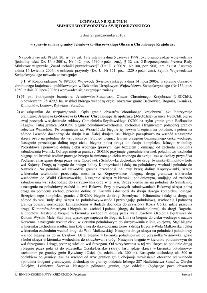 UCHWAŁA NR XLII/762/10 SEJMIKU WOJEWÓDZTWA ŚWIĘTOKRZYSKIEGO z dnia 25 października 2010 r. w sprawie zmiany granicy Jeleniowsko-Staszowskiego Obszaru Chronionego Krajobrazu Na podstawie art. 18 pkt. 20, art. 89 ust. 1 i 2 ustawy z dnia 5 czerwca 1998 roku o samorządzie województwa (jednolity tekst Dz. U. z 2001r., Nr 142, poz. 1590 z późn. zm.), § 32 ust. 3 Rozporządzenia Prezesa Rady Ministrów w sprawie „Zasad techniki prawodawczej” (Dz. U. z 2002r., Nr 100, poz. 908), art. 23 ust. 2 ustawy z dnia 16 kwietnia 2004r. o ochronie przyrody (Dz. U. Nr 151, poz. 1220 z późn. zm.), Sejmik Województwa Świętokrzyskiego uchwala co następuje: § 1. W Rozporządzeniu Nr 89/2005 Wojewody Świętokrzyskiego z dnia 14 lipca 2005r. w sprawie obszarów chronionego krajobrazu opublikowanym w Dzienniku Urzędowym Województwa Świętokrzyskiego (Nr 156, poz. 1950, z dnia 20 lipca 2005r.) wprowadza się następujące zmiany: 1) §1 pkt 9 otrzymuje brzmienie: Jeleniowsko-Staszowski Obszar Chronionego Krajobrazu (J-SOChK), o powierzchni 28 429,8 ha, w skład którego wchodzą części obszarów gmin: Baćkowice, Bogoria, Iwaniska, Klimontów, Łoniów, Rytwiany, Staszów, 2) w załączniku do rozporządzenia „Opis granic obszarów chronionego krajobrazu” pkt 9 otrzymuje brzmienie: Jeleniowsko-Staszowski Obszar Chronionego Krajobrazu (J-SOChK) Granica J-SOChK bierze swój początek w sąsiedztwie enklawy Chmielnicko-Szydłowskiego OChK na styku granic gmin Baćkowice i Łagów. Tutaj granica J-SOChK biegnie południowo-zachodnią, zachodnią i fragmentem północnej granicy sołectwa Wszachów. Po osiągnięciu rz. Wszachówki biegnie jej lewym brzegiem na południe, a potem na północ i wschód dochodząc do skraju lasu. Dalej skrajem lasu biegnie początkowo na wschód a następnie skręca ostro na południe do wsi Janczyce i Stobiec biegnąc lewym brzegiem bezimiennego cieku wodnego. Następnie przecinając dolinę tego cieku biegnie polną drogą do skraju kompleksu leśnego w okolicy Podzaldowa i ponownie doliną cieku wodnego (prawym jego brzegiem ) omijając od zachodu i południa zabudowania Iwanisk. Od tego miejsca granica J-SOChK przyjmuje generalnie kierunek południowo-wschodni biegnąc od Iwanisk wzdłuż prawego brzegu bezimiennego cieku wodnego do skraju lasu w okolicy przysiółka Podlesie, a następnie drogą przez wsie Oporówek i Schabówka dochodząc do drogi Iwaniska-Klimontów koło wsi Kujawy. Drogą tą biegnie do brzegu doliny Koprzywianki i dalej na południowy wschód i południe do Nawodzic. Na południe od Nawodzic granica przechodzi na lewy brzeg doliny Koprzywianki, skręca w kierunku wschodnim przecinając most na rz. Koprzywiance i biegnąc drogą gruntową w kierunku wschodnim do Wólki Gieraszowskiej. Następnie skręca w kierunku południowym, omijając od zachodu zabudowania wsi i dochodząc do skrzyżowania dróg w tej wsi. Drogą kieruje się na południe do Sulisławic, a następnie na południowy zachód ku wsi Bukowa. Przy pierwszych zabudowaniach Bukowej skręca polną drogą na północny zachód, przecina dolinę rz. Kacanki i dochodzi do skraju dużego kompleksu leśnego. Brzegiem tego kompleksu granica J-SOChK biegnie do drogi Smerdyna – Klimontów i dalej tą drogą na północ do wsi Budy skąd skręca na południowy-wschód i przebiegając południową, wschodnią i północną granicą obszaru górniczego kamieniołomu w Budach dochodzi do przysiółka Kozia Górka, gdzie przecina drogę Klimontów-Smerdyna i biegnie na zachód i północ (drogą do kamieniołomu) do drogi BogoriaKlimontów. Następnie biegnie w kierunku zachodnim drogą przez wsie Józefów i Kolonia Pęcławska do Kolonii Wysoki Małe. Stąd linią wysokiego napięcia do Bogorii. Linią tą biegnie do cieku wodnego o nazwie Korzenna, a następnie wzdłuż cieku w kierunku południowym do skrzyżowania z linią kolejową. Stąd biegnie w kierunku zachodnim wzdłuż linii kolejowej do skrzyżowania torów z drogą Bogoria-Wola Małkowska i dalej w kierunku zachodnim wzdłuż drogi do Woli Małkowskiej. Następnie drogą skręca na południe i południowy wschód biegnąc aż do m. Czajków. Dalej biegnie w kierunku południowym do przysiółka Wiśniówka, gdzie z kolei skręca w kierunku wschodnim do skrzyżowania dróg. Następnie biegnie w kierunku południowym do wsi Strzegomek i drogą przez tę wieś do wsi Strzegom. Od skrzyżowania w tej wsi skręca na południe drogą i biegnie przez pola aż do przysiółka Ossala-Lesisko i skraju lasu, gdzie skręca w kierunku południowozachodnim po granicy gmin Rytwiany i Osiek (na odcinku ok. 300 m). Następnie odchodząc ok. 500 m odcinkiem po granicy lasu na wschód od w/w granicy gmin obejmuje wzniesienie otoczone od wschodu i południa drogami gruntowymi, dochodząc do granicy oddziału leśnego 287 Nadleśnictwa Staszów, Obrębu Golejów, Leśnictwa Szczeka. Następnie północną granicą tego oddziału (będącego poza obszarem Id: BNNED-ZBGEO-HJYJY-KJIIZ-CNZDQ. Podpisany Strona 1 chronionym) oraz południowymi granicami oddziałów leśnych 278 i 281 do granicy lasu. Następnie biegnie w kierunku północno-zachodnim po granicy kompleksu leśnego aż do przysiółka Pniaki koło Rytwian; stąd drogą gruntową do przysiółka Poręby i nasypu linii kolejowej do punktu, gdzie przecina linię kolejową na Suchowolę. Stąd biegnie drogą gruntową przez przysiółek Glinki do cieku wodnego bez nazwy wzdłuż tego cieku, koło wsi Bródki przecinając drogę ze Staszowa w kierunku Wiśniowej dochodzi do torów kolejowych. Dalej wzdłuż torów kolejowych do mostu w ciągu drogi Staszów-Bogoria; następnie wzdłuż cieku wodnego do mostu na drodze Staszów-Raków. Tą drogą biegnie na północny zachód do skraju kompleksu leśnego położonego na południe od wsi Wola Osowa i dalej wzdłuż granicy lasu do styku granicy gmin Raków, Szydłów i Bogoria. Stąd granicami gmin Raków i Bogoria, Raków i Iwaniska