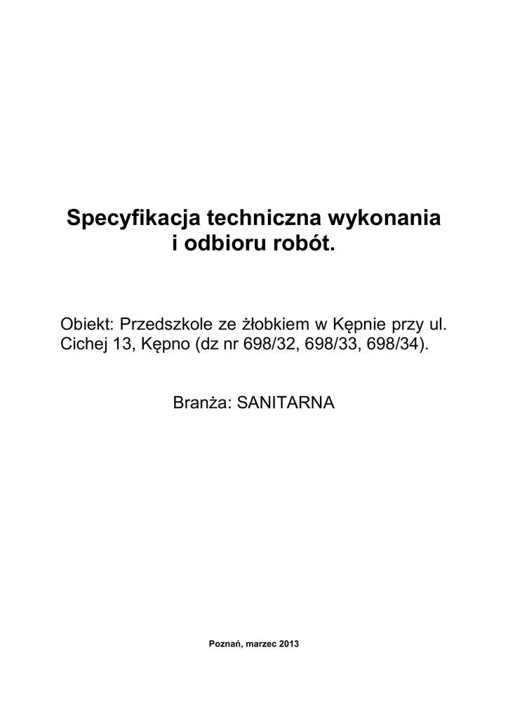 Specyfikacja techniczna wykonania i odbioru robót. Obiekt: Przedszkole ze żłobkiem w Kępnie przy ul. Cichej 13, Kępno (dz nr 698/32, 698/33, 698/34). Branża: SANITARNA Poznań, marzec 2013 SPIS TREŚCI 1. CZESC OGÓLNA 2. MATERIAŁY 3. SPRZET 4. TRANSPORT 5. WYKONANIE ROBÓT 6. KONTROLA JAKOSCI ROBÓT ,BADANIA ORAZ ODBIÓR WYROBÓW I ROBÓT 7. WYMAGANIA DOTYCZACE PRZEDMIARU I OBMIARU ROBÓT 8. PRZEJECIE ROBÓT 9. PRZEPISY 10. UWAGI KONCOWE 1. CZESC OGÓLNA 1.1. PRZEDMIOT Przedmiotem niniejszej Specyfikacji Technicznej są wymagania techniczne dotyczące wykonania i odbioru robót instalacyjnych związanych z budową nowoprojektowanego obiektu użyteczności publicznej o funkcji przedszkola i żłobka z dodatkową częścią gastronomiczną. 1.2. ZAKRES STOSOWANIA Specyfikacja Techniczna jest stosowana jako dokument przetargowy lub/i kontraktowy przy zleceniu i realizacji Robót wymienionych w punkcie 1.3. 1.3. ZAKRES ROBÓT OBJETYCH Ustalenia zawarte w niniejszej specyfikacji dotyczą prowadzenia i odbioru robót przy wykonywaniu przedmiot inwestycji i obejmują: a) wewnętrzną instalacje wody zimnej i ciepłej wody użytkowej oraz cyrkulacji ciepłej wody użytkowej, b) wewnętrzną i zewnętrzną instalacje kanalizacji sanitarnej, c) wewnętrzną i zewnętrzną instalacje kanalizacji deszczowej, d) wewnętrzną instalacje ogrzewania (c.o. + c.t.), e) wewnętrzną instalację wentylacji mechanicznej i chłodzenia f) wewnętrzna i zewnętrzną instalację gazową 1.4. PRZEDMIOT ZAMÓWIENIA Według Wspólnego Słownika Zamówień (CPV). 45331200-8 Instalowanie urządzeń wentylacyjnych i klimatyzacyjnych 45331100-7 Instalowanie centralnego ogrzewania 45331210-1 Instalowanie wentylacji 45331230-7 Instalowanie urządzeń chłodniczych 45331000-6 Instalowanie urządzeń grzewczych, wentylacyjnych i klimatyzacyjnych 45330000-9 Roboty instalacyjne wodno – kanalizacyjne i sanitarne 45332200-5 Hydraulika, 45332400-7 Roboty instalacyjne w zakresie sprzętu sanitarnego, 45231220-3 Roboty budowlano w zakresie gazociągów 45231000-5 Roboty budowlane w zakresie budowy rurociągów, komunikacyjnych i linii energetycznych 45231100-6 Ogólne roboty związane z budową rurociągów 45231110-9 Roboty budowlane w zakresie kłądzenia rurociągów ciągów 1.5 OKRESLENIA PODSTAWOWE Określenia podane w Specyfikacji Technicznej zgodne są z odpowiednimi określeniami podanymi w opracowaniu pt. „Ogólne specyfikacje techniczne wykonania i odbioru robót tom II- Wymagania ogólne" oraz PN. 1.6 OGÓLNE WYMAGANIA DOTYCZACE ROBÓT Wykonawca jest odpowiedzialny za wykonanie robót zgodnie z dokumentacją projektową, specyfikacją techniczną, poleceniami nadzoru inwestorskiego i autorskiego, zgodnie z art.22, 23 i 28 ustawy Prawo Budowlane. 2. MATERIAŁY Do realizacji mogą, być stosowane wyroby producentów krajowych i zagranicznych posiadające aprobaty techniczne wymagane przez odpowiednie Instytuty Badawcze. Wszystkie materiały stosowane przy wykonaniu robót powinny: a) być nowe i nieużywane, b) być w gatunku bieżąco produkowanym, c) odpowiadać wymaganiom norm i przepisów wymienionych w niniejszych Specyfikacjach i na rysunkach oraz innych nie wymienionych, ale obowiązujących norm i przepisów, d) mieć wymagane polskimi przepisami świadectwa dopuszczenia do obrotu oraz wymagane Ustawą z dnia 3 kwietnia 1993 r. certyfikaty bezpieczeństwa. Przed użyciem materiałów do budowy Wykonawca przedstawi Zamawiającemu wszelkie wymagane przez niego dokumenty na udowodnienie powyższego. Przy wykonywaniu robót według niniejszej specyfikacji zastosowanie maja: 2.1. DO BUDOWY INSTALACJI WODOCIAGOWEJ (WODY ZIMNEJ I CIEPLEJ WODY UŻYTKOWEJ, CYRKULACJI C.W.U.) Wszystkie materiały stykające się bezpośrednio z woda musza posiadać atest PZH i aprobaty techniczne. Powinny odpowiadać normom przedmiotowym. Instalacje ciepłej wody wykonać z materiałów przystosowanych do pracy w zakresach temperatur odpowiadających zakresom temperatur wody. Armatura i urządzenia wbudowane w instalacje nie powinny wywoływać uderzeń wodnych, powodujących chwilowy wzrost ciśnienia przekraczającego ciśnienie próbne instalacji. Armatura: Zawory kulowe odcinające, Zawory kulowe ze złączką do węża Zaworu zwrotne antyskażeniowe Zawory odpowietrzające Zawory spustowe Zawory bezpieczeństwa przystosowany do instalacji ciepłej wody użytkowej Zawory regulacyjno pomiarowe do napełniania zasobnika cwu Termometr Manometr Baterie umywalkowe stojące/ścienne Baterie zlewozymywakowe stojące/ ścienne Baterie natryskowe ścienne Zawory termostatyczne do regulacji cyrkulacji CWU z nastawą wstępną, funkcją odcięcia oraz króćcem odwadniającym z termometrem Termostatyczny zawór mieszający trójdrogowy do ciepłej wody użytkowej o zakresie regulacji 20 - 40°C. Końcowe baterie przy przyborach w węzłach sanitarnych z dostępem dzieci przystosowane do obsługi wody zmieszanej. − umywalkowe – 16 szt. − natryskowe – 4 szt. W części gastronomicznej baterie dla zlewozmywaków i umywalek muszą być wyposażone w fotokomórkę (wymagane doprowadzenie zasilania elektrycznego) lub typu lekarskiego – zgodnie z projektem technicznym wykonania kuchni. Urządzenia: - Wodomierz objętościowy o pomiarze przepływu wody zimnej V=~2,1 dm3/s - Filtr na przyłączu wody - Zasobnik ciepłej wody użytkowej o pojemności 1000 dm3 wyposażony w dodatkową grzałkę elektryczną do podgrzewu wody. - Pompa cyrkulacyjna (o parametrach V=0,1m3/h; H=5,0m), - Naczynie wyrównawcze typu zamkniętego – zabezpieczające instalacje cwu - Stacja uzdatniania wody kotłowej do mocy Q=500kW - Stacja uzdatniania wody dla potrzeb technologii kuchni (do urządzeń w kuchni) umożliwiająca uzyskanie parametrów wody 0°dH Urządzenia w części kuchennej zgodnie z projektem technicznym wykonania kuchni: - Piec konwekcyjno – parowy 1 szt - Zmywarka kapturowa 1szt - Zmywarka do naczyń na podstawie 1szt - Obieraczka war