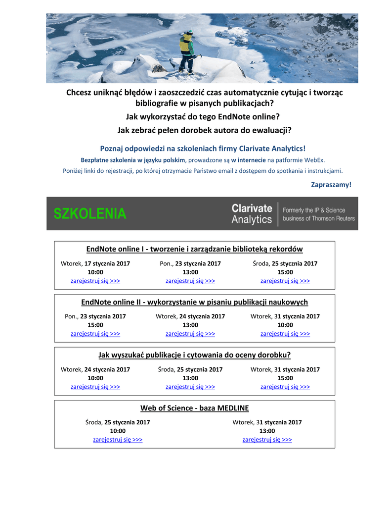 Chcesz uniknąć błędów i zaoszczedzić czas automatycznie cytując i tworząc bibliografie w pisanych publikacjach? Jak wykorzystać do tego EndNote online? Jak zebrać pełen dorobek autora do ewaluacji? Poznaj odpowiedzi na szkoleniach firmy Clarivate Analytics! Bezpłatne szkolenia w języku polskim, prowadzone są w internecie na patformie WebEx. Poniżej linki do rejestracji, po której otrzymacie Państwo email z dostępem do spotkania i instrukcjami. Zapraszamy! EndNote online I - tworzenie i zarządzanie biblioteką rekordów Wtorek, 17 stycznia 2017 10:00 zarejestruj się >>> Pon., 23 stycznia 2017 13:00 zarejestruj się >>> Środa, 25 stycznia 2017 15:00 zarejestruj się >>> EndNote online II - wykorzystanie w pisaniu publikacji naukowych Pon., 23 stycznia 2017 15:00 zarejestruj się >>> Wtorek, 24 stycznia 2017 13:00 zarejestruj się >>> Wtorek, 31 stycznia 2017 10:00 zarejestruj się >>> Jak wyszukać publikacje i cytowania do oceny dorobku? Wtorek, 24 stycznia 2017 10:00 zarejestruj się >>> Środa, 25 stycznia 2017 13:00 zarejestruj się >>> Wtorek, 31 stycznia 2017 15:00 zarejestruj się >>> Web of Science - baza MEDLINE Środa, 25 stycznia 2017 10:00 zarejestruj się >>> Wtorek, 31 stycznia 2017 13:00 zarejestruj się >>>
