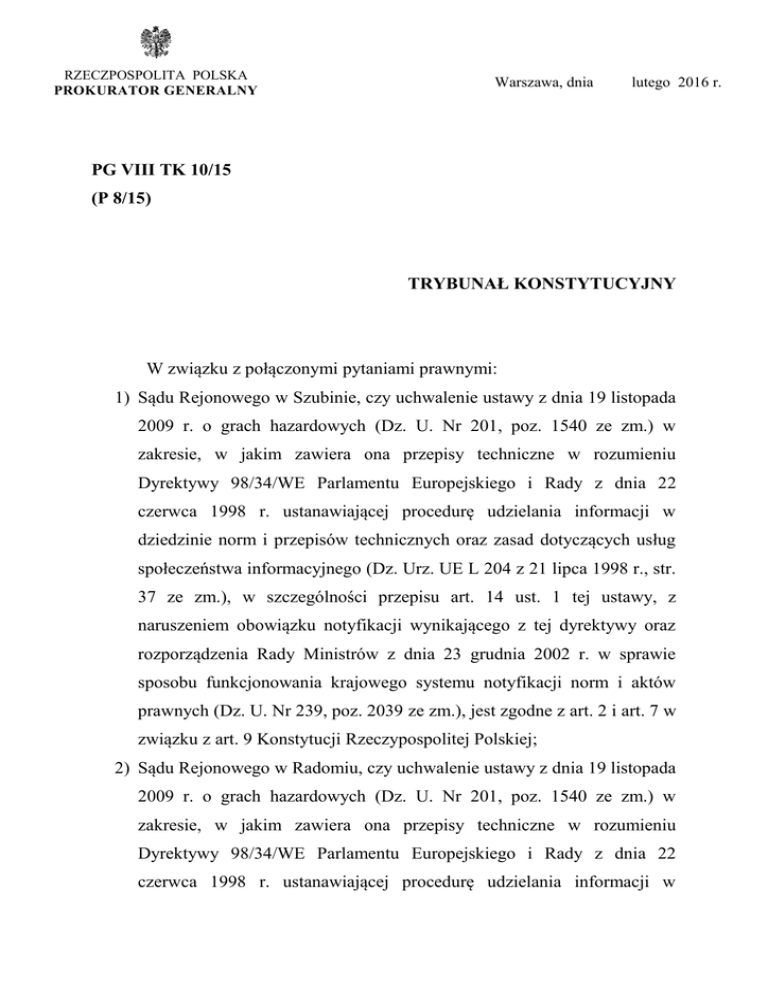 RZECZPOSPOLITA POLSKA PROKURATOR GENERALNY Warszawa, dnia lutego 2016 r. PG VIII TK 10/15 (P 8/15) TRYBUNAŁ KONSTYTUCYJNY W związku z połączonymi pytaniami prawnymi: 1) Sądu Rejonowego w Szubinie, czy uchwalenie ustawy z dnia 19 listopada 2009 r. o grach hazardowych (Dz. U. Nr 201, poz. 1540 ze zm.) w zakresie, w jakim zawiera ona przepisy techniczne w rozumieniu Dyrektywy 98/34/WE Parlamentu Europejskiego i Rady z dnia 22 czerwca 1998 r. ustanawiającej procedurę udzielania informacji w dziedzinie norm i przepisów technicznych oraz zasad dotyczących usług społeczeństwa informacyjnego (Dz. Urz. UE L 204 z 21 lipca 1998 r., str. 37 ze zm.), w szczególności przepisu art. 14 ust. 1 tej ustawy, z naruszeniem obowiązku notyfikacji wynikającego z tej dyrektywy oraz rozporządzenia Rady Ministrów z dnia 23 grudnia 2002 r. w sprawie sposobu funkcjonowania krajowego systemu notyfikacji norm i aktów prawnych (Dz. U. Nr 239, poz. 2039 ze zm.), jest zgodne z art. 2 i art. 7 w związku z art. 9 Konstytucji Rzeczypospolitej Polskiej; 2) Sądu Rejonowego w Radomiu, czy uchwalenie ustawy z dnia 19 listopada 2009 r. o grach hazardowych (Dz. U. Nr 201, poz. 1540 ze zm.) w zakresie, w jakim zawiera ona przepisy techniczne w rozumieniu Dyrektywy 98/34/WE Parlamentu Europejskiego i Rady z dnia 22 czerwca 1998 r. ustanawiającej procedurę udzielania informacji w 2 dziedzinie norm i przepisów technicznych oraz zasad dotyczących usług społeczeństwa informacyjnego (Dz. Urz. UE L 204 z 21 lipca 1998 r., str. 37 ze zm.), w szczególności przepisu art. 14 ust. 1 tej ustawy, z naruszeniem obowiązku notyfikacji wynikającego z tej dyrektywy oraz rozporządzenia Rady Ministrów z dnia 23 grudnia 2002 r. w sprawie sposobu funkcjonowania krajowego systemu notyfikacji norm i aktów prawnych (Dz. U. Nr 239, poz. 2039 ze zm.), jest zgodne z art. 2 i art. 7 w związku z art. 9 Konstytucji Rzeczypospolitej Polskiej; 3) Sądu Rejonowego w Mińsku Mazowieckim, czy uchwalenie ustawy z dnia 19 listopada 2009 r. o grach hazardowych (Dz. U. Nr 201, poz. 1540 ze zm.) w zakresie, w jakim zawiera ona przepisy techniczne w rozumieniu Dyrektywy 98/34/WE Parlamentu Europejskiego i Rady z dnia 22 czerwca 1998 r. ustanawiającej procedurę udzielania informacji w dziedzinie norm i przepisów technicznych oraz zasad dotyczących usług społeczeństwa informacyjnego (Dz. Urz. UE L 204 z 21 lipca 1998 r., str. 37 ze zm.), w szczególności przepisu art. 6 ust. 1 tej ustawy, z naruszeniem obowiązku notyfikacji wynikającego z tej dyrektywy oraz rozporządzenia Rady Ministrów z dnia 23 grudnia 2002 r. w sprawie sposobu funkcjonowania krajowego systemu notyfikacji norm i aktów prawnych (Dz. U. Nr 239, poz. 2039 ze zm.), jest zgodne z art. 2 i art. 7 w związku z art. 9 Konstytucji Rzeczypospolitej Polskiej – na podstawie art. 56 pkt 5 w związku z art. 82 ust. 1 ustawy z dnia 25 czerwca 2015 r. o Trybunale Konstytucyjnym (Dz. U. poz. 1064 ze zm.) przedstawiam następujące stanowisko: postępowanie podlega umorzeniu na podstawie art. 39 ust. 1 pkt 1 ustawy z dnia 1 sierpnia 1997 r. o Trybunale Konstytucyjnym (Dz. U. Nr 102, poz. 3 643 ze zm.) w związku z art. 134 pkt 3 ustawy z dnia 25 czerwca 2015 r. o Trybunale Konstytucyjnym (Dz. U. poz. 1064 ze zm.). UZASADNIENIE W niniejszej sprawie pytania prawne Sądów Rejonowych: w Szubinie, w Radomiu i w Mińsku Mazowieckim zostały skierowane w związku z rozpoznawanymi przez te Sądy (dalej: Sądy pytające) spraw osób oskarżonych o przestępstwa skarbowe z art. 107 § 1 ustawy z dnia 10 września 1999 roku – Kodeks karny skarbowy (Dz.U. z 2013 r., poz. 186 ze zm.; dalej: K.k.s.), polegające na urządzaniu i prowadzeniu gier na automatach poza kasynami gry, wbrew przepisom ustawy z dnia 19 listopada 2009 r. o grach hazardowych (obecnie tekst jednolity: Dz. U. z 2015 r., poz. 612 ze zm.; dalej: ustawa o grach hazardowych lub u.g.h.). Rozpoznając te sprawy, Sądy pytające powzięły wątpliwość, czy uchwalenie ustawy o grach hazardowych w zakresie, w jakim zawiera ona przepisy techniczne w rozumieniu Dyrektywy 98/34/WE Parlamentu Europejskiego i Rady z dnia 22 czerwca 1998 r. ustanawiającej procedurę udzielania informacji w dziedzinie norm i przepisów technicznych oraz zasad dotyczących usług społeczeństwa informacyjnego (Dz. Urz. UE L 204 z 21 lipca 1998 r., str. 37 ze zm., dalej: Dyrektywa 98/34/WE), w szczególności przepisu art. 6 ust. 1 (pytanie prawne Sądu Rejonowego w Mińsku Mazowieckim), art. 14 ust. 1 (pytanie prawne Sądu Rejonowego w Radomiu) oraz art. 14 tej ustawy (pytanie prawne Sądu Rejonowego w Szubinie), z naruszeniem obowiązku notyfikacji wynikającego z tej dyrektywy oraz rozporządzenia Rady Ministrów z dnia 23 grudnia 2002 r. w sprawie sposobu funkcjonowania krajowego systemu notyfikacji norm i aktów prawnych (Dz. U. Nr 239, poz. 2039 ze zm.; dalej: rozporządzenie w sprawie notyfikacji), jest zgodne z art. 2 i art. 7 w zw. z 4 art. 9 Konstytucji Rzeczypospolitej Polskiej, z uwagi na naruszenie konstytucyjnego trybu ustawodawczego. Podkreślić przy tym trzeba, że z uzasadnienia pytań prawnych Sądu Rejonowego w Szubinie wynika, że w istocie Sąd ten kwestionuje konstytucyjność przepisu art. 14 ust. 1 u.g.h. Sądy pytające podniosły m.in., że ustawa o grach hazardowych zawiera przepisy techniczne w rozumieniu Dyrektywy 98/34/WE i rozporządzenia w sprawie notyfikacji. W ocenie Sądu Rejonowego w Mińsku Mazowieckim, przepisem takim w szczególności jest art. 6 ust. 1, zaś według Sądów Rejonowych w Szubinie i Radomiu – art. 14 ust. 1 tej ustawy. W związku z tym ustawa o grach hazardowych podlegała obowiązkowi notyfikacji Komisji Europejskiej. Tymczasem bezsporne jest, iż została ona uchwalona bez dochowania tego wymogu. Sądy pytające zwróciły uwagę, że z przepisów art. 2, art. 7 i art. 9 Konstytucji wynika, iż proces uchwalania każdej ustawy powinien być przeprowadzony w zgodzie zarówno z przepisa