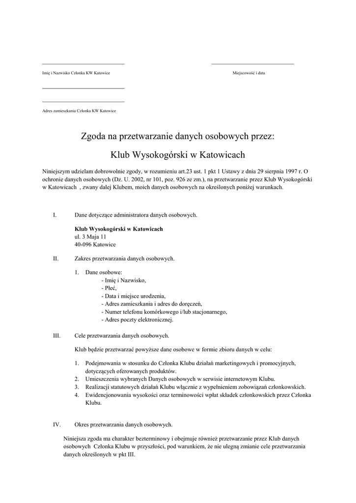 _________________________ _________________________ Imię i Nazwisko Członka KW Katowice Miejscowość i data _________________________ _________________________ Adres zamieszkania Członka KW Katowice Zgoda na przetwarzanie danych osobowych przez: Klub Wysokogórski w Katowicach Niniejszym udzielam dobrowolnie zgody, w rozumieniu art.23 ust. 1 pkt 1 Ustawy z dnia 29 sierpnia 1997 r. O ochronie danych osobowych (Dz. U. 2002, nr 101, poz. 926 ze zm.), na przetwarzanie przez Klub Wysokogórski w Katowicach , zwany dalej Klubem, moich danych osobowych na określonych poniżej warunkach. I. Dane dotyczące administratora danych osobowych. Klub Wysokogórski w Katowicach ul. 3 Maja 11 40-096 Katowice II. Zakres przetwarzania danych osobowych. 1. III. Dane osobowe: - Imię i Nazwisko, - Płeć, - Data i miejsce urodzenia, - Adres zamieszkania i adres do doręczeń, - Numer telefonu komórkowego i/lub stacjonarnego, - Adres poczty elektronicznej. Cele przetwarzania danych osobowych. Klub będzie przetwarzać powyższe dane osobowe w formie zbioru danych w celu: 1. 2. 3. 4. IV. Podejmowania w stosunku do Członka Klubu działań marketingowych i promocyjnych, dotyczących oferowanych produktów. Umieszczenia wybranych Danych osobowych w serwisie internetowym Klubu. Realizacji statutowych działań Klubu włącznie z wypełnieniem zobowiązań członkowskich. Ewidencjonowania wysokości oraz terminowości wpłat składek członkowskich przez Członka Klubu. Okres przetwarzania danych osobowych. Niniejsza zgoda ma charakter bezterminowy i obejmuje również przetwarzanie przez Klub danych osobowych Członka Klubu w przyszłości, pod warunkiem, że nie ulegną zmianie cele przetwarzania danych określonych w pkt III. V. Przekazywanie danych osobowych osobom trzecim. Dane osobowe Członka Klubu będą traktowane jako ściśle poufne i nie będą udostępnione osobom trzecim bez zgody Członka Klubu, chyba że przepisy prawa powszechnie obowiązującego będą stanowić inaczej. Klub zobowiązuje się do zabezpieczenia danych osobowych Członka klubu poprzez zastosowanie odpowiednich środków technicznych i organizacyjnych przewidzianych w Ustawie z dnia 29 sierpnia 1997 r. O ochronie danych osobowych (Dz. U. 2002, nr 10, poz.926 ze zm.). VI. Prawa Członka Klubu związane z przetwarzaniem jego danych osobowych. Członkowi Klubu przysługuje prawo kontroli przetwarzanych danych, które jego dotyczą, a zwłaszcza prawo do: 1. 2. 3. 4. 5. 6. 7. 8. Uzyskania wyczerpujących informacji, czy jego dane są włączone do zbioru danych i jaka jest nazwa tego zbioru oraz do ustalenia administratora danych, adresu jego siedziby i pełnej nazwy, Uzyskania informacji o celu, zakresie i sposobie przetwarzania danych zawartych w zbiorze, Uzyskania informacji, od kiedy przetwarza się w zbiorze dane jego dotyczące oraz podania w powszechnej zrozumiałej formie treści tych danych, Uzyskania informacji o źródle, z którego pochodzą dane jego dotyczące, Uzyskania informacji o sposobie udostępnienia danych, w szczególności informacji o odbiorcach lub kategoriach odbiorców, którym te dane są udostępniane, Żądania niezwłocznego uzupełnienia, uaktualnienia, sprostowania danych osobowych, czasowego lub stałego wstrzymania ich przetwarzania lub ich usunięcia, jeżeli są one niekompletne, nieaktualne, nieprawdziwe lub zostały zebrane z naruszeniem prawa, albo są już zbędne do realizacji celu, dla którego zostały zebrane, Żądania niezwłocznego zaprzestania przetwarzania jego danych osobowych w określonym celu, Żądania niezwłocznego usunięcia jego danych osobowych za zbioru prowadzonego przez Klub. Członek Klubu może skorzystać z prawa do informacji, o której mowa w powyższych pkt 1-5, nie częściej niż raz na 6 miesięcy. Klub zastrzega sobie termin 30 dni na spełnienie obowiązków informacyjnych, określonych w powyższych pkt1-5. Na pisemny wniosek Członka Klubu, Klub udzieli informacji na piśmie. _________________________ __________________________ podpis Członka Klubu podpis członka Zarządu KW Katowice potwierdzający osobiste złożenie podpisu przez Członka Klubu w jego obecności