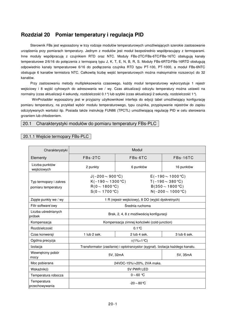 Rozdział 20 Pomiar temperatury i regulacja PID Sterownik FBs jest wyposażony w trzy rodzaje modułów temperaturowych umożliwiających szerokie zastosowanie urządzenia przy pomiarach temperatury. Jednym z modułów jest moduł bezpośrednio współpracujący z termoparami. Inne moduły współpracują z czujnikiem RTD oraz NTC. Moduły FBs-2TC/FBs-6TC/FBs-16TC obsługują kanały temperaturowe 2/6/16 do połączenia z termoparą typu J, K, T, E, N, B, R, S. Moduły FBs-6RTD/FBs-16RTD obsługują odpowiednio kanały temperaturowe 6/16 do podłączenia czujnika RTD typu PT-100, PT-1000, a moduł FBs-6NTC obsługuje 6 kanałów termistora NTC. Całkowitą liczbę wejść temperaturowych można maksymalnie rozszerzyć do 32 kanałów. Przy zastosowaniu metody multipleksowania czasowego, każdy moduł temperaturowy wykorzystuje 1 rejestr wejściowy i 8 wyjść cyfrowych do adresowania we / wy. Czas aktualizacji odczytu temperatury można ustawić na normalny (czas aktualizacji 4 sekundy, rozdzielczość 0.1°) lub szybki (czas aktualizacji 2 sekundy, rozdzielczość 1°). WinProladder wyposażony jest w przyjazny użytkownikowi interfejs do edycji tabel umożliwiający konfigurację pomiaru temperatury, na przykład wybór modułu temperaturowego, typu czujnika, przypisywanie rejestrów do zapisu odczytywanych wartości itp. Posiada także instrukcję FUN86 (TPCTL) umożliwiającą regulację PID w celu sterowania grzaniem lub chłodzeniem. 20.1 Charakterystyki modułów do pomiaru temperatury FBs-PLC 20.1.1 Wejście termopary FBs-PLC Moduł Charakterystyki Elementy Liczba punktów wejściowych Typ termopary i zakres pomiaru temperatury F Bs - 2T C F Bs - 6T C F Bs - 1 6T C 2 punkty 6 punktów 16 punktów ~ ~ ~ ~ ~ ~ J ( − 20 0 90 0°C) K( − 1 9 0 1 3 00 °C) R( 0 18 0 0°C) S( 0 1 70 0 °C) ~ ~ Zajęte punkty we / wy E( − 1 90 1 00 0 °C) T ( − 1 90 3 80 °C) B( 3 5 0 1 8 00 °C) N( − 2 00 1 00 0 °C) 1 R (rejestr wejściowy), 8 DO (wyjść dyskretnych) Filtr software’owy Średnia ruchoma Liczba uśrednianych próbek Brak, 2, 4, 8 z możliwością konfiguracji Kompensacja Kompensacja zimnej końcówki (cold-junction) Rozdzielczość 0.1°C Czas konwersji 1 lub 2 sek. 2 lub 4 sek. Ogólna precyzja Izolacja Wewnętrzny pobór mocy Moc pobierana 3 lub 6 sek. ±(1%+1°C) Transformator (zasilanie) i optotranzystor (sygnał). Izolacja każdego kanału. 5V, 32mA 5V, 35mA 24VDC-15%/+20%, 2VA maks. Wskaźnik(i) 5V PWR LED ~60 °C -20~80°C 0 Temperatura robocza Temperatura przechowywania 20-1 Wymiary 40(S)x90(W)x80(G) mm 90(S) x90(W) x80(G) mm 20.1.2 Wejście RTD FBs-PLC Moduł Charakterystyki Elementy F Bs - 6RT D Liczba punktów wejściowych F Bs - 1 6RT D 6 punktów 16 punktów 3-przewodowy czujnik RTD JIS(α=0.00392) lub DIN(α=0.00385) Pt-100(−200 850°C) ~ ~600°C) Typ RTD i zakres pomiaru temperatury Pt-1000(−200 Zajęte punkty we / wy 1 R (rejestr wejściowy), 8 DO (wyjść dyskretnych) Filtr software’owy Średnia ruchoma Liczba uśrednianych próbek Brak, 2, 4, 8 z możliwością konfiguracji 0. 1 °C Rozdzielczość Czas konwersji 1 lub 2 sek. 2 lub 4 sek. ±1% Ogólna precyzja Izolacja Transformator (zasilanie) i optotranzystor (sygnał). Izolacja każdego kanału. Wewnętrzny pobór mocy 5V, 35mA Moc pobierana 5V, 35mA 24VDC-15%/+20%, 2VA maks. Wskaźnik(i) 5V PWR LED ~60 °C -20~80°C 0 Temperatura robocza Temperatura przechowywania Wymiary 40(W)x90(H)x80(D) mm 90(W) x90(H) x80(D)mm 20.1.3 Wejściowy moduł temperaturowy NTC Moduł Element Charakterystyki FBs-6NTC Punkty wejściowe 6 punktów Typ czujnika Zajęte punkty we / wy 2k, 5k, 10k, 20kΩ (przy 25 ℃) czujnik NTC 1 R (rejestr wejściowy), 8 DO (wyjść dyskretnych) Filtr software’owy Średnia ruchoma Liczba uśrednianych próbek 1, 2, 4, 8, 16 z możliwością konfiguracji Rozdzielczość 0.1°C Czas konwersji 1 lub 2 sek. Ogólna precyzja Izolacja ±1% Transformator (zasilanie) i optotranzystor (sygnał) Wewnętrzny pobór mocy 5V, 35mA Moc pobierana 24VDC-15%/+20%, 2VA Wskaźnik(i) 5V PWR LED 20-2 ~60 °C -20~80°C 0 Temperatura robocza Temperatura przechowywania Wymiary 20.2 90(S) x90(W) x80(G)mm Procedura stosowania modułu temperaturowego FBs 20.2.1 Procedura pomiaru temperatury Start Podłączyć szeregowo moduły do interfejsu rozszerzeń w ------- PLC oraz podłączyć zewnętrzne źródło 24VDC i przewody czujników do pomiaru temperatury. Szczegóły dotyczące ustawień i połączeń opisane są w rozdziale 20.6. Uruchomić WinProladder, skonfigurować adres konfiguracji tabeli, rejestru temperaturowego i rejestru - - - - - - - Patrz rozdział 20.3 roboczego w oknach konfiguracji temperatury. Umożliwi to odczyt temperatury bezpośrednio do rejestru. Koniec 20.2.2 Sterowanie temperaturą PID w zamkniętej pętli Start Podłączyć szeregowo moduły do interfejsu rozszerzeń w ------- PLC oraz podłączyć zewnętrzne źródło 24VDC i wejściowe przewody do pomiaru temperatury. Szczegóły dotyczące ustawień i połączeń opisane są w rozdziale 20.6. Za pomocą odpowiedniej instrukcji sterowania temperaturą PID (FUN86) skonfigurować tabelę tak, aby uzyskać aktualną wartość temperatury i stworzyć z niej tak zwaną zmienną procesową (PV). Po obliczeniu wyrażenia PID nastąpi odpowiedź na błąd poprzez wysłanie wyjściowego - - - - - - - Szczegóły w opisie FUN86 i przykładzie programu. sygnału zgodnego z nastawą, wartością błędu i szybkością zmiany zmiennej procesowej. Z uwagi na pracę w zamkniętej pętli można oczekiwać stabilnego stanu procesu. Koniec 20-3 20.3 Procedury konfiguracji pomiaru temperatury Kliknąć „I/O Configuration” w oknie Project Windows: Project name System Configuration I/O Configuration 1. Wybrać opcję „Temp. Configuration” ﹝Starting Address of Configuration Table﹞: Przypisanie początkowego adresu rejestrów do zapisu tabeli konfiguracji temperatury. Możliwe są następujące wpisy: a. Spacja (Brak tabeli konfiguracji tempera