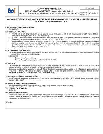 KI -74-105 KARTA INFORMACYJNA URZĄD MIASTA SIEDLCE, Skwer Niepodległości 2 Strona:1 BIURO OBSŁUGI INTERESANTA tel. 25 794 3767, 25 794 3709 Stron: 1 Wydanie: 12 WYDANIE ZEZWOLENIA NA ZAJĘCIE PASA DROGOWEGO ULICY W CELU UMIESZCZENIA W PASIE DROGOWYM REKLAMY I. JEDNOSTKA ODPOWIEDZIALNA: Wydział Dróg II. PODSTAWA PRAWNA: Art. 19 ust. 5, art. 20 pkt 8,art. 39 ust. 3 i art. 40 ust. 2 pkt 3, ust. 3, ust. 6, ust. 15 ustawy z dnia 21 marca 1985 r. drogach publicznych ( Dz. U. z 2016, poz.1440), § 2 ust. 1 rozporządzenia Rady Ministrów z dnia 1 czerwca 2004 r. w sprawie określenia warunków udzielania zezwoleń na zajęcie pasa drogowego (Dz. U. z 2016 r., poz.1264), Uchwała Rady Miasta Siedlce z dnia 23 maja 2014 r. Nr XLII/760/2014 w sprawie ustalenia wysokości stawek opłat za zajęcie pasa drogowego dla dróg publicznych położonych w granicach Miasta Siedlce, których zarządcą jest Prezydent Miasta Siedlce na cele nie związane z budową, przebudową, remontem, utrzymaniem i ochroną dróg. (Dz. Urz. Woj. Mazow. z 2014, poz.7176) III. WYMAGANE DOKUMENTY: 1.Wniosek zawierający miejsce ustawienia reklamy (nazwa ulicy, okres ustawienia reklamy, wymiary reklamy, pełna nazwa firmy lub dane wnioskodawcy), 2.Załączniki: • Załącznik graficzny reklamy. • Szczegółowy plan sytuacyjny w skali 1:500 lub 1:1000. IV. OPŁATY: Za zajęcie pasa drogowego zostanie naliczona opłata zgodnie z art.40 ustawy z dnia 21 marca 1985 r. o drogach publicznych (Dz. U. z 2015, poz.460 z późn.zm),po złożeniu wniosku. Naliczona opłata płatna gotówką w kasach Biura Obsługi Interesanta, stanowiska nr 1 i 2 pracują: poniedziałek w godz.7.45 – 17.30, od wtorku do piątku w godz.7.45 – 15.00 lub przelewem na konto Urzędu Miasta Siedlce ING Bank Śląski S.A. 28 1050 1894 1000 0022 1545 6456 V. MIEJSCE ZŁOŻENIA DOKUMENTÓW: Biuro Obsługi Interesanta, stanowisko nr 5 pracuje: poniedziałek w godz.7.45 – 18.00, wtorek, środa, czwartek, piątek w godz.7.45 – 15.45 VI. SPOSÓB ZAŁATWIENIA SPRAWY: Decyzja zezwalająca na zajęcie pasa drogowego ulicy w celu umieszczenia reklamy. VII. TERMIN ZAŁATWIENIA: Do 30 dni VIII. TRYB ODWOŁAWCZY: Odwołanie wnosi się do Samorządowego Kolegium Odwoławczego w Siedlcach, za pośrednictwem Prezydenta Miasta Siedlce w terminie 14 dni od dnia doręczenia decyzji stronie. Odwołanie można składać w Biurze Obsługi Interesanta, stanowisko nr 5. UWAGI: