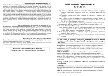 Cyryl Jerozolimski, Katechezy chrzcielne 13,1 Chlubą dla Kościoła katolickiego jest cała działalność Chrystusa, ale chlubą nad chlubami jest krzyŜ. W uznaniu tego mówi Paweł: „Co do mnie, niech Bóg mnie uchowa, bym się miał chlubić z czego innego, jak tylko z KrzyŜa Chrystusa” (Ga 6,14). Podziwu było godne, Ŝe jeden ślepy od urodzenia odzyskał wzrok w sadzawce Siloe (J 9,7); ale czym to jest wobec ślepych całego świata! Czymś wielkim i ponad naturę było to, Ŝe Łazarz, który juŜ cztery dni leŜał w grobie, powstał z martwych (J 11,39nn), lecz ta łaska objawiła się tylko nad nim samym; czymŜe to jest wobec tych, którzy na świecie umierają w swoich grzechach! Był to cud, Ŝe pięć chlebów wystarczyło dla nakarmienia pięciu tysięcy ludzi (Mt 14,21); czymŜe to jest jednak wobec tych, którzy na całym świecie cierpią głód z braku wiedzy! Podziw budziło uwolnienie kobiety osiemnaście lat dręczonej przez szatana (Łk 13,11-13), ale czymŜe to jest wobec nas wszystkich związanych łańcuchami grzechów? Chwała KrzyŜa ślepym na duchu przyniosła światło, uwolniła wszystkich przytłoczonych grzechem, zbawiła całą ludzkość. XVIII Niedziela Zwykła w roku A: Mt 14,13-21 13. 14. 15. 16. 17. Hieronim, Komentarz do Ewangelii św. Mateusza 2,14,14 W opowiadaniu Ewangelii zawsze z literą związany jest duch i to, co na pierwszy rzut oka wydaje się zimne, skoro tylko dotkniesz, zobaczysz, jak pali. Pan był na pustyni, szły za Nim tłumy, porzucając swoje miasta, to jest swoje stare przyzwyczajenia i róŜnorodne poglądy. Wyszedł Jezus, to znaczy, Ŝe tłumy miały wprawdzie chęć, aby pójść za Nim, ale nie miały sił, aby dojść. Dlatego Pan wyszedł z miejsca, na którym się znajdował, i wyszedł im naprzeciw, jak w innej przypowieści o synu pokutującym. A ujrzawszy tłumy, zlitował się nad nimi i uleczył ich choroby, aby pełna wiara otrzymała natychmiast nagrodę. Nerses Šnorhali, Jezus - Syn jedyny Ojca 486-487 Z pięciu tylko chlebów miałeś taki nadmiar, Ŝe (nakarmiłeś nimi) pięć tysięcy osób. I znowu czterema chlebami nakarmiłeś ich w sercu pustyni. A ja jestem wygłodzony, spragniony Twego Boskiego chleba anielskiego. Racz więc mnie Nim nakarmić, bo zstąpił z nieba i jest On nieśmiertelny. 18. 19. 20. 21. Gdy Jezus to usłyszał, oddalił się stamtąd w łodzi na miejsce pustynne, osobno. Lecz tłumy zwiedziały się o tym i z miast poszły za Nim pieszo. Gdy wysiadł, ujrzał wielki tłum. Zlitował się nad nimi i uzdrowił ich chorych. A gdy nastał wieczór, przystąpili do Niego uczniowie i rzekli: Miejsce to jest puste i pora juŜ spóźniona. KaŜ więc rozejść się tłumom: niech idą do wsi i zakupią sobie Ŝywności! Lecz Jezus im odpowiedział: Nie potrzebują odchodzić; wy dajcie im jeść! Odpowiedzieli Mu: Nie mamy tu nic prócz pięciu chlebów i dwóch ryb. On rzekł: Przynieście Mi je tutaj! Kazał tłumom usiąść na trawie, następnie wziąwszy pięć chlebów i dwie ryby, spojrzał w niebo, odmówił błogosławieństwo i połamawszy chleby dał je uczniom, uczniowie zaś tłumom. Jedli wszyscy do sytości, i zebrano z tego, co pozostało, dwanaście pełnych koszy ułomków. Tych zaś, którzy jedli, było około pięciu tysięcy męŜczyzn, nie licząc kobiet i dzieci. 13. Gdy Jezus to usłyszał, oddalił się stamtąd w łodzi na miejsce pustynne, osobno. Lecz tłumy zwiedziały się o tym i z miast poszły za Nim pieszo. Mt 10,23 Gdy was prześladować będą w tym mieście, uciekajcie do innego. Zaprawdę, Stronice te zawierają Słowa Pisma Świętego. Dlatego powinny być uczczone i godnie traktowane! powiadam wam: Nie zdąŜycie obejść miast Izraela, nim przyjdzie Syn Człowieczy. Mt 12,15 Gdy się Jezus dowiedział o tym, oddalił się stamtąd. A wielu poszło za Nim i uzdrowił ich wszystkich. Mk 6,30-32-33 Wtedy Apostołowie zebrali się u Jezusa i opowiedzieli Mu wszystko, co zdziałali i czego nauczali. A On rzekł do nich: «Pójdźcie wy sami osobno na miejsce pustynne i wypocznijcie nieco!». Tak wielu bowiem przychodziło i odchodziło, Ŝe nawet na posiłek nie mieli czasu. Odpłynęli więc łodzią na miejsce pustynne, osobno. Lecz widziano ich odpływających. Wielu zauwaŜyło to i zbiegli się tam pieszo ze wszystkich miast, a nawet ich uprzedzili. 14. Gdy wysiadł, ujrzał wielki tłum. Zlitował się nad nimi i uzdrowił ich chorych. Mt 15,32 Lecz Jezus przywołał swoich uczniów i rzekł: «śal Mi tego tłumu! JuŜ trzy dni trwają przy Mnie, a nie mają co jeść. Nie chcę ich puścić zgłodniałych, Ŝeby kto nie zasłabł w drodze». Mk 6,34 Gdy Jezus wysiadł, ujrzał wielki tłum. Zlitował się nad nimi, byli bowiem jak owce nie mające pasterza. I zaczął ich nauczać. £k 7,13-15 Na jej widok Pan uŜalił się nad nią i rzekł do niej: «Nie płacz!» Potem przystąpił, dotknął się mar - a ci, którzy je nieśli, stanęli - i rzekł: Młodzieńcze, tobie mówię wstań! Zmarły usiadł i zaczął mówić; i oddał go jego matce. £k 19,41-44 Gdy był juŜ blisko, na widok miasta zapłakał nad nim i rzekł: O gdybyś i ty poznało w ten dzień to, co słuŜy pokojowi. Ale teraz zostało to zakryte przed twoimi oczami. Bo przyjdą na ciebie dni, gdy twoi nieprzyjaciele otoczą cię wałem, oblegną cię i ścisną zewsząd. Powalą na ziemię ciebie i twoje dzieci z tobą i nie zostawią w tobie kamienia na kamieniu za to, Ŝeś nie rozpoznało czasu twojego nawiedzenia. J11,33-35 Gdy więc Jezus ujrzał jak płakała ona i śydzi, którzy razem z nią przyszli, wzruszył się w duchu, rozrzewnił i zapytał: «Gdzieście go połoŜyli?» Odpowiedzieli Mu: «Panie, chodź i zobacz!». Jezus zapłakał. Hbr 2,17 Dlatego musiał się upodobnić pod kaŜdym względem do braci, aby stał się miłosiernym i wiernym arcykapłanem wobec Boga dla przebłagania za grzechy ludu. Hbr 4,15 Nie takiego bowiem mamy arcykapłana, kt