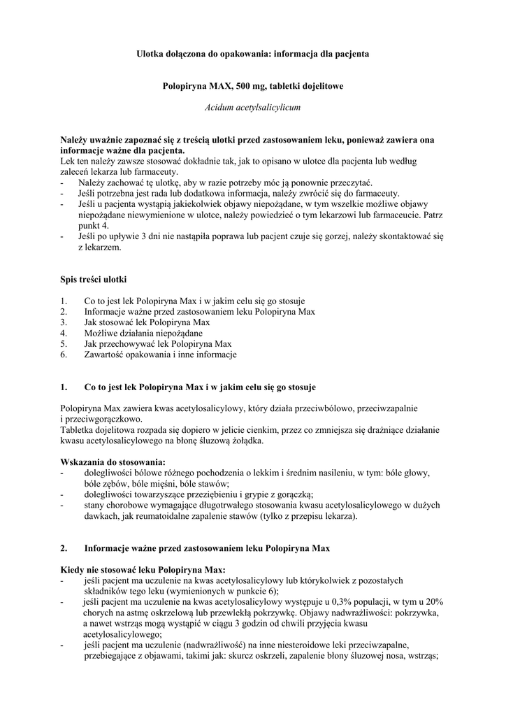 Ulotka dołączona do opakowania: informacja dla pacjenta Polopiryna MAX, 500 mg, tabletki dojelitowe Acidum acetylsalicylicum Należy uważnie zapoznać się z treścią ulotki przed zastosowaniem leku, ponieważ zawiera ona informacje ważne dla pacjenta. Lek ten należy zawsze stosować dokładnie tak, jak to opisano w ulotce dla pacjenta lub według zaleceń lekarza lub farmaceuty. Należy zachować tę ulotkę, aby w razie potrzeby móc ją ponownie przeczytać. Jeśli potrzebna jest rada lub dodatkowa informacja, należy zwrócić się do farmaceuty. Jeśli u pacjenta wystąpią jakiekolwiek objawy niepożądane, w tym wszelkie możliwe objawy niepożądane niewymienione w ulotce, należy powiedzieć o tym lekarzowi lub farmaceucie. Patrz punkt 4. Jeśli po upływie 3 dni nie nastąpiła poprawa lub pacjent czuje się gorzej, należy skontaktować się z lekarzem. Spis treści ulotki 1. 2. 3. 4. 5. 6. Co to jest lek Polopiryna Max i w jakim celu się go stosuje Informacje ważne przed zastosowaniem leku Polopiryna Max Jak stosować lek Polopiryna Max Możliwe działania niepożądane Jak przechowywać lek Polopiryna Max Zawartość opakowania i inne informacje 1. Co to jest lek Polopiryna Max i w jakim celu się go stosuje Polopiryna Max zawiera kwas acetylosalicylowy, który działa przeciwbólowo, przeciwzapalnie i przeciwgorączkowo. Tabletka dojelitowa rozpada się dopiero w jelicie cienkim, przez co zmniejsza się drażniące działanie kwasu acetylosalicylowego na błonę śluzową żołądka. Wskazania do stosowania: dolegliwości bólowe różnego pochodzenia o lekkim i średnim nasileniu, w tym: bóle głowy, bóle zębów, bóle mięśni, bóle stawów; dolegliwości towarzyszące przeziębieniu i grypie z gorączką; stany chorobowe wymagające długotrwałego stosowania kwasu acetylosalicylowego w dużych dawkach, jak reumatoidalne zapalenie stawów (tylko z przepisu lekarza). 2. Informacje ważne przed zastosowaniem leku Polopiryna Max Kiedy nie stosować leku Polopiryna Max: jeśli pacjent ma uczulenie na kwas acetylosalicylowy lub którykolwiek z pozostałych składników tego leku (wymienionych w punkcie 6); jeśli pacjent ma uczulenie na kwas acetylosalicylowy występuje u 0,3% populacji, w tym u 20% chorych na astmę oskrzelową lub przewlekłą pokrzywkę. Objawy nadwrażliwości: pokrzywka, a nawet wstrząs mogą wystąpić w ciągu 3 godzin od chwili przyjęcia kwasu acetylosalicylowego; jeśli pacjent ma uczulenie (nadwrażliwość) na inne niesteroidowe leki przeciwzapalne, przebiegające z objawami, takimi jak: skurcz oskrzeli, zapalenie błony śluzowej nosa, wstrząs; - - - jeśli pacjent ma astmę oskrzelową, przewlekłe schorzenia układu oddechowego, gorączkę sienną lub obrzęk błony śluzowej nosa, gdyż pacjenci z tymi schorzeniami mogą reagować na niesteroidowe leki przeciwzapalne napadami astmy, ograniczonym obrzękiem skóry i błony śluzowej (obrzęk naczynioruchowy) lub pokrzywką częściej niż inni pacjenci; jeśli pacjent ma czynną chorobę wrzodową żołądka i (lub) dwunastnicy oraz stany zapalne lub krwawienia z przewodu pokarmowego (może dojść do wystąpienia krwawienia z przewodu pokarmowego lub uczynnienia choroby wrzodowej); jeśli pacjent ma ciężką niewydolność wątroby, nerek lub serca; jeśli pacjent ma zaburzenia krzepnięcia krwi (np. hemofilia, małopłytkowość) oraz - gdy pacjent jest leczony jednocześnie środkami przeciwzakrzepowymi (np. pochodne kumaryny, heparyna); jeśli pacjent ma niedobór dehydrogenazy glukozo-6-fosforanowej (rzadka choroba dziedziczna); jeśli pacjent jednocześnie otrzymuje metotreksat w dawkach 15 mg na tydzień lub większych, ze względu na szkodliwy wpływ na szpik kostny; u dzieci w wieku poniżej 16 lat; jeśli pacjentka jest w trzecim trymestrze ciąży lub karmi piersią. Ostrzeżenia i środki ostrożności Przed rozpoczęciem przyjmowania leku Polopiryna Max należy omówić to z lekarzem lub farmaceutą, jeśli: pacjent ma zaburzenia czynności nerek lub przewlekłą niewydolnością nerek; pacjent ma młodzieńcze reumatoidalne zapalenie stawów i (lub) toczeń układowy lub niewydolność wątroby, gdyż zwiększa się toksyczność salicylanów. U tych pacjentów należy kontrolować czynność wątroby; pacjentka ma krwotoki maciczne, nadmierne krwawienia miesiączkowe, stosuje wewnątrzmaciczną wkładkę antykoncepcyjną, pacjent ma nadciśnienie tętnicze, niewydolność serca; pacjent stosuje metotreksat w dawkach mniejszych niż 15 mg/tydzień, ze względu na nasilenie toksycznego działania metotreksatu na szpik. Jednoczesne stosowanie z metotreksatem w dawkach większych niż 15 mg/tydzień jest przeciwwskazane; pacjent przyjmuje doustne leki przeciwcukrzycowe z grupy sulfonylomocznika, ze względu na ryzyko nasilenia działania hipoglikemizującego (zmniejszającego stężenie glukozy we krwi) oraz jeśli chory przyjmuje leki przeciw dnie lub ma zmniejszone wydalenie kwasu moczowego; pacjentka jest w pierwszym lub drugim trymestrze ciąży. Lek Polopiryna Max należy odstawić na 5 do 7 dni przed planowanym zabiegiem chirurgicznym, ze względu na ryzyko wydłużonego czasu krwawienia, zarówno w czasie jak i po zabiegu; Podczas podawania dzieciom kwasu acetylosalicylowego istnieje ryzyko wystąpienia zespołu Reye’a. Zespół Reye’a to bardzo rzadka choroba, która wpływa na mózg i wątrobę, i może być śmiertelna. Przyjmowanie leku w najmniejszej skutecznej dawce przez najkrótszy okres konieczny do łagodzenia objawów zmniejsza ryzyko działań niepożądanych. Długotrwałe stosowanie leku może być szkodliwe, dlatego powinno być pod nadzorem lekarza. Długotrwałe przyjmowanie leków przeciwbólowych, szczególnie zawierających kilka substancji czynnych może prowadzić do ciężkiego zaburzenia czynności nerek i niewydolności nerek. Kwas acetylosalicylowy może zaburzać płodność u kobiet (patrz punkt: Ciąża, karmienie piersią i wpł