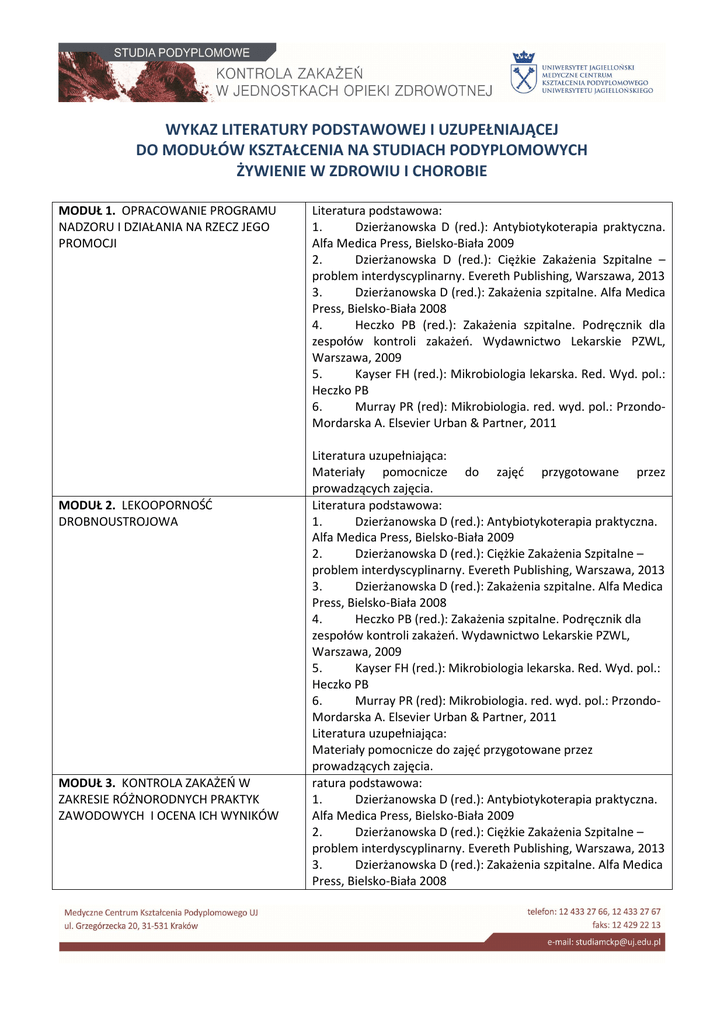 WYKAZ LITERATURY PODSTAWOWEJ I UZUPEŁNIAJĄCEJ DO MODUŁÓW KSZTAŁCENIA NA STUDIACH PODYPLOMOWYCH ŻYWIENIE W ZDROWIU I CHOROBIE MODUŁ 1. OPRACOWANIE PROGRAMU NADZORU I DZIAŁANIA NA RZECZ JEGO PROMOCJI MODUŁ 2. LEKOOPORNOŚĆ DROBNOUSTROJOWA MODUŁ 3. KONTROLA ZAKAŻEŃ W ZAKRESIE RÓŻNORODNYCH PRAKTYK ZAWODOWYCH I OCENA ICH WYNIKÓW Literatura podstawowa: 1. Dzierżanowska D (red.): Antybiotykoterapia praktyczna. Alfa Medica Press, Bielsko-Biała 2009 2. Dzierżanowska D (red.): Ciężkie Zakażenia Szpitalne – problem interdyscyplinarny. Evereth Publishing, Warszawa, 2013 3. Dzierżanowska D (red.): Zakażenia szpitalne. Alfa Medica Press, Bielsko-Biała 2008 4. Heczko PB (red.): Zakażenia szpitalne. Podręcznik dla zespołów kontroli zakażeń. Wydawnictwo Lekarskie PZWL, Warszawa, 2009 5. Kayser FH (red.): Mikrobiologia lekarska. Red. Wyd. pol.: Heczko PB 6. Murray PR (red): Mikrobiologia. red. wyd. pol.: PrzondoMordarska A. Elsevier Urban & Partner, 2011 Literatura uzupełniająca: Materiały pomocnicze do zajęć przygotowane przez prowadzących zajęcia. Literatura podstawowa: 1. Dzierżanowska D (red.): Antybiotykoterapia praktyczna. Alfa Medica Press, Bielsko-Biała 2009 2. Dzierżanowska D (red.): Ciężkie Zakażenia Szpitalne – problem interdyscyplinarny. Evereth Publishing, Warszawa, 2013 3. Dzierżanowska D (red.): Zakażenia szpitalne. Alfa Medica Press, Bielsko-Biała 2008 4. Heczko PB (red.): Zakażenia szpitalne. Podręcznik dla zespołów kontroli zakażeń. Wydawnictwo Lekarskie PZWL, Warszawa, 2009 5. Kayser FH (red.): Mikrobiologia lekarska. Red. Wyd. pol.: Heczko PB 6. Murray PR (red): Mikrobiologia. red. wyd. pol.: PrzondoMordarska A. Elsevier Urban & Partner, 2011 Literatura uzupełniająca: Materiały pomocnicze do zajęć przygotowane przez prowadzących zajęcia. ratura podstawowa: 1. Dzierżanowska D (red.): Antybiotykoterapia praktyczna. Alfa Medica Press, Bielsko-Biała 2009 2. Dzierżanowska D (red.): Ciężkie Zakażenia Szpitalne – problem interdyscyplinarny. Evereth Publishing, Warszawa, 2013 3. Dzierżanowska D (red.): Zakażenia szpitalne. Alfa Medica Press, Bielsko-Biała 2008 4. Heczko PB (red.): Zakażenia szpitalne. Podręcznik dla zespołów kontroli zakażeń. Wydawnictwo Lekarskie PZWL, Warszawa, 2009 5. Kayser FH (red.): Mikrobiologia lekarska. Red. Wyd. pol.: Heczko PB 6. Murray PR (red): Mikrobiologia. red. wyd. pol.: PrzondoMordarska A. Elsevier Urban & Partner, 2011 Literatura uzupełniająca: Materiały pomocnicze do zajęć przygotowane przez prowadzących zajęcia. MODUŁ 4. PROJEKTOWANIE SYSTEMU NADZORU Literatura podstawowa: 1. Dzierżanowska D (red.): Antybiotykoterapia praktyczna. Alfa Medica Press, Bielsko-Biała 2009 2. Dzierżanowska D (red.): Ciężkie Zakażenia Szpitalne – problem interdyscyplinarny. Evereth Publishing, Warszawa, 2013 3. Dzierżanowska D (red.): Zakażenia szpitalne. Alfa Medica Press, Bielsko-Biała 2008 4. Heczko PB (red.): Zakażenia szpitalne. Podręcznik dla zespołów kontroli zakażeń. Wydawnictwo Lekarskie PZWL, Warszawa, 2009 5. Kayser FH (red.): Mikrobiologia lekarska. Red. Wyd. pol.: Heczko PB 6. Murray PR (red): Mikrobiologia. red. wyd. pol.: Przondo-Mordarska A. Elsevier Urban & Partner, 2011 Literatura uzupełniająca: Materiały pomocnicze do zajęć przygotowane przez prowadzących zajęcia. MODUŁ 5. DZIAŁANIA NA RZECZ POPRAWY JAKOŚCI, ZARZĄDZANIE RYZYKIEM Literatura podstawowa: 1. Dzierżanowska D (red.): Antybiotykoterapia praktyczna. Alfa Medica Press, Bielsko-Biała 2009 2. Dzierżanowska D (red.): Ciężkie Zakażenia Szpitalne – problem interdyscyplinarny. Evereth Publishing, Warszawa, 2013 3. Dzierżanowska D. (red.): Zakażenia szpitalne. Alfa Medica Press, Bielsko-Biała 2008 4. Heczko PB (red.): Zakażenia szpitalne. Podręcznik dla zespołów kontroli zakażeń. Wydawnictwo Lekarskie PZWL, Warszawa, 2009 5. Kayser FH (red.): Mikrobiologia lekarska. Red. Wyd. pol.: Heczko PB 6. Murray PR (red): Mikrobiologia. red. wyd. pol.: PrzondoMordarska A. Elsevier Urban & Partner, 2011 MODUŁ 6. ZARZĄDZANIE W NADZORZE NAD ZAKAŻENIAMI: PROJEKTOWANIE I PLAN DZIAŁANIA MODUŁ 7. ZARZĄDZANIE SYSTEMEM NADZORU MODUŁ 8. ZAGADNIENIA WYBRANE Literatura uzupełniająca: Materiały pomocnicze do zajęć przygotowane przez prowadzących zajęcia. Literatura podstawowa: 1. Dzierżanowska D (red.): Antybiotykoterapia praktyczna. Alfa Medica Press, Bielsko-Biała 2009 2. Dzierżanowska D (red.): Ciężkie Zakażenia Szpitalne – problem interdyscyplinarny. Evereth Publishing, Warszawa, 2013 3. Dzierżanowska D (red.): Zakażenia szpitalne. Alfa Medica Press, Bielsko-Biała 2008 4. Heczko PB (red.): Zakażenia szpitalne. Podręcznik dla zespołów kontroli zakażeń. Wydawnictwo Lekarskie PZWL, Warszawa, 2009 5. Kayser FH (red.): Mikrobiologia lekarska. Red. Wyd. pol.: Heczko PB 6. Murray PR (red): Mikrobiologia. red. wyd. pol.: PrzondoMordarska A. Elsevier Urban & Partner, 2011 Literatura uzupełniająca: Materiały pomocnicze do zajęć przygotowane przez prowadzących zajęcia. Literatura podstawowa: 1. Dzierżanowska D (red.): Antybiotykoterapia praktyczna. Alfa Medica Press, Bielsko-Biała 2009 2. Dzierżanowska D (red.): Ciężkie Zakażenia Szpitalne – problem interdyscyplinarny. Evereth Publishing, Warszawa, 2013 3. Dzierżanowska D (red.): Zakażenia szpitalne. Alfa Medica Press, Bielsko-Biała 2008 4. Heczko PB (red.): Zakażenia szpitalne. Podręcznik dla zespołów kontroli zakażeń. Wydawnictwo Lekarskie PZWL, Warszawa, 2009 5. Kayser FH (red.): Mikrobiologia lekarska. Red. Wyd. pol.: Heczko PB 6. Murray PR (red): Mikrobiologia. red. wyd. pol.: PrzondoMordarska A. Elsevier Urban & Partner, 2011 Literatura uzupełniająca: Materiały pomocnicze do zajęć przygotowane przez prowadzących zajęcia. Literatura podstawowa: 1. Dzierżanowska D (red.): Antybiotykoterapia praktyczna. Alfa Medica Press, Bielsko-Biała 2009 2. Dzierżanowska D (red.): Ciężkie Zakażenia Szpi