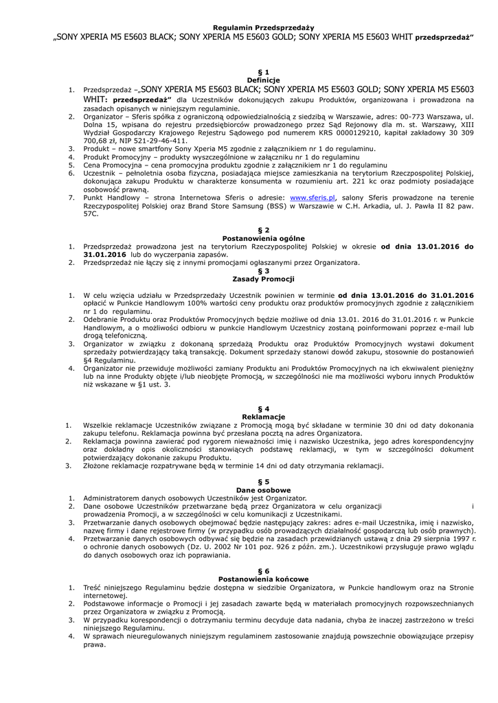 Regulamin Przedsprzedaży „SONY XPERIA M5 E5603 BLACK; SONY XPERIA M5 E5603 GOLD; SONY XPERIA M5 E5603 WHIT przedsprzedaż” 1. Przedsprzedaż –„SONY WHIT: 2. 3. 4. 5. 6. 7. 1. 2. 1. 2. 3. 4. 1. 2. 3. 1. 2. 3. 4. 1. 2. 3. 4. §1 Definicje XPERIA M5 E5603 BLACK; SONY XPERIA M5 E5603 GOLD; SONY XPERIA M5 E5603 przedsprzedaż” dla Uczestników dokonujących zakupu Produktów, organizowana i prowadzona na zasadach opisanych w niniejszym regulaminie. Organizator – Sferis spółka z ograniczoną odpowiedzialnością z siedzibą w Warszawie, adres: 00-773 Warszawa, ul. Dolna 15, wpisana do rejestru przedsiębiorców prowadzonego przez Sąd Rejonowy dla m. st. Warszawy, XIII Wydział Gospodarczy Krajowego Rejestru Sądowego pod numerem KRS 0000129210, kapitał zakładowy 30 309 700,68 zł, NIP 521-29-46-411. Produkt – nowe smartfony Sony Xperia M5 zgodnie z załącznikiem nr 1 do regulaminu. Produkt Promocyjny – produkty wyszczególnione w załączniku nr 1 do regulaminu Cena Promocyjna – cena promocyjna produktu zgodnie z załącznikiem nr 1 do regulaminu Uczestnik – pełnoletnia osoba fizyczna, posiadająca miejsce zamieszkania na terytorium Rzeczpospolitej Polskiej, dokonująca zakupu Produktu w charakterze konsumenta w rozumieniu art. 221 kc oraz podmioty posiadające osobowość prawną. Punkt Handlowy – strona Internetowa Sferis o adresie: www.sferis.pl, salony Sferis prowadzone na terenie Rzeczypospolitej Polskiej oraz Brand Store Samsung (BSS) w Warszawie w C.H. Arkadia, ul. J. Pawła II 82 paw. 57C. §2 Postanowienia ogólne Przedsprzedaż prowadzona jest na terytorium Rzeczypospolitej Polskiej w okresie od dnia 13.01.2016 do 31.01.2016 lub do wyczerpania zapasów. Przedsprzedaż nie łączy się z innymi promocjami ogłaszanymi przez Organizatora. §3 Zasady Promocji W celu wzięcia udziału w Przedsprzedaży Uczestnik powinien w terminie od dnia 13.01.2016 do 31.01.2016 opłacić w Punkcie Handlowym 100% wartości ceny produktu oraz produktów promocyjnych zgodnie z załącznikiem nr 1 do regulaminu. Odebranie Produktu oraz Produktów Promocyjnych będzie możliwe od dnia 13.01. 2016 do 31.01.2016 r. w Punkcie Handlowym, a o możliwości odbioru w punkcie Handlowym Uczestnicy zostaną poinformowani poprzez e-mail lub drogą telefoniczną. Organizator w związku z dokonaną sprzedażą Produktu oraz Produktów Promocyjnych wystawi dokument sprzedaży potwierdzający taką transakcję. Dokument sprzedaży stanowi dowód zakupu, stosownie do postanowień §4 Regulaminu. Organizator nie przewiduje możliwości zamiany Produktu ani Produktów Promocyjnych na ich ekwiwalent pieniężny lub na inne Produkty objęte i/lub nieobjęte Promocją, w szczególności nie ma możliwości wyboru innych Produktów niż wskazane w §1 ust. 3. §4 Reklamacje Wszelkie reklamacje Uczestników związane z Promocją mogą być składane w terminie 30 dni od daty dokonania zakupu telefonu. Reklamacja powinna być przesłana pocztą na adres Organizatora. Reklamacja powinna zawierać pod rygorem nieważności imię i nazwisko Uczestnika, jego adres korespondencyjny oraz dokładny opis okoliczności stanowiących podstawę reklamacji, w tym w szczególności dokument potwierdzający dokonanie zakupu Produktu. Złożone reklamacje rozpatrywane będą w terminie 14 dni od daty otrzymania reklamacji. §5 Dane osobowe Administratorem danych osobowych Uczestników jest Organizator. Dane osobowe Uczestników przetwarzane będą przez Organizatora w celu organizacji i prowadzenia Promocji, a w szczególności w celu komunikacji z Uczestnikami. Przetwarzanie danych osobowych obejmować będzie następujący zakres: adres e-mail Uczestnika, imię i nazwisko, nazwę firmy i dane rejestrowe firmy (w przypadku osób prowadzących działalność gospodarczą lub osób prawnych). Przetwarzanie danych osobowych odbywać się będzie na zasadach przewidzianych ustawą z dnia 29 sierpnia 1997 r. o ochronie danych osobowych (Dz. U. 2002 Nr 101 poz. 926 z późn. zm.). Uczestnikowi przysługuje prawo wglądu do danych osobowych oraz ich poprawiania. §6 Postanowienia końcowe Treść niniejszego Regulaminu będzie dostępna w siedzibie Organizatora, w Punkcie handlowym oraz na Stronie internetowej. Podstawowe informacje o Promocji i jej zasadach zawarte będą w materiałach promocyjnych rozpowszechnianych przez Organizatora w związku z Promocją. W przypadku korespondencji o dotrzymaniu terminu decyduje data nadania, chyba że inaczej zastrzeżono w treści niniejszego Regulaminu. W sprawach nieuregulowanych niniejszym regulaminem zastosowanie znajdują powszechnie obowiązujące przepisy prawa. ZAŁĄCZNIK NR 1 DO REGULAMINU SMARTFON SONY XPERIA INDEX DAX CENA BRUTTO Smartfon SONY XPERIA M5 E5603 BLACK 001sony001371 1899 Smartfon SONY XPERIA M5 E5603 GOLD 001sony001372 1899 Smartfon SONY XPERIA M5 E5603 WHITE 001sony001373 1899 INDEX DAX CENA BRUTTO PRODUKTY PROMOCYJNE DO SMARTFONU SONY XPERIA M5 E5603 Smartwatch Sony SW 2 silver metal 001sony000627 1