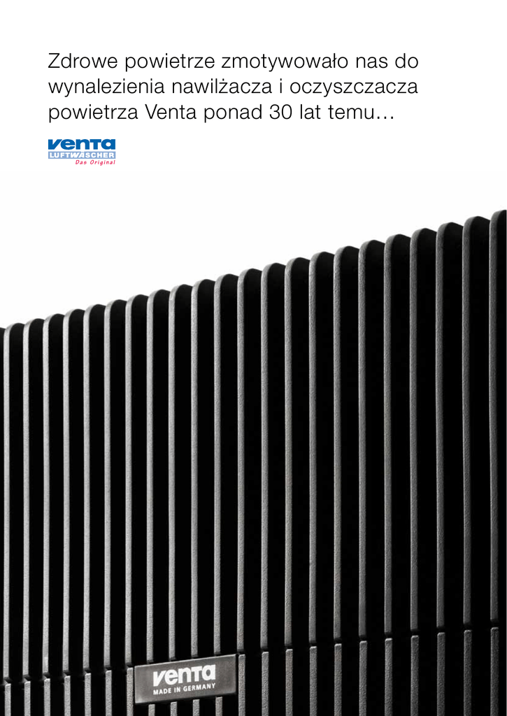 Zdrowe powietrze zmotywowało nas do wynalezienia nawilżacza i oczyszczacza powietrza Venta ponad 30 lat temu… Das Original „Polityka firmy Venta koncentruje się na użytkownikach.“ Alfred Hitzler – Prezes & CEO „Wyjątkowy – Prosty – Skuteczny – to źródło naszego sukcesu. Dzięki tym zaletom udało nam się, jako nowicjuszom, pokonać konkurencję dużych, znanych marek. W Europie staliśmy się Nr. 1. Dzięki szybkiemu wzrostowi zyskaliśmy popularność na tak trudnych rynkach jak Japonia, USA i Rosja. Około 60% naszych produktów „Made in Germany“ przeznaczonych jest na eksport. Mój cel: życzenia i sugestie naszych klientów wyznaczają kierunek naszego rozwoju i dalszych badań. Zaufanie klientów do marki VENTA decyduje o przyszłości naszej firmy. Nasi klienci powinni widzieć w Vencie rozwiązanie swoich problemów i polecać to rozwiązanie innym. Jestem dumny, ze sposobu w jaki Venta osiągnęła ten cel. Głównym motorem naszego sukcesu są rekomendacje naszych klientów. Dlatego też jestem przekonany, że Venta-Luftwäscher GmbH nadal będzie umacniać swoją pozycję jako lider na światowym rynku.“ Zasady przewodnie firmy Venta. Tożsamość firmy Venta jest jasno zdefiniowana i opiera się na określonych „zasadach przewodnich“: _ Produkty Venty to usługi. Poprawiają jakość powietrza oraz są całkowicie zorientowane na rozwiązywanie problemów, przed którymi stają nasi klienci. Dlatego też są przez nich polecane. _ Klienci Venty to nasi partnerzy. Nie przekonujemy ich do niczego krótkotrwałego, lecz rozwijamy długotrwałe relacje. _ Współpracownicy Venty rozwiązują problemy. Każdy aspekt związany z zachowaniem najwyższej jakości produktów oraz serwisu Venty traktują jako osobisty cel. ”Zdrowe powietrze zmotywowało nas do wynalezienia nawilżacza i oczyszczacza powietrza Venta ponad 30 lat temu. Nasze przyjazne dla użytkownika, proste w obsłudze, ekologiczne oraz wysokiej jakości produkty w sprawdzony sposób poprawiają jakość życia i czynią nas numerem 1 w Europie oraz liderem na światowym rynku.” Od ponad 30 lat Venta-Luftwäscher GmbH produkuje nawilżacze i oczyszczacze powietrza. Konsekwencja Trwałość Numer jeden w Europie – tę przewagę wytrwale budujemy dążąc do wiodącej pozycji na światowym rynku. Wieloletni współpracownicy gwarantują transfer know-how. Są odpowiedzialni za zobowiązanie marki Venta do dalszego rozwoju. Doświadczeni współpracownicy i silny duch zespołowy to podstawa spełnienia naszych planów dalszej ekspansji. Urządzenia Venta-Airwasher charakteryzują się trwałą konstrukcją. Przywiązujemy niezwykłą wagę do tego zagadnienia np. poprzez zastosowanie nowych materiałów i wprowadzanie nowy produktów. Zarówno opakowania jak i praktycznie wszystkie komponenty urządzeń są w 100% przetwarzalne. Optymalizacja zużycia energii oraz poprawa energetycznej wydajności to nasz kolejny cel. W efekcie klienci otrzymują produkt o wieloletniej trwałości, niezwykle prosty w użytkowaniu. W ten sposób urządzenia Venta minimalizują koszty w dłuższej perspektywie. Genialna prostota Wszystkie produkty oraz usługi Venty są łatwo dostępne, zaczynając od gromadzenia informacji, poprzez doradztwo, aż po sprzedaż i serwis. Urządzenia są proste w uruchamianiu oraz obsłudze. Są wytrzymałe, trwałe i nie wymagają częstej konserwacji. Klaus-Hermann Loock Prezes, Dyrektor generalny ds. sprzedaży Georg Länge Dyrektor działu techniki, zaopatrzenia i produkcji Jürgen Jaehnz Dyrektor ds. finansów i organizacji Övsev Di Nicola , Dyrektor działu marketingu i zarządzania produktem _1981: Założenie firmy Venta-Luftwäscher GmbH przez Alfreda Hitzlera obecnie Prezesa oraz CEO firmy. _Główna siedziba: Weingarten (Niemcy) _Ilość pracowników: 120 _Roczny obrót: 30 mln. Euro _Ilość sprzedanych urządzeń: ponad 1 mln. _Filie: USA, Szwajcaria, Holandia Firma Venta-Luftwäscher GmbH Firma Venta Luftwäscher GmbH jest światowym liderem wśród producentów urządzeń do nawilżania i oczyszczania powietrza. Chroniony międzynarodowym patentem system Venta do nawilżania i oczyszczania powietrza szybko zyskał popularność w Niemczech i dziś posiada ok. 60 % udziałów na rynku. W dziesiątce najczęściej kupowanych nawilżaczy powietrza produkty Venta zajmują 5 pierwszych miejsc (źródło: GfK, Panelmarkt Niemcy2010). Venta-Luftwäscher odnosi sukcesy również na rynkach Europy Zachodniej, Północnej i Wschodniej oraz w Japonii, Chinach i Korei. Dzięki szybkiemu wzrostowi zyskaliśmy popularność na tak trudnych rynkach jak USA i Rosja. Około 60% naszych produktów „Made in Germany“ przeznaczonych jest na eksport. LW14 LW24Plus LW44Plus Wydajność nawilżania do 17m² Wydajność oczyszczania do 10m² Wydajność nawilżania do 34m² Wydajność oczyszczania do 20m² Wydajność nawilżania do 68m² Wydajność oczyszczania do 40m² Cechy: > Bardzo niskie zużycie prądu, mniej niż 10 Watt (LW24/44Plus) > 20% redukcji dźwięku na stopniu 1 (LW24/44Plus) > Automatyczne wyłączanie w przypadku braku wody (LW24/44Plus) > Wskaźnik przypomnienia w przypadku braku wody (LW24/44Plus) Produkty Nawilżacz i oczyszczacz powietrza Venta-Airwasher Proste, zdrowe, bez wymiennych filtrów. Nawilżacz i oczyszczacz powietrza VentaAirwasher spełnia dwie funkcje: jednocześnie oczyszcza i nawilża suche powietrze. Suche i zanieczyszczone powietrze zasysane do urządzenia przechodzi przez obracające się w wodzie walce. Powietrze zostaje więc praktycznie „wymyte“. Cząstki kurzu i brudu nawet o wielkości do 10 μm (10/1000 milimetra) osadzają się na walcach i spłukiwane gromadzą się w zbiorniku. Odparowuje tylko czysta woda. Metoda zimnego odparowania wody jest uznana za najlepszą metodę nawilżania. Metoda odparowywania wody na zimno ma wiele zalet. Powietrze jest automatycznie i prawidłowo nawilżane. Nie ma możliwości nadmiern