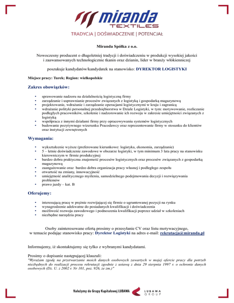 Miranda Spółka z o.o. Nowoczesny producent o długoletniej tradycji i doświadczeniu w produkcji wysokiej jakości i zaawansowanych technologicznie tkanin oraz dzianin, lider w branży włókienniczej poszukuje kandydatów/kandydatek na stanowisko: DYREKTOR LOGISTYKI Miejsce pracy: Turek; Region: wielkopolskie Zakres obowiązków: • • • • • • sprawowanie nadzoru na działalnością logistyczną firmy zarządzanie i usprawnianie procesów związanych z logistyką i gospodarką magazynową projektowanie, wdrażanie i zarządzanie operacjami logistycznymi w kraju i zagranicą wdrażanie polityki personalnej przedsiębiorstwa w Dziale Logistyki, w tym: motywowanie, rozliczanie podległych pracowników, szkolenie i nadzorowanie ich rozwoju w zakresie umiejętności związanych z logistyką współpraca z innymi działami firmy przy opracowywaniu systemów logistycznych budowanie pozytywnego wizerunku Pracodawcy oraz reprezentowanie firmy w stosunku do klientów oraz instytucji zewnętrznych Wymagania: • • • • • • • wykształcenie wyższe (preferowane kierunkowe: logistyka, ekonomia, zarządzanie) 5 – letnie doświadczenie zawodowe w obszarze logistyki, w tym minimum 3 lata pracy na stanowisku kierowniczym w firmie produkcyjnej bardzo dobra praktyczna znajomość procesów logistycznych oraz procesów związanych z gospodarką magazynową zaangażowanie oraz bardzo dobra organizacja pracy własnej i podległego zespołu otwartość na zmiany, innowacyjność umiejętność analitycznego myślenia, samodzielnego podejmowania decyzji i rozwiązywania problemów prawo jazdy – kat. B Oferujemy: • • • • interesującą pracę w prężnie rozwijającej się firmie o ugruntowanej pozycji na rynku wynagrodzenie adekwatne do posiadanych kwalifikacji i doświadczenia możliwość rozwoju zawodowego i podnoszenia kwalifikacji poprzez udział w szkoleniach niezbędne narzędzia pracy Osoby zainteresowane ofertą prosimy o przesyłanie CV oraz listu motywacyjnego, w temacie podając stanowisko pracy: Dyrektor Logistyki na adres e-mail: [email protected] Informujemy, iż skontaktujemy się tylko z wybranymi kandydatami. Prosimy o dopisanie następującej klauzuli: "Wyrażam zgodę na przetwarzanie moich danych osobowych zawartych w mojej ofercie pracy dla potrzeb niezbędnych do realizacji procesu rekrutacji zgodnie z ustawą z dnia 29 sierpnia 1997 r. o ochronie danych osobowych (Dz. U. z 2002 r. Nr 101, poz. 926, ze zm.)"
