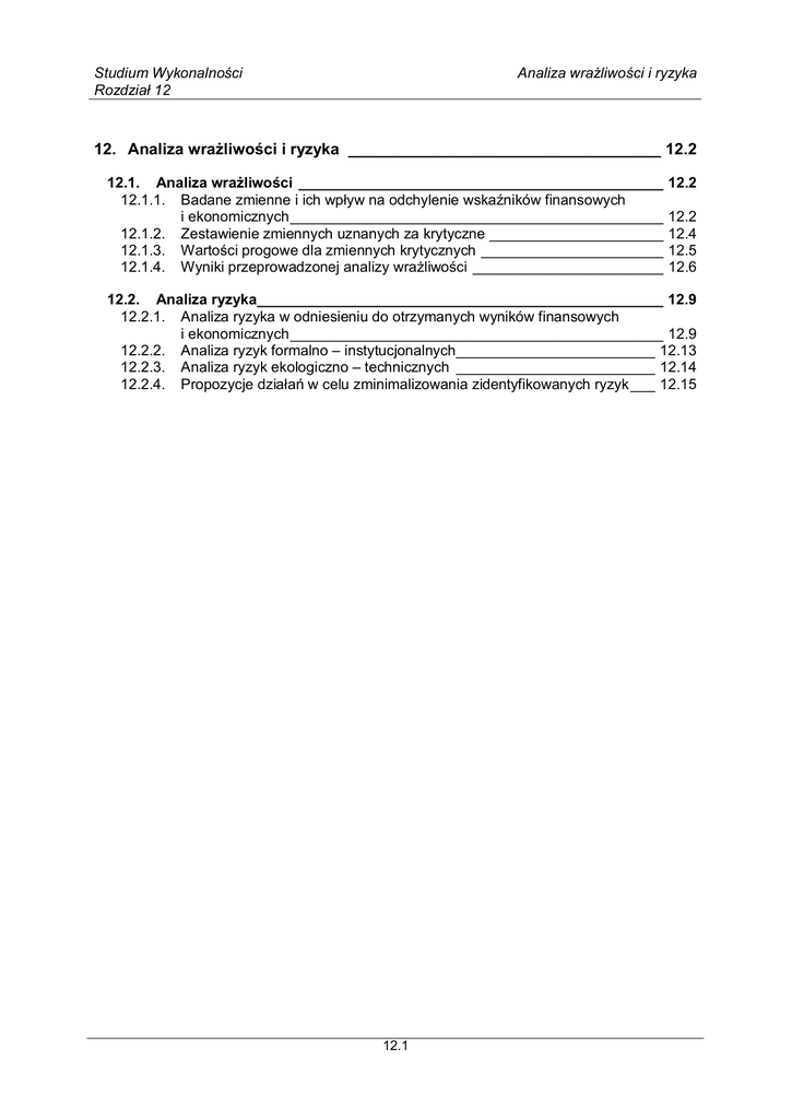 Studium Wykonalno ci Rozdzia 12 Analiza wra liwo ci i ryzyka 12. Analiza wra liwo ci i ryzyka ___________________________________ 12.2 12.1. Analiza wra liwo ci ____________________________________________ 12.2 12.1.1. Badane zmienne i ich wp yw na odchylenie wska ników finansowych i ekonomicznych _____________________________________________ 12.2 12.1.2. Zestawienie zmiennych uznanych za krytyczne _____________________ 12.4 12.1.3. Warto ci progowe dla zmiennych krytycznych ______________________ 12.5 12.1.4. Wyniki przeprowadzonej analizy wra liwo ci _______________________ 12.6 12.2. Analiza ryzyka_________________________________________________ 12.9 12.2.1. Analiza ryzyka w odniesieniu do otrzymanych wyników finansowych i ekonomicznych _____________________________________________ 12.9 12.2.2. Analiza ryzyk formalno – instytucjonalnych ________________________ 12.13 12.2.3. Analiza ryzyk ekologiczno – technicznych ________________________ 12.14 12.2.4. Propozycje dzia w celu zminimalizowania zidentyfikowanych ryzyk ___ 12.15 12.1 Studium Wykonalno ci Rozdzia 12 Analiza wra liwo ci i ryzyka 12. Analiza wra liwo ci i ryzyka 12.1. Analiza wra liwo ci Prezentowana analiza wra liwo ci jest analiz typu „what if” - umo liwia, bowiem odpowied na pytanie „co si stanie, je eli...”. Metoda ta pozwala na zbadanie wra liwo ci okre lonych parametrów na zmiany warto ci odpowiednich czynników wp ywaj cych na ich warto . W niniejszej analizie wra liwo ci parametrem, który poddano analizie jest saldo rodków pieni nych na koniec roku, gdy nie ten czynnik prezentuje w przypadku analizowanego projektu najwy sz warto poznawcz , a jego zmiana „in minus” mo e zachwia p ynno ci spó ki wiadcz cej us ugi z zakresu gospodarki odpadowej. Dodatkowo w analizie zaprezentowano warto ci FNPV i FRR liczonych po uwzgl dnieniu dotacji FS oraz dla kapita u w asnego w przep ywach finansowych, warto ci ENPV i ERR a tak e przedstawiono wp yw zmiennych na poziom przychodów generowanych przez projekt (warto DNR). W zwi zku z powy szym celem analizy wra liwo ci i ryzyka jest: 1. Identyfikacja czynników ryzyka oraz analiza ich potencjalnego wp ywu na kszta towanie si ynno ci finansowej projektu, 2. Wybór zmiennych uznanych za krytyczne dla projektu oraz analiza ich wp ywu na zmian przep ywów pieni nych spó ki (salda rodków pieni nych na koniec roku), FNPV/c (liczonego dla projektu po uwzgl dnieniu dofinansowania przez Fundusz Spójno ci), FNPV/k (liczonego dla kapita u w asnego) oraz ENPV; 3. Oszacowanie prawdopodobie stwa wyst pienia analizowanych czynników krytycznych ryzyka. 12.1.1. Badane zmienne i ich wp yw na odchylenie wska ników finansowych i ekonomicznych Analiza otoczenia makro- oraz mikroekonomicznego projektu pozwoli a wyodr bni nast puj ce czynniki ryzyka: przekroczenie bud etu inwestycji, spadek popytu tj. ilo ci dostarczanych odpadów, wzrost kosztów materia ów i energii, spadek ceny za przyj cie odpadów do termicznej obróbki, spadek ceny sprzeda y energii elektrycznej do sieci, spadek ceny sprzeda y zielonych certyfikatów, spadek ceny sprzeda y energii cieplnej do sieci ciep owniczej, spadek zapotrzebowania na energi elektryczn , spadek zapotrzebowania na zielone certyfikaty, spadek zapotrzebowania za energi ciepln . Na podstawie analizy powy szych czynników ryzyka w kontek cie sytuacji Beneficjenta wyodr bnione zosta y zmienne uznane za istotne pod wzgl dem ich wp ywu na p ynno finansow Beneficjenta, warto ci FNPV/c, FNPV/k oraz FRR/c, FRR/k, warto ci ENPV i ERR oraz poziom przychodów generowanych przez projekt (DNR). Opis danych zmiennych zosta przedstawiony w tabeli 12.1 w niniejszym podrozdziale. Dodatkowo nale y zaznaczy , e analiza wra liwo ci w odniesieniu do przep ywów pieni nych zosta a wykonana z perspektywy operatora. 12.2 Studium Wykonalno ci Rozdzia 12 Analiza wra liwo ci i ryzyka Tabela 12.1. Wykaz czynników poddanych analizie wra liwo ci. Czynnik Opis czynnika Zmiana ceny za przyj cie Na skutek ró nego rodzaju zmian w otoczeniu mo e ulec zmianie odpadów (zmniejszeniu) cena przyj cia 1 Mg odpadów do termicznej obróbki, przez co zmniejsz si przychody nowoutworzonej Spó ki. Zak ada si spadek ceny o 5% w okresie trzech lat po zako czeniu realizacji projektu (lata 2016 – 2018) przy jednoczesnym zachowaniu istniej cych wzorców konsumpcji. Zmiana popytu Analizuj c ewentualn zmian popytu ze strony mieszka ców zak ada si niewielki wzrost jednostkowej produkcji odpadów Mg/dzie . Nale y zaznaczy , e mo e nast pi taka sytuacja, w której ilo odpadów b dzie mniejsza od zak adanej w oderwaniu od jakichkolwiek zmian cen, i mo e wynikn ze zmiany potrzeb spo eczno ci lokalnej, zmiany dochodów realnych ludno ci, lepszych technologii, edukacji ekologicznej lub mniejszego ni szacowany przyrostu ilo ci odpadów. Zmiana kosztów materia ów Materia y i energia s podstawowymi rodkami produkcji i energii zu ywanymi w gospodarce odpadowej. Zmiany cen materia ów i energii mog wp yn na stabilno finansow Spó ki. Nale y tutaj zaznaczy , e niniejsza prognoza nie zak ada wzrostu zu ycia z powodów technologicznych (mog oby to oznacza inne konsekwencje techniczne, a tym samym kosztowe), lecz jedynie wzrost kosztów systemu w zwi zku ze zmian cen rynkowych. Zmiana nak adów Na skutek ró nego rodzaju zdarze w otoczeniu (nieodpowiednia inwestycyjnych wycena, zmiana przepisów, niestabilno gospodarcza, zmiany kursu walutowego) koszty te mog ulec zwi kszeniu. Zmiana ceny sprzeda y: Na skutek ró nego rodzaju zmian w otoczeniu mo e ulec zmianie - energii elektrycznej, (zmniejszeniu) cena sprzeda y energii elektrycznej, cieplnej - energii cieplnej, i cena sprzeda y zielonych certyfikatów. Takie zachowanie - zielonych certyfikatów rynkowe spowoduje, e zmniejsz si przychody nowoutworzonej Spó ki. We wszystkich trzech wariantach zak ada si spadek ceny o 5% w okresie trzech lat po zako czeniu realizacji projektu (lata 2016 – 2018). Nale y jednak e zaznaczy , e prognozy Ministerst