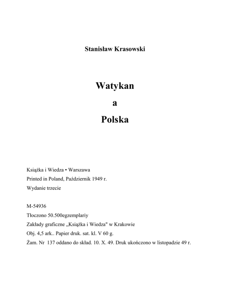 Stanisław Krasowski Watykan a Polska Książka i Wiedza • Warszawa Printed in Poland, Październik 1949 r. Wydanie trzecie M-54936 Tłoczono 50.500egzemplariy Zakłady graficzne „Książka i Wiedza" w Krakowie Obj. 4,5 ark.. Papier druk. sat. kl. V 60 g. Żam. Nr 137 oddano do skład. 10. X. 49. Druk ukończono w listopadzie 49 r. LEGENDY — FAKTY — CYFRY "Da mihi animas — caetera tolle" — „Daj mi duszę — nie żądam więcej". To zdanie jest (lub było) bardzo często cytowane przez przedstawicieli Kościoła katolickiego, biskupów i księży niższych stopni, jako dowód, że zainteresowania Kościoła obejmują zakres wyłącznie duchowy, a działalność jego ma na celu jedynie zbawienie duszy ludzkiej. W związku z tym kler katolicki uporczywie twierdził, iż wszelka działalność Kościoła jest wolna od akcentów politycznych. Biskup, prefekt szkolny czy zwykły proboszcz wiejski, słowem każdy przedstawiciel kleru chciał być — a w Polsce często jest — uważany za jednostkę, która stoi "poza i ponad partiami politycznymi". Czy kler jest apolityczny? Starannie kultywowana legenda o apolityczności kleru zapuściła w naszym kraju głębokie korzenie, zwłaszcza w kołach inteligencji pracującej i drobnomieszczaństwa. Nie są jednak wolne od częściowych sugestii również masy robotnicze i chłopskie, mimo iż zaostrzona w walce klasowej czujność dawno już wskazała im różnicę między księdzem-kapłanem, księdzem-nauczycielem prawd wiary, a księdzem-dusigroszem, księdzem-hreczkosiejem, księdzem-politykierem wreszcie. Niemniej przywiązanie do wiary i form kultu, a także szacunek dla sukni duchowej ułatwiały drogę starannie propagowanej legendzie o apolityczności kleru. Oświadczania biskupów, a tym bardziej samego papieża, były traktowane jako autorytatywnie obiektywne. Głos Stolicy Apostolskiej, głos papieża był dla przeciętnego wierzącego Polaka głosem obiektywnym. Glos ten był poparty dogmatem o nieomylności papieża w sprawach wiary, a przyznać trzeba, że Polacy są mocni w wierze, ale słabi w teologii i granica miedzy głosem ex cathedra a zwykłym przemówieniem polityka w białej sutannie była dla nich raczej nieuchwytna. Tym bardziej, że dotychczas Stolica Apostolska starannie podkreśla formalną apolityczność Kościoła: świadczyć mają o tym słowa Leona XIII, który w jednej ze swoich encyklik mówi: „Jest zuchwałym nadużywaniem religii wciąganie Kościoła do walk partyjnych i posługiwanie się jego powagą dla łatwiejszego pokonania przeciwnika"1). Obecnie sam Pius XII łamie tę zasadę, odrzuca wszelkie pozory. Kościół katolicki przechodzi do jawnej działalności politycznej. Legenda o apolityczności Watykanu okazuje się tym, czym była zawsze: tylko legendą, odrzucana dziś pod naciskiem wydarzeń. W czasie wojny Watykan podtrzymywał jeszcze legendę o apolityczności, chociaż nie mógł ukryć swoich sympatii do faszyzmu. Po wojnie papież, odrzucając pozory, wciąga Kościół do bezpośrednich rozgrywek politycznych. 1) Cytuję za listem pasterskim J. E. Ks. Kardynał Hlonda „O chrześciiańskie zasady życia państwowego". Pius XII przekreśla zalecenia Leona XII! Pozwolę sobie zacytować tutaj glos angielskiego czasopisma "Economist", pisma, które trudno jest podejrzewać o sympatie dla demokracji ludowych. W artykule pt. "Czy nowa wojna religijna?" z sierpnia 1946 roku czytamy: „Ostatni rok wyróżnia się nagłym i bardzo silnym rozszerzeniem strefy politycznej aktywności katolików. Wszędzie, gdzie istnieje opozycja w stosunku do lewicy Kościół katolicki stał się opoką nowego konserwatyzmu. Przed referendum we Francji w maju 1946 r. większość biskupów nie pozostawiała swoim wiernym żadnych wątpliwości co do tego, że katolicki wyborca winien podtrzymywać MRP w jego zamiarze obalenia projektu konstytucji. W Holandii biskupi doradzali katolikom głosowanie na partię katolicką. Biskupi Sycylii ostrzegali wyborców katolickich, że głosowanie na. rzecz partii opierających się na walce klas będzie grzechem. W przeddzień czerwcowych wyborów w Italii i Francji sam papież podkreślił, że między lewicą i Kościołem istnieją zasadnicze różnice. Wszyscy mamy jeszcze w pamięci niedawny udział papieża i kleru watykańskiego w wyborach włoskich. Udział tak wyraźny, że nie pozostawiający nawet cienia wątpliwości co do politycznego charakteru tej akcji. W wyborach włoskich Watykan używał wszystkich chwytów stosowanych zwykle przez reakcyjne partie polityczne w kampanii wyborczej. W akcji tej uderzało jednak przede wszystkim nadużywanie w niespotykanej dotychczas skali instytucji kultu religijnego dla celów walki wyborczej. Ambona, konfesjonał, klauzura klasztorna, nabożeństwa wreszcie, wszystko rzucono na szalę walki politycznej. W ten sposób papież Pius XII przekreślał słowa papieża Leona XIII: "Wciąganie Kościoła do walk partyjnych jest zuchwałym nadużyciem religii4". Papież Pius XII wypełniał zobowiązanie przyjęte w sierpniu 1917 r. w Liście do Trumana. W liście tym przyłączając się oficjalnie do obozu imperialistycznej polityki amerykańskiej powiedział: "Nikt więcej od nas nie będzie żywić nadziei w powodzenie i szczęśliwe osiągnięcie celu, dla którego stawiamy do dyspozycji nasze zasoby i poważnie prosimy Boga o pomoc". Antypolski list papieża z marca 1948 r. jest tylko konsekwencją raz obranej linii politycznej, linii, która ma głębsze i bardziej materialne podłoże. Ziemskie interesy hierarchii watykańskiej Tak jak przeciętny Polak niewiele wie o politycznej działalności Watykanu, tak również nie zdaje sobie oprawy z tego, ze biskup rzymski nie zawsze modli i pisze listy pasterskie, że zajmuje się on również działalnością bardzo „z tego świata", działalnością, którą w naszym wieku przywykliśmy nazywać działalnością ekonomiczną, pełną brzęku złota i sze