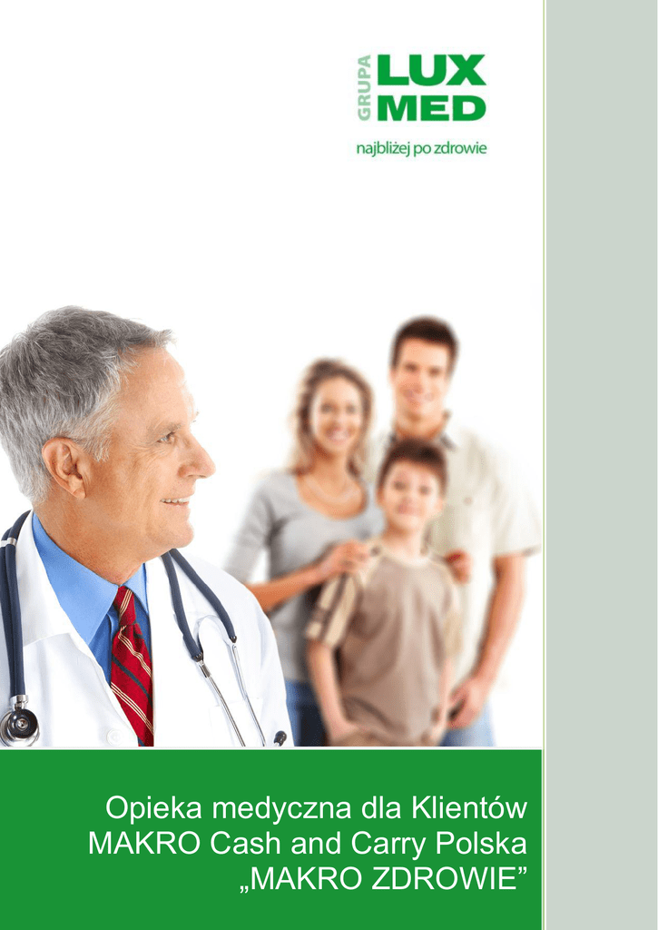 Opieka medyczna dla Klientów MAKRO Cash and Carry Polska „MAKRO ZDROWIE” Program „MAKRO ZDROWIE” Program „MAKRO ZDROWIE” to indywidualny abonament medyczny dla osób posiadających kartę Makro. Oferta jest skierowana do posiadaczy karty Makro oraz członków ich rodziny. Członek rodziny to: małżonek lub partner życiowy pozostający w faktycznym pożyciu z Klientem Makro, do ukończenia 65 roku życia; dzieci Klienta Makro (własne lub przysposobione), pozostające na jego utrzymaniu i wspólnie z nim zamieszkujące, do ukończenia 26 roku życia; rodzeństwo Klienta Makro, rozumiane jako brat lub siostra wraz z ich małżonkami i partnerami życiowymi oraz dziećmi spełniającymi kryteria powyższych definicji. Program „MAKRO ZDROWIE” posiada dwa warianty zakresu i ceny, zapewniające optymalnie dobrany zakres usług medycznych dla osób aktywnie prowadzących działalność gospodarczą oraz członków ich rodzin: MAKRO ZDROWIE Płatność miesięczna Cena roczna Płatność miesięczna Cena dla głównego beneficjenta Suma wpłat miesięcznych = 838,00 zł 69,90 zł Cena za dodatkowych beneficjentów (członkowie rodziny) Suma wpłat miesięcznych = 799,92 zł 66,66 zł Cena roczna Płatność miesięczna Cena dla głównego beneficjenta 788,00 zł Nie dotyczy Cena za dodatkowych beneficjentów (członkowie rodziny) 755,00 zł Nie dotyczy Cena roczna Płatność miesięczna Cena dla głównego beneficjenta Suma wpłat miesięcznych = 1558,80 zł 129,90 zł Cena za dodatkowych beneficjentów (członkowie rodziny) Suma wpłat miesięcznych = 1498,00 zł 124,90 zł Cena roczna Płatność miesięczna Cena dla głównego beneficjenta 1460,00 zł Nie dotyczy Cena za dodatkowych beneficjentów (członkowie rodziny) 1399,00 zł Nie dotyczy MAKRO ZDROWIE Płatność roczna MAKRO ZDROWIE PLUS MAKRO ZDROWIE PLUS Płatność miesięczna MAKRO ZDROWIE PLUS Płatność roczna Usługi medyczne świadczone są w Centrach Medycznych Grupy LUX MED (LUX MED, CM LIM, PROMEDIS, Medycyna Rodzinna) oraz w dedykowanych placówkach współpracujących w całym kraju. www.luxmed.pl Oferta obowiązuje od lutego 2012 r. Definicje usług medycznych Konsultacje specjalistyczne W ramach abonamentu, Pacjent ma nielimitowany dostęp do konsultacji lekarzy specjalistów w sytuacjach chorobowych, zaostrzenia się chorób przewlekłych oraz pomocy w nagłych zachorowaniach. Konsultacje specjalistyczne obejmują: wywiad, poradę lekarza wraz z czynnościami podstawowymi niezbędnymi do postawienia diagnozy, podjęcia właściwej decyzji terapeutycznej oraz monitorowania leczenia. Usługa nie dotyczy tzw. konsultacji profesorskich (profesorzy, dr hab., docenci). LUX MED gwarantuje Pacjentom dostęp do lekarzy niżej wymienionych specjalności bez skierowania: MAKRO ZDROWIE Choroby wewnętrzne (internista i / lub lekarz medycyny rodzinnej) Ginekologia Chirurgia ogólna Laryngologia Okulistyka Dermatologia Ortopedia Kardiologia Neurologia Urologia Alergologia Lekarz dyżurny – internista Lekarz dyżurny – chirurg ogólny Lekarz dyżurny - ortopeda W przypadku, gdy posiadaczem (do ukończenia 18 r.ż.): Pediatria Lekarz medycyny rodzinnej Lekarz dyżurny - pediatra Alergologia Karty jest dziecko MAKRO ZDROWIE PLUS Choroby wewnętrzne (internista i / lub lekarz medycyny rodzinnej) Ginekologia Chirurgia ogólna Laryngologia Okulistyka Dermatologia Ortopedia Kardiologia Neurologia Urologia Alergologia Lekarz dyżurny – internista Lekarz dyżurny – chirurg ogólny Lekarz dyżurny - ortopeda Chirurgia naczyniowa Diabetolog Endokrynologia Gastroenterologia Pulmonologia Reumatologia. W przypadku, gdy posiadaczem (do ukończenia 18 r.ż.): Pediatria Lekarz medycyny rodzinnej Lekarz dyżurny - pediatria Chirurgia Ortopedia Neurologia Alergologia Karty jest dziecko Badania diagnostyczne W zakres kompleksowych badań diagnostycznych wchodzą niżej wymienione badania diagnostyki laboratoryjnej, obrazowej i czynnościowej. Liczba wykonywanych badań diagnostycznych nie jest limitowana. Badania diagnostyczne wykonywane są na podstawie skierowań wystawionych przez lekarza Grupy LUX MED: Diagnostyka laboratoryjna Badania hematologiczne i koaguologiczne: Badania biochemiczne i hormonalne markery nowotworowe MAKRO ZDROWIE oraz OB / ESR, Morfologia + płytki + rozmaz automatyczny, Retykulocyty CRP ilościowo Transaminaza GOT / AST Transaminaza GPT / ALT Amylaza / Amylase Albumin / Albuminy Białko całkowite / Total Protein Bilirubina całkowita / Total Bilirubin Bilirubina bezpośrednia / D.Bilirubin Chlorki / Cl Cholesterol MAKRO ZDROWIE PLUS OB / ESR, Morfologia + płytki + rozmaz automatyczny, Płytki krwi manualnie, Retykulocyty, Eozynofilia bezwzględna w rozmazie krwi, INR / Czas protrombinowy / Quick, trombinowy – TT, APTT, Fibrynogen CRP ilościowo Transaminaza GOT / AST Transaminaza GPT / ALT Amylaza / Amylase Albumin / Albuminy Białko całkowite / Total Protein Bilirubina całkowita / Total Bilirubin Bilirubina bezpośrednia / D.Bilirubin Chlorki / Cl Cholesterol Czas www.luxmed.pl Oferta obowiązuje od lutego 2012 r. HDL Cholesterol LDL Cholesterol Klirens kreatyniny (tylko poza Warszawą) LDH - dehydrogen. mlecz. Fosfataza zasadowa / Alkaline Phosphatase Fosfataza kwaśna Fosfor / P GGTP Glukoza / Glucose na czczo Glukoza / Glucose badanie glukometrem Kreatynina / Creatinine Kwas moczowy / Uric acid Lipidogram (CHOL, HDL, LDL, TG) Magnez / Mg Mocznik / Azot Mocznikowy / BUN Potas / K Proteinogram Sód / Na Trójglicerydy / Triglicerides Wapń / Ca Żelazo / Fe Immunoglobulin IgA Immunoglobulin IgE (IgE całkowite) Immunoglobulin IgG Immunoglobulin IgM Kwas foliowy Witamina B12 Tyreoglobulina / Thyroglobulin Lipaza Miedź Adrenalina w surowicy TSH / hTSH T3 Wolne / Free - T3 T4 Wolne / Free - T4 AFP - alfa - fetoproteina PSA całkowite / Total PSA CEA - antygen carcinoembrionalny Serologia kiły podstawowa (VDRL lub USR lub anty TP) dawniej WR ASO ilościowo RF - CZYNNIK REUMATOIDALNY - ilościo