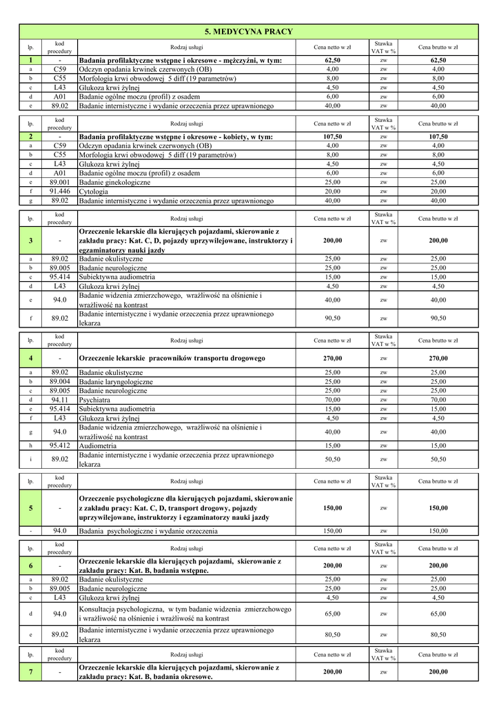 5. MEDYCYNA PRACY lp. 1 a b c d e lp. 2 a b c d e f g kod procedury C59 C55 L43 A01 89.02 kod procedury C59 C55 L43 A01 89.001 91.446 89.02 lp. kod procedury 3 - a d 89.02 89.005 95.414 L43 e 94.0 f 89.02 lp. kod procedury 4 - a f 89.02 89.004 89.005 94.11 95.414 L43 g 94.0 h 95.412 i 89.02 lp. kod procedury 5 - - 94.0 lp. kod procedury 6 - a c 89.02 89.005 L43 d 94.0 e 89.02 lp. kod procedury 7 - b c b c d e b Rodzaj usługi Badania profilaktyczne wstępne i okresowe - mężczyźni, w tym: Odczyn opadania krwinek czerwonych (OB) Morfologia krwi obwodowej 5 diff (19 parametrów) Glukoza krwi żylnej Badanie ogólne moczu (profil) z osadem Badanie internistyczne i wydanie orzeczenia przez uprawnionego Rodzaj usługi Badania profilaktyczne wstępne i okresowe - kobiety, w tym: Odczyn opadania krwinek czerwonych (OB) Morfologia krwi obwodowej 5 diff (19 parametrów) Glukoza krwi żylnej Badanie ogólne moczu (profil) z osadem Badanie ginekologiczne Cytologia Badanie internistyczne i wydanie orzeczenia przez uprawnionego Cena netto w zł 62,50 4,00 8,00 4,50 6,00 40,00 Cena netto w zł 107,50 4,00 8,00 4,50 6,00 25,00 20,00 40,00 Stawka VAT w % zw zw zw zw zw zw Stawka VAT w % zw zw zw zw zw zw zw zw Cena brutto w zł 62,50 4,00 8,00 4,50 6,00 40,00 Cena brutto w zł 107,50 4,00 8,00 4,50 6,00 25,00 20,00 40,00 Cena netto w zł Stawka VAT w % Cena brutto w zł 200,00 zw 200,00 25,00 25,00 15,00 4,50 zw zw 25,00 25,00 15,00 4,50 40,00 zw 40,00 90,50 zw 90,50 Cena netto w zł Stawka VAT w % Cena brutto w zł Orzeczenie lekarskie pracowników transportu drogowego 270,00 zw 270,00 Badanie okulistyczne Badanie laryngologiczne Badanie neurologiczne Psychiatra Subiektywna audiometria Glukoza krwi żylnej Badanie widzenia zmierzchowego, wrażliwość na olśnienie i wrażliwość na kontrast Audiometria Badanie internistyczne i wydanie orzeczenia przez uprawnionego lekarza 25,00 25,00 25,00 70,00 15,00 4,50 zw zw 25,00 25,00 25,00 70,00 15,00 4,50 40,00 zw 40,00 15,00 zw 15,00 50,50 zw 50,50 Rodzaj usługi Cena netto w zł Stawka VAT w % Cena brutto w zł Orzeczenie psychologiczne dla kierujących pojazdami, skierowanie z zakładu pracy: Kat. C, D, transport drogowy, pojazdy uprzywilejowane, instruktorzy i egzaminatorzy nauki jazdy 150,00 zw 150,00 Badania psychologiczne i wydanie orzeczenia 150,00 zw 150,00 Cena netto w zł Stawka VAT w % Cena brutto w zł 200,00 zw 200,00 25,00 25,00 4,50 zw zw 25,00 25,00 4,50 Konsultacja psychologiczna, w tym badanie widzenia zmierzchowego i wrażliwość na olśnienie i wrażliwość na kontrast 65,00 zw 65,00 Badanie internistyczne i wydanie orzeczenia przez uprawnionego lekarza 80,50 zw 80,50 Cena netto w zł Stawka VAT w % Cena brutto w zł 200,00 zw 200,00 Rodzaj usługi Orzeczenie lekarskie dla kierujących pojazdami, skierowanie z zakładu pracy: Kat. C, D, pojazdy uprzywilejowane, instruktorzy i egzaminatorzy nauki jazdy Badanie okulistyczne Badanie neurologiczne Subiektywna audiometria Glukoza krwi żylnej Badanie widzenia zmierzchowego, wrażliwość na olśnienie i wrażliwość na kontrast Badanie internistyczne i wydanie orzeczenia przez uprawnionego lekarza Rodzaj usługi Rodzaj usługi Orzeczenie lekarskie dla kierujących pojazdami, skierowanie z zakładu pracy: Kat. B, badania wstępne. Badanie okulistyczne Badanie neurologiczne Glukoza krwi żylnej Rodzaj usługi Orzeczenie lekarskie dla kierujących pojazdami, skierowanie z zakładu pracy: Kat. B, badania okresowe. zw zw zw zw zw zw zw b 89.02 L43 c 94.0 d 89.02 lp. kod procedury 8 - a - Badanie okulistyczne Glukoza krwi żylnej Badanie widzenia zmierzchowego, wrażliwość na olśnienie i wrażliwość na kontrast Badanie internistyczne i wydanie orzeczenia przez uprawnionego lekarza 25,00 4,50 zw zw 25,00 4,50 40,00 zw 40,00 130,50 zw 130,50 Cena netto w zł Stawka VAT w % Cena brutto w zł 162,60 23 200,00 121,95 23 150,00 Cena netto w zł Stawka VAT w % Cena brutto w zł 406,50 23 500,00 4,50 25,00 90,00 113,82 23 23 5,54 30,75 110,70 140,00 173,18 23 213,02 Cena netto w zł Stawka VAT w % Cena brutto w zł Badanie licencja ochrony, w tym: 284,55 23 350,00 Rodzaj usługi Orzeczenie lekarskie dla kierujących pojazdami, amatorsko Kat.AM, A1, A2, A, B1, B+E lub T, C1 C1+E, C, C+E, D1, D1+E, D, D+E LUB pozwolenie na kierowanie tramwajem Badania psychologiczne w zakresie psychologii transportu zgodnie z cennikiem: 3. ZAKŁAD USŁUG PSYCHOLOGICZNYCH lp. kod procedury 9 - a d L43 89.02 94.11 94.0 e 89.02 lp. kod procedury 10 - a 89.02 Badanie okulistyczne 25,00 23 30,75 b L43 Glukoza krwi żylnej 4,50 23 5,54 c 94.11 Psychiatra 66,30 23 81,55 d 94.0 Badania psychologiczne i wydanie orzeczenia 95,00 23 116,85 e 89.02 Badanie internistyczne i wydanie orzeczenia przez uprawnionego lekarza 93,75 23 115,31 lp. kod procedury Cena netto w zł Stawka VAT w % Cena brutto w zł 11 - 269,50 zw 269,50 a 25,00 25,00 25,00 4,50 150,00 zw e 89.02 89.005 89.004 L43 94.0 zw 25,00 25,00 25,00 4,50 150,00 f 89.02 40,00 zw 40,00 lp. kod procedury b c b c d b 94.11 94.0 c 89.02 lp. kod procedury 13 - a b 87.440 A21 c 89.02 lp. kod procedury 14 - a 89.02 12 a Rodzaj usługi Pozwolenia na broń - osoby ubiegające się o pozwolenie na broń, w tym: Glukoza krwi żylnej Badanie okulistyczne Psychiatra Badania psychologiczne i wydanie orzeczenia Badanie internistyczne i wydanie orzeczenia przez uprawnionego lekarza Rodzaj usługi Rodzaj usługi Badanie pracowników zabezpieczenia technicznego I i II stopnia, w tym: Badanie okulistyczne Badanie neurologiczne Badanie laryngologiczne Glukoza krwi żylnej Psycholog Badanie internistyczne i wydanie orzeczenia przez uprawnionego lekarza Rodzaj usługi Badanie osoby posiadającej licencję detektywa*, w tym: Psychiatra Psycholog Badanie internistyczne i wydanie orzeczenia przez uprawnionego lekarza Cena netto w zł 350,00 100,00 150,00 23 23 zw zw zw Stawka VAT w % 23 Cena brutto w zł 23 430,50 123,00 184,50 23 123,00 Cena netto w zł Stawka VAT w % Cena brutto w zł 150,00 z