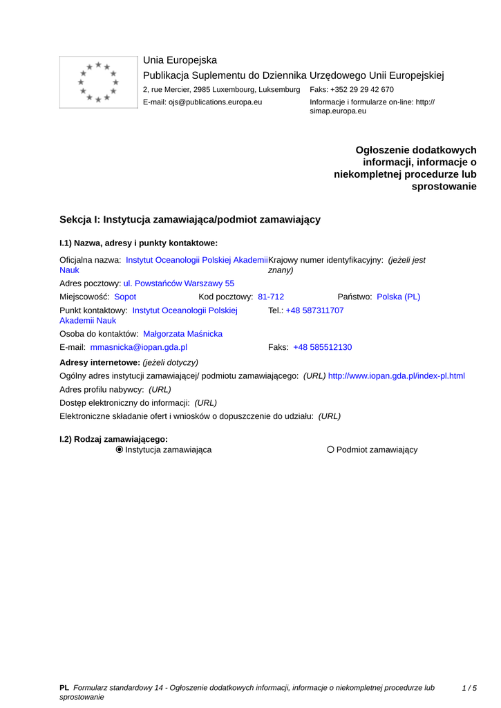 Unia Europejska Publikacja Suplementu do Dziennika Urzędowego Unii Europejskiej 2, rue Mercier, 2985 Luxembourg, Luksemburg Faks: +352 29 29 42 670 E-mail: [email protected] Informacje i formularze on-line: http:// simap.europa.eu Ogłoszenie dodatkowych informacji, informacje o niekompletnej procedurze lub sprostowanie Sekcja I: Instytucja zamawiająca/podmiot zamawiający I.1) Nazwa, adresy i punkty kontaktowe: Oficjalna nazwa: Instytut Oceanologii Polskiej AkademiiKrajowy numer identyfikacyjny: (jeżeli jest Nauk znany) _____ Adres pocztowy: ul. Powstańców Warszawy 55 Miejscowość: Sopot Kod pocztowy: 81-712 Punkt kontaktowy: Instytut Oceanologii Polskiej Akademii Nauk Państwo: Polska (PL) Tel.: +48 587311707 Osoba do kontaktów: Małgorzata Maśnicka E-mail: [email protected] Faks: +48 585512130 Adresy internetowe: (jeżeli dotyczy) Ogólny adres instytucji zamawiającej/ podmiotu zamawiającego: (URL) http://www.iopan.gda.pl/index-pl.html Adres profilu nabywcy: (URL) _____ Dostęp elektroniczny do informacji: (URL) _____ Elektroniczne składanie ofert i wniosków o dopuszczenie do udziału: (URL) _____ I.2) Rodzaj zamawiającego: Instytucja zamawiająca Podmiot zamawiający PL Formularz standardowy 14 - Ogłoszenie dodatkowych informacji, informacje o niekompletnej procedurze lub sprostowanie 1/5 Sekcja II: Przedmiot zamówienia II.1.1) Nazwa nadana zamówieniu: Sukcesywne dostawy oleju napędowego (lekkiego) dla statku naukowo-badawczego s/y „Oceania” II.1.2) Krótki opis zamówienia lub zakupu: (podano w pierwotnym ogłoszeniu) 1. Przedmiotem zamówienia są sukcesywne dostawy oleju napędowego (lekkiego) dla statku naukowo badawczego s/y „Oceania” przez okres 24 miesięcy. 2. Zamawiający podzielił przedmiot zamówienia na 2 pakiety: a) Pakiet I - przewidywana wielkość zamówienia 360 T oleju napędowego; miejsce dostawy: port Gdańsk, nabrzeże zbożowe, ul. Starowiślna 1; b) Pakiet II - przewidywana wielkość zamówienia 100 T oleju napędowego; miejsce dostawy: w drodze na Spitsbergen oraz w portach Spitsbergenu (Norwegia). 3. Olej napędowy musi odpowiadać normie ISO 8217: 2010 (E), z zawartością siarkowodoru w fazie ciekłej nie przekraczającej 0,5 mg/kg oraz zawartością siarki poniżej 0,1 %. Jakość dostarczanego paliwa powinna być każdorazowo potwierdzona atestem/certyfikatem. 4. Forma dostawy – za pomocą autocysterny z własnym urządzeniem podającym olej do zbiorników statku lub za pomocą bunkierki (opcjonalnie). 5. Odbiór oleju następować będzie na burcie statku przez St. Mechanika lub osobę upoważnioną. 6. Jednorazowa dostawa w przypadku Pakietu I obejmować będzie od 20 do 40 ton oleju napędowego. W przypadku Pakietu II Zamawiający przewiduje 2-3 dostawy. 7. Zamawiający (Armator) każdorazowo uzgadniać będzie z dostawcą termin dostawy i ilość oleju napędowego na co najmniej 2 dni przed terminem dostawy w przypadku dostawy krajowej lub na co najmniej 7 dni przed terminem dostawy w przypadku dostawy zagranicznej. Uzgodnienie dostawy następować będzie telefonicznie, za potwierdzeniem faksem lub e-mailem (zgodnie z życzeniem dostawcy). 8. Armator posiada dokument AKC-PR – potwierdzenie zgłoszenia rejestracyjnego w Urzędzie Celnym w zakresie podatku akcyzowego. Paliwo żeglugowe będące przedmiotem niniejszego postępowania jest objęte zwolnieniem z akcyzy przy dostawie. 9. W związku z klasyfikacją statku naukowo-badawczego „Oceania” w grupie PKWiU 30.11.33.0 „Statki badawcze, morskie” dostawy paliwa na statek posiadają zerową stawkę VAT. 10. Zamawiający przewiduje udzielenie zamówień uzupełniających do wysokości 20% wartości zamówienia podstawowego. 11. Zamawiający zastrzega sobie prawo zamówienia mniejszej ilości paliwa, jednak nie więcej niż o 20% ilości stanowiącej przedmiot zamówienia. Wykonawcy nie będą przysługiwać z tego tytułu żadne roszczenia względem Zamawiającego. II.1.3) Wspólny Słownik Zamówień (CPV) Główny przedmiot Słownik główny 09134100 Słownik uzupełniający (jeżeli dotyczy) PL Formularz standardowy 14 - Ogłoszenie dodatkowych informacji, informacje o niekompletnej procedurze lub sprostowanie 2/5 Sekcja IV: Procedura IV.1)Rodzaj procedury (podano w pierwotnym ogłoszeniu) Otwarta Ograniczona Ograniczona przyspieszona Negocjacyjna Negocjacyjna przyspieszona Dialog konkurencyjny Negocjacyjna z uprzednim ogłoszeniem Negocjacyjna bez uprzedniego ogłoszenia Negocjacyjna z publikacją ogłoszenia o zamówieniu Negocjacyjna bez publikacji ogłoszenia o zamówieniu Udzielenie zamówienia bez uprzedniej publikacji ogłoszenia o zamówieniu w Dzienniku Urzędowym Unii Europejskiej IV.2)Informacje administracyjne IV.2.1)Numer referencyjny: (podano w pierwotnym ogłoszeniu) IO/ZP/6/2014 IV.2.2)Dane referencyjne ogłoszenia w przypadku ogłoszeń przesłanych drogą elektroniczną: Pierwotne ogłoszenie przesłane przez eNotices TED eSender Login: ENOTICES_IOPAN Dane referencyjne ogłoszenia: 2014-034653 rok i numer dokumentu IV.2.3)Ogłoszenie, którego dotyczy niniejsza publikacja: Numer ogłoszenia w Dz.U.: 2014/S 054-089797 z dnia: 18/03/2014 (dd/mm/rrrr) IV.2.4)Data wysłania pierwotnego ogłoszenia: 13/03/2014 (dd/mm/rrrr) PL Formularz standardowy 14 - Ogłoszenie dodatkowych informacji, informacje o niekompletnej procedurze lub sprostowanie 3/5 Sekcja VI: Informacje uzupełniające VI.1) Ogłoszenie dotyczy: Procedury niepełnej Sprostowania Informacji dodatkowych VI.2) Informacje na temat niepełnej procedury udzielenia zamówienia: Postępowanie o udzielenie zamówienia zostało przerwane Postępowanie o udzielenie zamówienia uznano za nieskuteczne Zamówienia nie udzielono Zamówienie może być przedmiotem ponownej publikacji VI.3) Informacje do poprawienia lub dodania : VI.3.1) Zmiana oryginalnej informacji podanej przez instytucję zamawiającą Publikacja w witrynie TED niezgodna z oryginalną informacją, przekazaną przez instytucję zamaw