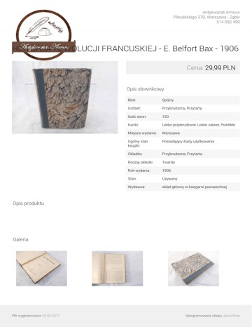 Antykwariat Amicus Piłsudskiego 37B, Warszawa - Ząbki 514 092 499 HISTORJA REWOLUCJI FRANCUSKIEJ - E. Belfort Bax - 1906 Cena: 29,99 PLN Opis słownikowy Blok: Spójny Grzbiet: Przybrudzony, Przytarty Ilość stron: 130 Kartki: Lekko przybrudzone, Lekko zalane, Pożółkłe Miejsce wydania: Warszawa Ogólny stan książki: Posiadający ślady użytkowania Okładka: Przybrudzona, Przytarta Rodzaj okładki: Twarda Rok wydania: 1906 Stan: Używany Wydawca: sklad główny w księgarni powszechnej Opis produktu Galeria Plik wygenerowano: 03-03-2017 Powered by TCPDF (www.tcpdf.org) Oprogramowanie sklepu: AptusShop