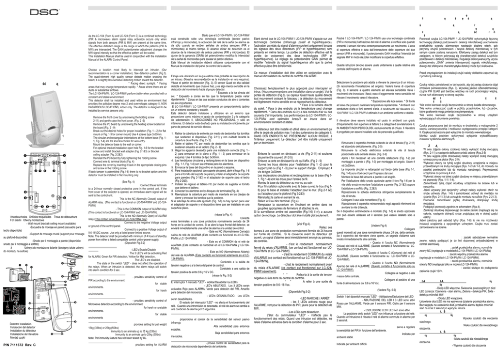 ENGLISH LC-104-PIMW (Form A) LC-124-PIMW (Form C) Dual-Tech Motion Sensor (PIR & Microwave) with Pet Immunity Sensor de movimiento de tecnología doble (sensor PIR y microondas) con inmunidad a mascotas Détecteur de mouvement bi-technologie (IRP & hyperfréquence) avec immunité aux animaux Rilevatore di Movimento a Doppia Tecnologia (Infrarosso + Microonda) con immunità agli animali Dualna czujka ruchu (PIR i mikrofala) odporna na obecność zwierząt Fig 1 Knockout holes I Orificios troquelados I Trous de débouchure I Fori ciechi I Otwory montażowe Bracket Installation - Wall mount bracket (ceiling mount available) Instalación del soporte-Escuadra de montaje en pared (escuadra para techo disponible) Installation du support-Support de montage mural (support pour montage au plafond disponible) Installazione dello snodo-Snodo per il montaggio a parete (disponibile snodo per il montaggio a soffitto) Montaż uchwytu- Uchwyt do montażu na ścianie (dostępny także uchwyt do montażu na suficie) Fig 2 Detector Installation Instalación del detector Installation du détecteur Installazione del rilevatore Montaż czujki P/N 7111672 Rev. C The detector provides an analysis of environmental conditions through the entire movement speed frequency spectrum, allowing focus on intruders and eliminating environmental factors of false alarms. The spectrum analysis is embedded in the VLSI based electronics of the detector assuring high reliability and trouble free operation. As the LC-104 (Form A) and LC-124 (Form C) is a combined technology (PIR & microwave) alarm signal relay activation occurs only when signals from both sensors (PIR & MW) are present at the same time. The effective detection range is the range of which the patterns (PIR & MW) are intersected. The GAIN potentiometer adjustment changes the MW signal intensity so that the effective pattern will be scaled. This Installation Manual shall be used in conjunction with the Installation Manual of the ALARM Control Panel. TYPICAL INSTALLATION Select mounting location Choose a location most likely to intercept an intruder. (Our recommendation is a corner installation). See detection pattern (Fig.3). The quad-element high quality sensor detects motion crossing the beam; it is slightly less sensitive detecting motion toward the detector. Avoid The Following Locations: * Facing direct sunlight. * Facing areas that may change temperature rapidly. * Areas where there are air ducts or substantial airflows. The LC-104-PIMW / LC-124-PIMW perform better when provided with a constant and stable environment. This detector shall be installed and used within an environment that provides the pollution degree max 2 and overvoltages category II, NON HAZARDOUS LOCATIONS, indoor only. The detector is designed to be installed by service persons only. MOUNTING THE DETECTOR 1. Remove the front cover by unscrewing the holding screw (Fig. 2-11) and gently raise the front cover. (Fig. 2 -5) 2. Remove the PC board by unscrewing the holding screw located on the board.(Fig. 2 - 9) 3. Break out the desired holes for proper installation (Fig. 1 – 2) for flat mount or Fig. 1-3 for corner mount) Use 4 screws type 3x30mm. 4. The circular and rectangular indentations at the bottom base (Fig. 11, Fig. 1-4) are the knockout holes for wire entry. 5. Mount the detector base to the wall or corner. 6. For optional bracket installation open hole Fig. 1-6 for the bracket screw and install Bracket wall adapter (Fig. 2-1&3) or Bracket ceiling adapter (Fig. 2-2&3) 7. Reinstall the PC board by fully tightening the holding screw. 8. Connect wire to terminal block.(Fig. 4) 9. Replace the cover by inserting it back in the appropriate closing pins and screw in the holding screw. If back tamper is assembled (Fig.1-6) there is no bracket option and the detector must be installed in flat mounting only DETECTOR INSTALLATION Terminal Block Connections (See Fig. 4) Terminals 1 & 2 - Marked “T2, T1” (TAMPER) Connect these terminals to a 24-hour normally closed protective zone in the control unit. If the front cover of the detector is opened, an immediate alarm signal will be sent to the control unit. Terminal 3 Marked "NC" - This is the NC (Normally Closed) output of ALARM relay. (This contact is functional on LC-104-PIMW and LC-124PIMW) Terminal 4 Marked "C" - This is the COMMON output of ALARM relay (This contact is functional on LC-104-PIMW and LC-124-PIMW). Terminal 5 Marked "NO" - This is the NO (Normally Open) of ALARM relay (This contact is functional on LC-124-PIMW only). Terminal 6 – Marked "-" (GND) Connect to the negative Voltage output or ground of the control panel. Terminal 7 - Marked "+" (+12V) Connect to a positive Voltage output of 9.6-16VDC source. Use only a listed power limited source. Note: The detector shall be provided with minimum of 4 hours of standby power from either a listed compatible control unit or power supply. SETTING - UP THE DETECTOR (Dipswitch Fig.5-2) LED ENABLE / DISABLE Switch 1 of dipswitch marked "LED" - LED's Enable/Disable Position Up “ON” – LED's ENABLE The 3 LED's will be activating Red for ALARM, Green for PIR detection, Yellow for MW detection.. Position Down “OFF” – LED's DISABLE The LED’s are disabled. NOTE: The state of the switch “LED” - does not affect the operation of the relays. When an intrusion is detected, the alarm relays will switch into alarm condition for 2 sec. PIR SENSITIVITY ADJUSTMENT Switch 2 of dipswitch marked “PIR” - provides sensitivity control of PIR according to the environment. Position Up “ON” - (Pulse=1) - High sensitivity for stable environments. Position Down “OFF” - (Pulse=Auto) - Low sensitivity for harsh environments. MW SENSITIVITY ADJUSTMENT Switch 3 of dipswitch marked "MW" - provides sensitivity control of Microwave detection according to the environment. Position Up “ON” - (8 Pulses) - Low sensitivity for harsh or unstable environments. Position Down “OFF” (2 Pulses