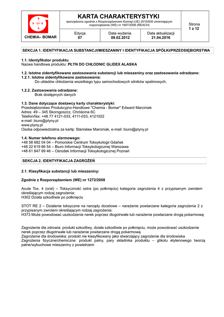 KARTA CHARAKTERYSTYKI sporządzona zgodnie z Rozporządzeniem Komisji (UE) 2015/830 zmieniającym rozporządzenie (WE) nr 1907/2006 (REACH) CHEMIA– BOMAR Edycja 07 Data wydania 09.02.2012 Strona 1 z 12 Data aktualizacji 21.04.2016 SEKCJA 1. IDENTYFIKACJA SUBSTANCJI/MIESZANINY I IDENTYFIKACJA SPÓŁKI/PRZEDSIĘBIORSTWA 1.1. Identyfikator produktu Nazwa handlowa produktu: PŁYN DO CHŁODNIC GLIDEX ALASKA 1.2. Istotne zidentyfikowane zastosowania substancji lub mieszaniny oraz zastosowania odradzane: 1.2.1. Istotne zidentyfikowane zastosowania: Do układów chłodzenia wszelkiego typu samochodowych silników spalinowych. 1.2.2. Zastosowania odradzane: Brak dostępnych danych 1.3. Dane dotyczące dostawcy karty charakterystyki: Przedsiębiorstwo Produkcyjno-Handlowe "Chemia - Bomar" Edward Marciniak Adres: 49 – 345 Skorogoszcz, Chróścina 6C Telefon/fax: +48 77 4121-033, 4111-033, 4121022 e-mail: [email protected] www.plyny.pl Osoba odpowiedzialna za kartę: Stanisław Marciniak, e-mail: [email protected] 1.4. Numer telefonu alarmowego: +48 58 682 04 04 – Pomorskie Centrum Toksykologii Gdańsk +48 22 619 66 54 – Biuro Informacji Toksykologicznej Warszawa +48 61 847 69 46 – Ośrodek Informacji Toksykologicznej Poznań SEKCJA 2. IDENTYFIKACJA ZAGROŻEŃ 2.1. Klasyfikacja substancji lub mieszaniny: Zgodnie z Rozporządzeniem (WE) nr 1272/2008 Acute Tox. 4 (oral) – Toksyczność ostra (po połknięciu) kategoria zagrożenia 4 z przypisanym zwrotem określającym rodzaj zagrożenia: H302 Działa szkodliwie po połknięciu STOT RE 2 – Działanie toksyczne na narządy docelowe – narażenie powtarzane kategoria zagrożenia 2 z przypisanym zwrotem określającym rodzaj zagrożenia: H373 Może powodować uszkodzenie nerek poprzez długotrwałe lub narażenie powtarzane drogą pokarmową Zagrożenie dla zdrowia: produkt szkodliwy, działa szkodliwie po połknięciu, może powodować uszkodzenie nerek poprzez długotrwałe lub narażenie powtarzane drogą pokarmową Zagrożenie dla środowiska: produkt nie klasyfikowany jako stwarzający zagrożenie dla środowiska Zagrożenia fizyczne/chemiczne: produkt palny, pary składnika produktu – glikolu etylenowego tworzą palne/wybuchowe mieszaniny z powietrzem KARTA CHARAKTERYSTYKI sporządzona zgodnie z Rozporządzeniem Komisji (UE) 2015/830 zmieniającym rozporządzenie (WE) nr 1907/2006 (REACH) CHEMIA– BOMAR Edycja 07 Data wydania 09.02.2012 Strona 2 z 12 Data aktualizacji 21.04.2016 2.2. Elementy oznakowania Zgodnie z Rozporządzeniem (WE) nr 1272/2008 Piktogramy: Hasło ostrzegawcze: Uwaga Zwroty określające rodzaj zagrożenia: H302 Działa szkodliwie po połknięciu H373 Może powodować uszkodzenie nerek poprzez długotrwałe lub narażenie powtarzane drogą pokarmową Zwroty określające środki ostrożności: Ogólne: P102 Chronić przed dziećmi Zapobieganie: P260 Nie wdychać par/rozpylonej cieczy P264 Dokładnie umyć ręce i twarz po użyciu P270 Nie jeść, nie pić i nie palić podczas używania produktu Reagowanie: P301 + P312 W PRZYPADKU POŁKNIĘCIA: W przypadku złego samopoczucia skontaktować się z OŚRODKIEM ZATRUĆ / lekarzem P330 Wypłukać usta Przechowywanie: Usuwanie: P501 Zawartość/pojemnik usuwać do firm posiadających odpowiednie uprawnienia, zgodnie z krajowymi/ międzynarodowymi przepisami Składnik stwarzający zagrożenie: glikol etylenowy 2.3. Inne zagrożenia: Produkt nie spełnia kryteriów PBT lub vPvB zgodnie z załącznikiem XIII rozporządzenia REACH. SEKCJA 3. SKŁAD/INFORMACJA O SKŁADNIKACH 3.1. Substancje Nie dotyczy 3.2. Mieszaniny Produkt jest mieszaniną. Skład: woda, glikol etylenowy*, gliceryna (glicerol)*, sól sodowa kwasu dwuetyloheksanowego, substancje pomocnicze nie klasyfikowane jako stwarzające zagrożenie Klasyfikację substancji stwarzających zagrożenie zawartych w produkcie podano zgodnie z tabelą 3.1 załącznika VI do Rozporządzenia Parlamentu Europejskiego i Rady (WE) nr 1272/2008 z uwzględnieniem jego aktualizacji, danych REACH, danych literaturowych i producenta. KARTA CHARAKTERYSTYKI sporządzona zgodnie z Rozporządzeniem Komisji (UE) 2015/830 zmieniającym rozporządzenie (WE) nr 1907/2006 (REACH) CHEMIA– BOMAR Edycja 07 Data wydania 09.02.2012 Strona 3 z 12 Data aktualizacji 21.04.2016 Nr CAS Nr WE Nr indeksowy REACH numer rejestracyjny Nazwa chemiczna Zawartość Kategorie zagrożenia Zwroty H 107-21-1 203-473-3 603-027-00-1 01-211945681628-XXXX Ethane-1,2-diol / glikol etylenowy* 25 – 35 % wag. Acute Tox. 4 (oral), STOT RE 2 H302, 373 19766-89-3 243-283-8 nie przypisany 01-211997908331-XXXX sodium 2ethylhexanoate 1 – 2 % wag. Repr. 2 H361 * - substancja, dla której określono wspólnotowe najwyższe dopuszczalne stężenia w środowisku pracy Znaczenie kategorii zagrożenia oraz zwrotów H patrz sekcja 16. SEKCJA 4. ŚRODKI PIERWSZEJ POMOCY 4.1. Opis środków pierwszej pomocy Zalecenia ogólne: W przypadku kontaktu z produktem wywołującym niedyspozycję natychmiast wezwać zawodową służbę zdrowia. Pokazać lekarzowi oznakowanie z karty charakterystyki produktu. Poinformować lekarza o udzielonej pierwszej pomocy poszkodowanemu. Nie podawać niczego doustnie osobie nieprzytomnej. Ochrona osób udzielających pierwszej pomocy: Nie należy podejmować żadnych działań, które stwarzałyby ryzyko dla ratownika chyba, że jest się odpowiednio przeszkolonym. Zalecane jest stosowanie środków ochrony osobistej (patrz sekcja 8). Skażenie skóry: Zdjąć zanieczyszczoną odzież. Skażoną skórę umyć dokładnie wodą. W przypadku wystąpienia utrzymujących się podrażnień, innych niepokojących objawów skonsultować się z lekarzem Skażenie oczu: Przemywać odpowiednim płynem do przemywania oczu lub czystą wodą, utrzymując powieki otwarte, przez co najmniej 15 minut. Usunąć soczewki kontaktowe, jeżeli poszkodowany je nosi. Jeżeli wystąpią objawy podrażnienia skontaktować się z okulistą. Narażenie inhalacyjne: Usunąć posz