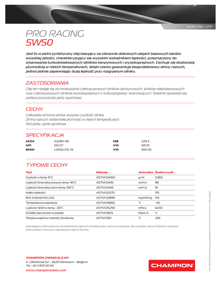 14/06/2016 / 27117 PRO RACING 5W50 Jest to w pełni syntetyczny olej bazujący na starannie dobranych olejach bazowych bardzo wysokiej jakości, charakteryzujący się wysokim wskaźnikiem lepkości, przeznaczony do smarowania turbodoładowanych silników benzynowych i wysokoprężnych. Cechuje się doskonałą płynnością w niskich temperaturach, dzięki czemu gwarantuje bezproblemowy zimny rozruch, jednocześnie zapewniając dużą lepkość przy rozgrzanym silniku. ZASTOSOWANIA Olej ten nadaje się do smarowania czterosuwowych silników benzynowych, silników wielozaworowych oraz czterosuwowych silników wysokoprężnych z turbosprężarką i wolnossących. Świetnie sprawdza się zwłaszcza podczas jazdy sportowej. CECHY Całkowita ochrona silnika: wysoka czystość silnika. Zimny rozruch: doskonała płynność w niskich temperaturach. Styl jazdy: jazda sportowa. SPECYFIKACJA ACEA A3/B4-08 MB 229.3 API SN/CF VW 501 01 BMW LONGLIFE-01 VW 505 00 Test Metoda Jednostka Średni wynik Gęstość w temp. 15°C ASTM D4052 g/ml 0.852 Lepkość kinematyczna przy temp. 40°C ASTM D445 mm²/s 118 Lepkość kinematyczna w temp. 100°C ASTM D445 mm²/s 18 Indeks lepkości ASTM D2270 170 B.N. (metoda HCLO4) ASTM D2896 mg KOH/g 9.6 Temperatura krzepnięcia ASTM D6892 °C -30 Lepkość SDW w temp. -30°C ASTM D5293 mPa.s 6200 Dodatki siarczanów w popiele ASTM D874 Mass % 1.1 Tempera zapłonu metodą Clevelanda ASTM D92 °C 235 Zastrzegamy sobie prawo do modyfikowania ogólnych charakterystyk naszych produktów, aby umożliwić naszym klientom czerpanie maksymalnych korzyści z najnowszych odkryć techniki. CHAMPION CHEMICALS NV G. Gilliotstraat 52 – 2620 Hemiksem – Belgium Tel. +32 3 870 00 00 www.championlubes.com The CHAMPION brand and design are registered trademarks of Champion Chemicals NV – Made in Belgium TYPOWE CECHY