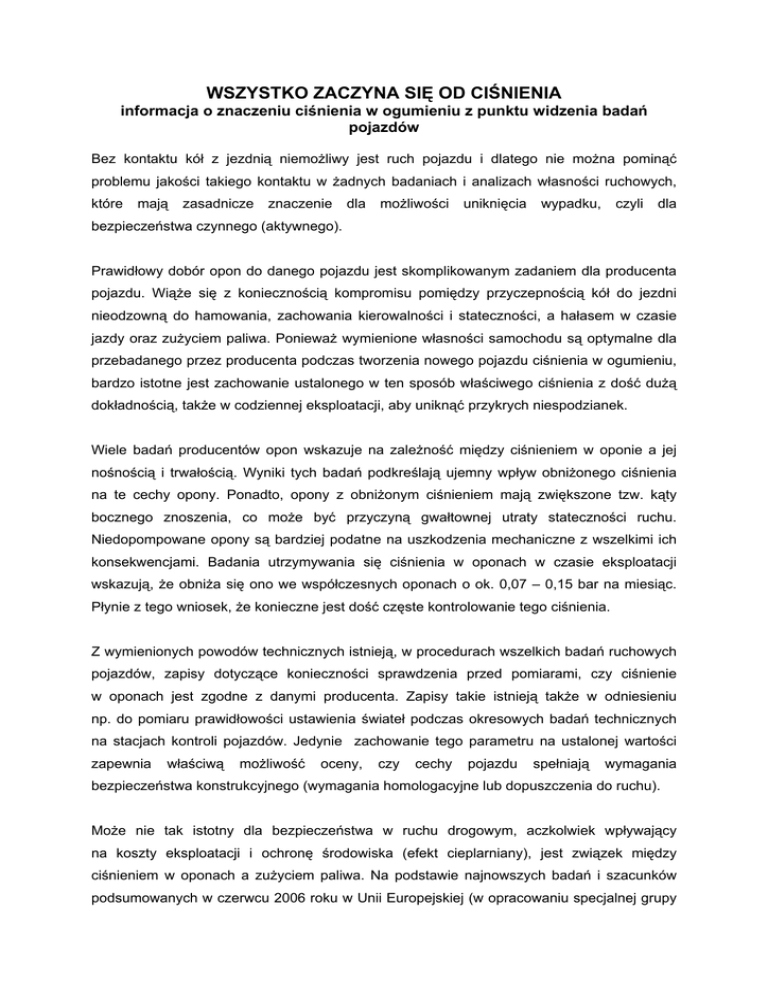 WSZYSTKO ZACZYNA SIĘ OD CIŚNIENIA informacja o znaczeniu ciśnienia w ogumieniu z punktu widzenia badań pojazdów Bez kontaktu kół z jezdnią niemożliwy jest ruch pojazdu i dlatego nie można pominąć problemu jakości takiego kontaktu w żadnych badaniach i analizach własności ruchowych, które mają zasadnicze znaczenie dla możliwości uniknięcia wypadku, czyli dla bezpieczeństwa czynnego (aktywnego). Prawidłowy dobór opon do danego pojazdu jest skomplikowanym zadaniem dla producenta pojazdu. Wiąże się z koniecznością kompromisu pomiędzy przyczepnością kół do jezdni nieodzowną do hamowania, zachowania kierowalności i stateczności, a hałasem w czasie jazdy oraz zużyciem paliwa. Ponieważ wymienione własności samochodu są optymalne dla przebadanego przez producenta podczas tworzenia nowego pojazdu ciśnienia w ogumieniu, bardzo istotne jest zachowanie ustalonego w ten sposób właściwego ciśnienia z dość dużą dokładnością, także w codziennej eksploatacji, aby uniknąć przykrych niespodzianek. Wiele badań producentów opon wskazuje na zależność między ciśnieniem w oponie a jej nośnością i trwałością. Wyniki tych badań podkreślają ujemny wpływ obniżonego ciśnienia na te cechy opony. Ponadto, opony z obniżonym ciśnieniem mają zwiększone tzw. kąty bocznego znoszenia, co może być przyczyną gwałtownej utraty stateczności ruchu. Niedopompowane opony są bardziej podatne na uszkodzenia mechaniczne z wszelkimi ich konsekwencjami. Badania utrzymywania się ciśnienia w oponach w czasie eksploatacji wskazują, że obniża się ono we współczesnych oponach o ok. 0,07 – 0,15 bar na miesiąc. Płynie z tego wniosek, że konieczne jest dość częste kontrolowanie tego ciśnienia. Z wymienionych powodów technicznych istnieją, w procedurach wszelkich badań ruchowych pojazdów, zapisy dotyczące konieczności sprawdzenia przed pomiarami, czy ciśnienie w oponach jest zgodne z danymi producenta. Zapisy takie istnieją także w odniesieniu np. do pomiaru prawidłowości ustawienia świateł podczas okresowych badań technicznych na stacjach kontroli pojazdów. Jedynie zachowanie tego parametru na ustalonej wartości zapewnia właściwą możliwość oceny, czy cechy pojazdu spełniają wymagania bezpieczeństwa konstrukcyjnego (wymagania homologacyjne lub dopuszczenia do ruchu). Może nie tak istotny dla bezpieczeństwa w ruchu drogowym, aczkolwiek wpływający na koszty eksploatacji i ochronę środowiska (efekt cieplarniany), jest związek między ciśnieniem w oponach a zużyciem paliwa. Na podstawie najnowszych badań i szacunków podsumowanych w czerwcu 2006 roku w Unii Europejskiej (w opracowaniu specjalnej grupy roboczej Komisji Europejskiej zajmującej się zużyciem paliwa przez samochody osobowe i lekkie samochody ciężarowe) stwierdzono, że obniżenie ciśnienia w oponie o 0,2 – 0,4 bar powoduje wzrost eksploatacyjnego zużycia paliwa od 1 – 2,5 %. Czy każdego na to stać? Warto też wspomnieć, że zbliża się nowa generacja opon, o zmniejszonych oporach toczenia. Wiadomo, że w tych oponach ciśnienie ma jeszcze większy wpływ na zużycie paliwa. Problem właściwego ciśnienia w oponach nie spotyka się jak dotąd z powszechnym zrozumieniem przez użytkowników pojazdów. Dlatego też kampania na ten temat znajduje poparcie w Instytucie. Dla porządku należy dodać, że ambitni producenci pojazdów wprowadzili w szeregu samochodów (nawet klasy kompakt) fabryczną, ciągłą kontrolę ciśnienia w oponach, przy czym dotyczy to, jak na razie, znikomego odsetka eksploatowanych w Europie pojazdów. Wojciech Przybylski, z-ca Dyrektora ds. techniki w Instytucie Transportu Samochodowego