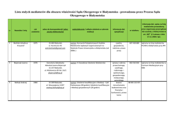 Lista stałych mediatorów dla obszaru właściwości Sądu Okręgowego w Białymstoku - prowadzona przez Prezesa Sądu Okręgowego w Białymstoku rok urodzenia adres do korespondencji/ adres poczty elektronicznej Bieliński Arkadiusz Krzysztof 1975 15-682 Białystok; ul. Kosmiczna 43 [email protected] 2. Bojarczyk Joanna 1978 Kancelaria Adwokacka Adwokat Joanna Bojarczyk 15-257 Białystok; ul. Mickiewicza 83 lok. 3U/1 [email protected] 3. Bołtryk Andrzej 1984 15-269 Białystok; ul. Waszyngtona 12/67 [email protected] Lp. Nazwisko i imię 1. wykształecenie / odbyte szkolenia w zakresie mediacji informacja dot. specjalizacji wyższe; Kierownik Podyplomowych Studiów Mediatorów Sądowych organizowanych na Wydziale Prawa Uniwersytetu w Białymstoku (od 2006r.) cywilne, gospodarcze, rodzinne, prawo pracy wyższe; IV Zawodowe Szkolenie Mediatorów wyższe; Szkolenie kwalifikacyjne z Mediacji - Cykl Podstawowy (40 godzin); Szkolenie kwalifikacyjne z Mediacji gospodarczych (20 godzin) nr telefonu 607 428 680 informacja dot. wpisu na listę mediatorów prowadzoną przez organizacje pozarządowe lub uczelnie, o której mowa w 2 art. 183 § 3 ustawy z dnia 17.11.1964r. kpc. wpisany na listę mediatorów PCAiM w Białymstoku przy IPH sprawy z zakresu 662 016 044 wpisana na listę mediatorów w prawa karnego, Centrum Mediacyjnym przy cywilnego, NRA rodzinnego i opiekuńczego, gospodarczego, medycznego, autorskiego branża: 48 692 222 871 nieruchomości, budownictwa oraz finansów i bankowości; prawo karne 4. Borys Pakieła Halina 1961 Podlaskie Centrum Arbitrażu i Mediacji 15-740 Białystok; ul. Antoniukowska 7 [email protected] wyższe; Szkoła Mediacji Rodzinnych (60 godzin); Warsztaty konstruowania ugód w sprawach karnych, nieletnich, cywilnych i rodzinnych (20 godzin); Specjalistyczne szkolenie międzynarodowe "Rozwiązywanie konfliktów międzykulturowych i transgranicznych"; Specjalistyczne szkolenie w zakresie alternatywnych sposobów rozwiązywania sporów w sprawach gospodarczych(40 godzin);Specjalistyczny kurs "Negocjacje i mediacje w oświacie" (32 godziny); Szkolenie dla prawników - Mediacje międzykulturowe; zawodowy kurs dla mediatorów w sporach zbiorowych i pracy (160 godzin); Szkolenie "Symulacja postępowań mediacyjnych", w tym mediacje w sporach zbiorowych ( 32 godziny); Szkolenie "Propagowanie Alternatywnych Metod Rozwiązywania Sporów; Konferencje i seminaria krajowe i międzynarodowe z zakresu ADR cywilne, rodzinne i opiekuńcze, rozwodowe (z podziałem majątku), spadkowe, pracownicze, ubezpieczeniowe, budownictwa, medyczne, dot. praw autorskich, gospodarcze, spory zbiorowe, mediacje transgraniczne, mediacje oświatowe, karne 609 269 554 5. Chmay Michał 1979 15-866 Białystok; ul.Zagumienna 9/1 m 23 [email protected] wyższe; Szkolenie dla Madiatorów LEX SERVICE (96 h) gospodarcze, cywilne, rozwodowe, spadki, rodzinne, pracy i ubezpieczeń społecznych 537 999 301 6. Chociej Adam Piotr 1973 Consolator - Centrum Mediacji 15-017 Białystok; ul. Łąkowa 9/38 [email protected] wyższe; Szkolenie kwalifikacyjne z Mediacji - Cykl Podstawowy (40 godzin); Szkolenie kwalifikacyjne z Mediacji gospodarczych (20 godzin) gospodarcze, cywilne, prawo pracy 602 877 998 wpisana na listę mediatorów: Krajowej Izby Mediatorów i Arbitrów; Centrum Wsparcia Przedsiębiorców Pracodawców RP; PCAiM w Białymstoku przy IPH wpisany na listę mediatorów Krajowej Izby Mediatorów i Arbitrów 7. Dunaj Katarzyna 1975 15-887 Białystok; ul. Sosnowa 47 [email protected] wyższe; Szkolenie kwalifikacyjne z Mediacji - Cykl Podstawowy (40 godzin); Szkolenie kwalifikacyjne z Mediacji gospodarczych (20 godzin); Szkolenie w ramach projektu "Propagowanie alternatywnych metod rozwiązywania sporów" w ramach Programu Operacyjnego Budowanie potencjału instytucjonalnego i współpraca w obszarze wymaru sprawiedliwości/Poprawa skuteczności wymiaru sprawiedliwości cywilne, gospodarcze, rodzinne, karne i karne nieletnich 607 880 222 8. Gromadka Dariusz 1973 Biuro Eksperckie UNIMEDIA Dariusz Gromadka 01-918 Warszawa ; ul. Nocznickiego 33 [email protected] wyższe; Szkolenie specjalistyczne z zakresu mediacji gospodarczych (24 h); udział w Kongresie Mediacji Mięczynarodowych oraz w sesjach warsztatowych: Mediacje transgraniczne, Mediacje w społeczneństwie wielokulturowym, Mediacje w Unii Europejskiej; Szkolenie "Sztuka negocjacji" - Gdańska Fundacja Kształecenia Menadżerów cywilne, gospodarcze, pracownicze, dot. zamówień publicznych, techniczne oraz międzynarodowe, wymagające dostępu do tajemnicy państwowej o klazuli: Ściśle tajne, COSMIC TOP SECRET, EU TOP SECRET, ESA TOP SECRET 501 290 911 wpisana na listę mediatorów Krajowej Izby Mediatorów i Arbitrów 9. Ignatowicz Grzegorz 1973 15-644 Białystok; ul. Sienkiewicza 6 lok. 1 wyższe; Seminarium pt. "Mediacja w sprawach cywilnych i gospodarczych w Europie - wyzwania i [email protected] perspektywy"; XI Szkoła Mediacji (65 godzin) l rozwody z podziałem majątku, prawo pracy, gospodarcze, majątkowe, rodzinne, spadkowe, odszkodowawcze, naruszenia dóbr osobistych oraz własności intelektualnej, karne 531 200 873 wpisany na listę mediatorów: Ośrodka Madiacji w przy Wyższej Szkole Menadżerskiej w Warszawie 510 162 925 wpisana na listę mediatorów:PCAiM w Białymstoku przy IPH; Stowarzyszenia Centrum Dialogu i Mediacji "Bliżej" w Opolu; Podlaskiego Ośrodka Mediacyjnego WEPKA w Łomży 10. Kleszczewska Ewa 1972 16-411 Szypliszki; zam. Rybalnia 1 [email protected] wyższe; Specjalistyczne Szkolenie z Mediacji Karnych i z Nieletnim Sprawcą Czynu Karalnego; 50 - godzina Szkoła Mediacji; Warsztat dot. konstruowania dokumentów mediacyjnych; Konferencja "Diagnoza Arbitrażu- Funkcjonowanie prawa o arbitrażu i kierunki postulowanych zmian"; Szkolenie "Prawnik w Mediacji" Seminarium pt. "Mediacja w sprawach cywilnych i gospodarczych w Europie - wyzwania i perspektywy". sprawy cywilne, gospodarcze i pracownicze 11. Leśniewski Miros