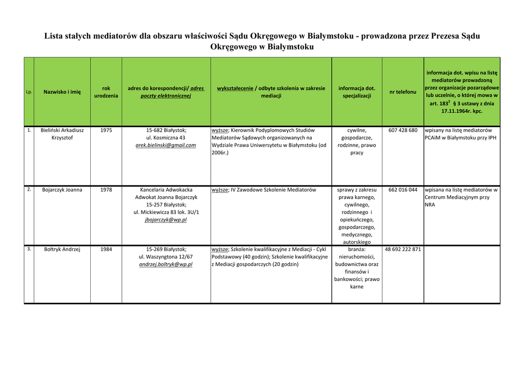Lista mediatorów stałych prowadzona przez Prezesa Sądu