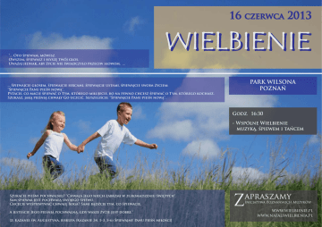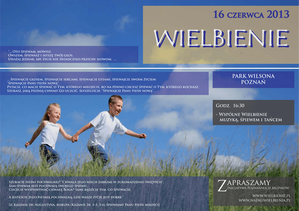 16 czerwca 2013 "... Oto śpiewam, mówisz. Owszem, śpiewasz i słyszę twój głos. Uważaj jednak, aby życie nie świadczyło przeciw słowom. ... WIELBIENIE PARK WILSONA POZNAŃ ... Śpiewajcie głosem, śpiewajcie sercami, śpiewajcie ustami, śpiewajcie swoim życiem: "Śpiewajcie Panu pieśń nową". Pytacie, co macie śpiewać o Tym, którego miłujecie, bo na pewno chcesz śpiewać o Tym, którego kochasz. Szukasz, jaką pieśnią chwały Go uczcić. Słyszeliście: "Śpiewajcie Panu pieśń nową". Godz. 16:30 - Wspólne Wielbienie muzyką, śpiewem i tańcem Szukacie pieśni pochwalnej? "Chwała Jego niech zabrzmi w zgromadzeniu świętych". Sam śpiewak jest pochwałą swojego śpiewu. Chcecie wyśpiewywać chwałę Boga? Sami bądźcie tym, co śpiewacie. A jesteście Jego pieśnią pochwalną, gdy wasze życie jest dobre." [z: Kazanie św. Augustyna, biskupa (Kazanie 34, 1-3. 5-6) Śpiewajmy Panu pieśń miłości] Z apraszamy Inicjatywa Poznańskich Muzyków www.wielbienie.pl www.nafaliwielbienia.pl