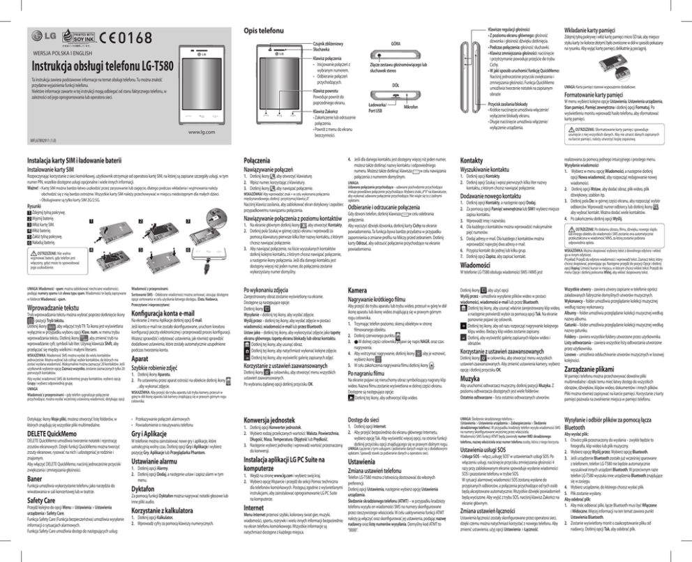 Opis telefonu Czujnik zbliżeniowy Słuchawka WERSJA POLSKA l ENGLISH Ta instrukcja zawiera podstawowe informacje na temat obsługi telefonu. Tu można znaleźć przydatne wyjaśnienia funkcji telefonu. Niektóre informacje zawarte w tej instrukcji mogą odbiegać od stanu faktycznego telefonu, w zależności od jego oprogramowania lub operatora sieci. Klawisz powrotu Powoduje powrót do poprzedniego ekranu. Klawisz Zakończ • Zakończenie lub odrzucenie połączenia. • Powrót z menu do ekranu bezczynności. www.lg.com MFL67892911 (1.0) Instalacja karty SIM i ładowanie baterii Połączenia Rozpoczynając korzystanie z sieci komórkowej, użytkownik otrzymuje od operatora kartę SIM, na której są zapisane szczegóły usługi, w tym numer PIN, wszelkie dostępne usługi opcjonalne i wiele innych informacji. Ważne! › Kartę SIM można bardzo łatwo uszkodzić przez zarysowanie lub zagięcie, dlatego podczas wkładania i wyjmowania należy 1. D otknij ikony , aby otworzyć klawiaturę. 2. Wpisz numer, korzystając z klawiatury. 3. Dotknij ikony , aby nawiązać połączenie. Instalowanie karty SIM obchodzić się z nią bardzo ostrożnie. Wszystkie karty SIM należy przechowywać w miejscu niedostępnym dla małych dzieci. › Obsługiwane są tylko karty SIM 2G/2.5G. Rysunki 1 Zdejmij tylną pokrywę. 2 Wyjmij baterię. 3 Włóż kartę SIM. 4 Włóż baterię. 5 Załóż tylną pokrywę. 6 Naładuj baterię. 1 2 SIM 3 SIM OSTRZEŻENIE: Nie wolno wyjmować baterii, gdy telefon jest włączony, gdyż może to spowodować jego uszkodzenie. 4 GÓRA Klawisz połączenia • Inicjowanie połączeń z wybranym numerem. • Odbieranie połączeń przychodzących. Instrukcja obsługi telefonu LG-T580 5 6 SIM Nawiązywanie połączeń WSKAZÓWKA! Aby wprowadzić znak + w celu wykonania połączenia międzynarodowego, dotknij i przytrzymaj klawisz „0”. Naciśnij klawisz zasilania, aby zablokować ekran dotykowy i zapobiec przypadkowemu nawiązaniu połączenia. Nawiązywanie połączenia z poziomu kontaktów 1. N a ekranie głównym dotknij ikony , aby otworzyć Kontakty. 2. Dotknij pola Szukaj w górnej części ekranu i wprowadź za pomocą klawiatury pierwsze kilka liter nazwy kontaktu, z którym chcesz nawiązać połączenie. 3. Aby nawiązać połączenie, na liście wyszukanych kontaktów dotknij kolejno kontaktu, z którym chcesz nawiązać połączenie, a następnie ikony połączenia. Jeśli dla danego kontaktu jest dostępny więcej niż jeden numer, do połączenia zostanie wykorzystany numer domyślny. Klawisze regulacji głośności • Z poziomu ekranu głównego: głośność dzwonka i głośność dźwięku dotknięcia. • Podczas połączenia: głośność słuchawki. • Klawisz zmniejszania głośności: naciśnięcie i przytrzymanie powoduje przejście do trybu Cichy. • W jaki sposób uruchomić funkcję QuickMemo: Naciśnij jednocześnie przyciski zwiększania i zmniejszania głośności. Funkcja QuickMemo umożliwia tworzenie notatek na zapisanym obrazie Złącze zestawu głośnomówiącego lub słuchawek stereo DÓŁ Ładowarka/ Port USB Przycisk zasilania/blokady • Krótkie naciśnięcie umożliwia włączenie/ wyłączenie blokady ekranu. • Długie naciśnięcie umożliwia włączenie/ wyłączenie urządzenia. Mikrofon 4. Jeśli dla danego kontaktu jest dostępny więcej niż jeden numer, możesz także dotknąć nazwy kontaktu i odpowiedniego numeru. Możesz także dotknąć klawisza w celu nawiązania połączenia z numerem domyślnym. UWAGA: Udawane połączenie przychodzące – udawane pochodzenie przychodzące imituje prawdziwe połączenie przychodzące. Wybierz znaki „#*#” na klawiaturze, aby wykonać udawane połączenie przychodzące. Nie wiąże się to z żadnymi opłatami. Odbieranie i odrzucanie połączenia Gdy dzwoni telefon, dotknij klawisza w celu odebrania połączenia. Aby wyciszyć dźwięk dzwonka, dotknij karty Cichy na ekranie powiadomienia. Ta funkcja bywa bardzo przydatna w przypadku zapomnienia o zmianie profilu na Milczy przed zebraniem. Dotknij karty Odrzuć, aby odrzucić połączenie przychodzące na ekranie powiadomienia. Kontakty Wyszukiwanie kontaktu 1. Dotknij opcji Kontakty. 2. Dotknij opcji Szukaj i wpisz pierwszych kilka liter nazwy kontaktu, z którym chcesz nawiązać połączenie. Dodawanie nowego kontaktu 1. D otknij opcji Kontakty, a następnie opcji Dodaj. 2. Za pomocą opcji Pamięć wewnętrzna lub SIM1 wybierz miejsce zapisu kontaktu. 3. Wprowadź imię i nazwisko. 4. Dla każdego z kontaktów można wprowadzić maksymalnie pięć numerów. 5. Dodaj adresy e-mail. Dla każdego z kontaktów można wprowadzić najwyżej dwa adresy e-mail. 6. Przypisz kontakt do jednej lub kilku grup. 7. Dotknij opcji Zapisz, aby zapisać kontakt. Wiadomości W telefonie LG-T580 obsługa wiadomości SMS i MMS jest Wkładanie karty pamięci Zdejmij tylną pokrywę i włóż kartę pamięci micro SD tak, aby miejsce styku karty (w kolorze złotym) było zwrócone w dół w sposób pokazany na rysunku. Aby wyjąć kartę pamięci, delikatnie ją pociągnij. UWAGA: Karta pamięci stanowi wyposażenie dodatkowe. Formatowanie karty pamięci W menu wybierz kolejno opcje Ustawienia, Ustawienia urządzenia, Stan pamięci, Pamięć zewnętrzna i dotknij opcji Formatuj. Po wyświetleniu monitu wprowadź hasło telefonu, aby sformatować kartę pamięci. OSTRZEŻENIE: Sformatowanie karty pamięci spowoduje usunięcie z niej wszystkich danych. Aby nie utracić danych zapisanych na karcie pamięci, należy utworzyć kopię zapasową. realizowana za pomocą jednego intuicyjnego i prostego menu. Wysyłanie wiadomości 1. Wybierz w menu opcję Wiadomości, a następnie dotknij opcji Nowa wiadomość, aby rozpocząć redagowanie nowej wiadomości. 2. Dotknij opcji Wstaw, aby dodać obraz, plik wideo, plik dźwiękowy, szablon itp. 3. Dotknij pola Do: w górnej części ekranu, aby rozpocząć wybór odbiorców. Wprowadź numer odbiorcy lub