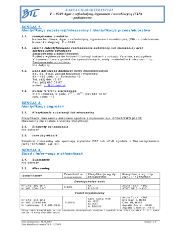 KARTA CHARAKTERYSTYKI P – 0249 Agar z cefsulodyną, irgasanem i novobiocyną (CIN) – podstawowe SEKCJA 1: Identyfikacja subst ancji/mieszani ny i identyfikacja przedsiębiorstwa 1.1. Identyfikator produktu N a z w a h a n d l o w a : A g a r z c e f s u l o d y n ą , i r g a s a n e m i n o v o b i o c y n ą ( C I N ) – p o d s t a wo we Numer katalogowy: P – 0249 1.2. Istotne zidentyfikowane zastosowania substancji lub mieszaniny oraz zastosowania odradzane Z a s t o s o wa n i a z i d e n t y f i k o wa n e : P o d ł o Ŝ e w y b i ó r c z e d o h o d o wl i i i z o l a c j i b a k t e r i i z r o d z a j u Y e r s i n i a , s z c z e g ó l n i e Y.enterocolityca z produktów Ŝywnościowych, wody, materiałów klinicznych i itp.. Z a s t o s o wa n i a o d r a d z a n e : Nie dotyczy 1.3. Dane dotyczące dostawcy karty charakterystyki B TL S p . z o . o . Z a k ł a d E n z y m ó w i P e p t o n ó w 9 3 – 4 9 2 Ł ó d ź , u l . B o l e s ł a wa 1 3 Te l . ( 4 2 ) 6 8 4 1 2 6 7 F a x. ( 4 2 ) 6 8 0 0 3 6 7 e-mail: [email protected] 1.4. Numer telefonu alarmowego 00 00 w dni robocze, w godz. 7 – 15 : (42) 684 12 67 całą dobę: 112 SEKCJA 2: Identyfikacja zagr oŜeń 2.1. Klasyfikacja substancji lub mieszaniny K l a s y f i k a c j a m i e s za n i n y d o k o n a n a zg o d n i e z k r y t e r i a m i d y r . 6 7 / 5 4 8 / E W G [ D S D ] : Mieszanina nie spełnia kryteriów klasyfikacji. 2.2. Elementy oznakowania Nie dotyczy 2.3. Inne zagroŜenia Składniki mieszaniny nie spełniają kryteriów PBT lub vPvB zgodnie z Rozporządzeniem (W E ) 1 9 0 7 / 2 0 0 6 , z a ł . X I I I . SEKCJA 3: Skład / informacj a o składnikach 3.1. Substancje Nie dotyczy 3.2. Mieszaniny Identyfikatory Z a wa r t o ś ć w mieszaninie Klasyfikacja wg dyr. 6 7 / 5 4 8 / EW G Klasyfikacja wg rozp. (W E ) n r 1 2 7 2 / 2 0 0 8 Deoksycholan sodu Nr CAS: 302-95-4 Nr W E: 206-132-7 0,83% Xn R:22-37 A c u t e T o x. 4 , H 3 0 2 STOT SE 3, H335 Fiolet krystaliczny Nr CAS: 548-62-9 Nr W E: 208-953-6 Nr indeksowy: 612-205-00-8 0,002% Carc. Cat.2; R45 Xn; R22 Xi; R41 N; R50/53 A c u t e T o x. 4 , H 3 0 2 Eye Dam.1, H318 Carc.1B, H350 Aquatic Acute1, H400 Aquatic Chronic1, H410 Peł n y tekst klasyfik acj i, w tym znaczenie stosowanych skrótów i sym bol i oraz treść zwrotów R, H – patrz sekcja 16 karty charakteryst yki. Data sporządzenia: 31.01.2002 Data aktualizacji (wersja V): 01.12.2011 Strona 1 z 8 KARTA CHARAKTERYSTYKI P – 0249 Agar z cefsulodyną, irgasanem i novobiocyną (CIN) – podstawowe SEKCJA 4: Środki pi erwszej pomocy 4.1. Opis środków pierwszej pomocy W d yc h a n i e : W yp r o wa d z i ć / w y n i e ś ć z a t r u t e g o n a ś wi e Ŝ e p o wi e t r z e . Z a p e w n i ć p o s z k o d o wa n e m u s p o k ó j , c h r o n i ć p r z e d u t r a t ą c i e p ł a . J e Ŝ e l i o s o b a n i e o d d y c h a w y k wa l i f i k o w a n y p e r s o n e l p o wi n i e n wykonać sztuczne oddychanie lub podać tlen. W przypadku utraty przytomności naleŜy u ł o Ŝ y ć p o s z k o d o w a n e g o w p o z y c j i b o c z n e j u s t a l o n e j i n a t y c h m i a s t we z wa ć p o m o c medyczną. Kontakt ze skórą: Zdjąć skaŜoną odzieŜ i natychmiast umyć zanieczyszczoną produktem skórę duŜą ilością b i e Ŝ ą c e j wo d y . W p r z y p a d k u w y s t ą p i e n i a p o d r a Ŝ n i e n i a z a s i ę g n ą ć p o r a d y m e d y c z n e j . Zanieczyszczona odzieŜ musi być dokładnie wyprana przed ponownym uŜyciem. Kontakt z oczami: W yj ą ć s z k ł a k o n t a k t o w e . P r z e m y ć o c z y d u Ŝ ą i l o ś c i ą l e t n i e j wo d y p r z e z o k . 1 5 m i n u t ( p r z y t r z y m u j ą c o d c h y l o n e p o wi e k i ) , u n i k a ć s i l n e g o s t r u m i e n i a wo d y z e w z g l ę d u n a r y z y k o u s z k o d z e n i a r o g ó wk i . W p r z y p a d k u z a n i e c z y s z c z e n i a j e d n e g o o k a , c h r o n i ć w t r a k c i e p r z e m y wa n i a d r u g i e o k o p r z e d z a n i e c z y s z c z e n i e m . Z a s i ę g n ą ć p o r a d y m e d y c z n e j . S p o Ŝ yc i e : J e Ŝ e l i p o s z k o d o w a n y j e s t c a ł k o wi c i e p r z y t o m n y p o wi n i e n d o k ł a d n i e w y p ł u k a ć wo d ą j a m ę u s t n ą . N a l e Ŝ y we z w a ć p o m o c m e d y c z n ą , p o k a z a ć o p a k o wa n i e , e t y k i e t ę l u b k a r t ę c h a r a k t e r y s t y k i . N i g d y n i e p o d a wa ć n i c z e g o d o u s t n i e o s o b i e n i e p r z y t o m n e j . 4.2. NajwaŜniejsze ostre i opóźnione objawy oraz skutki naraŜenia B e z p o ś r e d n i k o n t a k t z e s k ó r ą l u b z o k i e m m o Ŝ e p o wo d o w a ć z a c z e r wi e n i e n i e i podraŜnienie. SpoŜycie moŜe przyczynić się do podraŜnienia ust, gardła i Ŝołądka. Brak d o n i e s i e ń o n i e p o Ŝ ą d a n y c h s k u t k a c h l u b k r y t y c z n y c h z a g r o Ŝ e n i a c h p o d c z a s wd y c h a n i a . 4.3. Wskazania dotyczące wszelkiej natychmiastowej pomocy lekarskiej i szczególnego postępowania z poszkodowanym B e z s p e c j a l n e g o l e c z e n i a . L e c z y ć o b j a w o wo . SEKCJA 5: Postępowanie w pr zypadku poŜaru 5.1. Środki gaśnicze Odpowiednie środki gaśnicze: p i a n a , p r o s z k i g a ś n i c z e , wo d a Niewłaściwe środki gaśnicze: nie znane 5.2. Szczególne zagroŜenia związane z substancją lub mieszaniną B r a k s p e c y f i c z n e g o z a g r o Ŝ e n i a p o Ŝ a r o we g o l u b w y b u c h o w e g o . M a t e r i a ł z a wi e r a s u b s t a n c j ę b a r d z o t o k s y c z n ą d l a o r g a n i z m ó w wo d n y c h z d ł u g o t r wa ł y m i n a s t ę p s t w a m i . N i e d o p u ś c i ć d o p r z e d o s t a n i a s i ę d o s y s t e m ó w wo d n y c h , c i e k ó w o r a z s t u d z i e n e k . P r o d u k t y r o z k ł a d u m o g ą z a wi e r a ć : d w u t l e n e k wę g l a , t l e n e k wę g l a , t 
