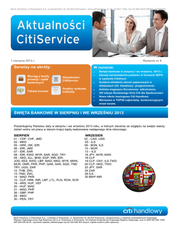 Bank Handlowy w Warszawie S.A. ul.Senatorska 16, 00-923 Warszawa, www.citihandlowy.pl, tel. 22 657 7200, fax 22 692 5023 SWIFT: CITIPLPX 1 sierpnia 2013 r. Wydanie nr 8 Serwisy na skróty: W numerze: Wyciąg z taryfy prowizji i opłat bankowych Aktualności CitiService Tabela kursów Analizy rynkowe CitiDaily Święta bankowe w sierpniu i we wrześniu 2013 r. Zasady wprowadzania przelewu w formacie SEPA w systemie Citidirect. Godzina składania zleceń papierowych w Oddziałach Citi Handlowy– przypomnienie. Ankieta magazynu Euromoney zakończona. VIII edycja Światowego Dnia Citi dla Społeczności Nowa oferta leasingowa Citi Handlowy Warszawa w TOP50 najbardziej konkurencyjnych miast świata. ŚWIĘTA BANKOWE W SIERPNIU I WE WRZEŚNIU 2013 Prezentujemy Państwu daty w sierpniu i we wrześniu 2013 roku, w których zlecenia ze względu na święto waluty (dzień wolny od pracy w danym kraju) będą realizowane następnego dnia roboczego. SIERPIEŃ WRZESIEŃ 01 - CDF, CHF, JMD 02 - MKD 05 - HRK, ISK, IDR 06 - IDR, JMD 07 - IDR, SAR 08 - IDR, KWD, MYR, SAR, SGD, TRY 09 - AED, ALL, BHD, EGP, INR, IDR, JOD, KES, KWD, LBP, MAD, MKD, MYR, MWK, MUR, OMR, PKR, PHP, QAR, SAR, SGD, TND TRY, UGX, ZAR 12 -THB, ZWL 13 -TND, ZWL 14 - MAD, PKR 15 - CLP, HRK, INR, LBP, LTL, PLN, RON, SCR 19 - ARS, HUF, VEF 20 - HUF, MAD 21 - MAD, PHP 26 - GBP, PHP 28 - MKD 30 - PEN, TRY 02 - CAD, USD 05 - ILS 06 - BGN, ILS 10 - MUR 13 – ILS 16 JPY, MYR, MXN 18 CLP 19 CLP, CNY, ILS TWD 20 CLP, HKD, TWD 23 JPY, SAR 24 ZAR 26 ILS 30 BWP INR Bank Handlowy w Warszawie S.A. z siedzibą w Warszawie, ul. Senatorska 16, 00-923 Warszawa, zarejestrowany w rejestrze przedsiębiorców Krajowego Rejestru Sądowego przez Sąd Rejonowy dla m.st. Warszawy w Warszawie, XII Wydział Gospodarczy Krajowego Rejestru Sądowego, pod nr KRS 000 000 1538; NIP 526-030-02-91; wysokość kapitału zakładowego wynosi 522.638.400 złotych, kapitał został w pełni opłacony. ZASADY WPROWADZANIA PRZELEWU ZAGRANICZNEGO W FORMIE SEPA W SYSTEMIE BANKOWOŚCI ELEKTRONICZNEJ CITIDIRECT Warto pamiętać, które pola należy wypełnić w systemie Citidirect, aby Państwa przelew był zrealizowany w formacie SEPA. Poniżej przedstawiamy podstawowe zasady wprowadzania zlecenia w formacie SEPA: System Citidirect Classic: Podręcznik strona 13 http://www.citihandlowy.pl/poland/citidirect/polish/pdf/platnosci_pl.pdf Numer rachunku beneficjenta - Musi zawierać rachunek w formacie IBAN bez żadnych znaków dodatkowych lub przerw, Nazwa/ Adres banku beneficjenta - Musi zawierać wyłącznie adres SWIFT banku beneficjenta bez spacji, Opłaty - zawsze wspólne, Waluta - EUR, Inne instrukcje - pole musi pozostać puste. System Citidirect EB: Podręcznik strona 17 http://www.citibank.pl/poland/citidirecteb/polish/pdf/podrecznik_cdeb.pdf Metoda płatności - NO ROUTING METHOD, Nazwa Banku Beneficjenta - Musi zawierać adres SWIFT banku beneficjenta bez spacji, Kod banku beneficjenta – to pole musi być puste, Opłaty - zawsze wspólne, Numer konta beneficjenta - Musi zawierać wyłącznie rachunek w formacie IBAN bez żadnych znaków dodatkowych lub przerw, Waluta - EUR, Inne instrukcje - pole musi pozostać puste. Pozostałe pola, które nie są wymagane przez system do wypełnienia muszą zostać puste. GODZINA SKŁADANIA ZLECEŃ PAPIEROWYCH W ODDZIAŁACH CITI HANDLOWY— PRZYPOMNIENIE Pragniemy przypomnieć, że godzina graniczna zleceń papierowych złożonych w Oddziałach Citi Handlowy lub przesłanych faksem kluczowanym, których realizacja ma być wykonana tego samego dnia z VD+0 to godzina 10:00. Instrukcje papierowe otrzymane po tej godzinie będą realizowane w następnym dniu roboczym. Bank Handlowy w Warszawie S.A. z siedzibą w Warszawie, ul. Senatorska 16, 00-923 Warszawa, zarejestrowany w rejestrze przedsiębiorców Krajowego Rejestru Sądowego przez Sąd Rejonowy dla m.st. Warszawy w Warszawie, XII Wydział Gospodarczy Krajowego Rejestru Sądowego, pod nr KRS 000 000 1538; NIP 526-030-02-91; wysokość kapitału zakładowego wynosi 522.638.400 złotych, kapitał został w pełni opłacony. ANKIETA MAGAZYNU EUROMONEY ZAKOŃCZONA 5 lipca zakończyła się tegoroczna ankieta elitarnego magazynu Euromoney, mająca wyłonić bank świadczący najlepsze usługi w zakresie zarządzania gotówką. Wyniki Ankiety zostaną ogłoszone jesienią tego roku. Brytyjski magazyn Euromoney to obok Financial Times i The Economist najbardziej prestiżowy europejski magazyn finansowy. Pragniemy już dziś serdecznie podziękować za Państwa zaangażowanie i uznanie. Każdy oddany głos ma ogromne znaczenie i jest dla nas bardzo cenny. DZIĘKUJEMY :) VIII EDYCJA ŚWIATOWEGO DNIA CITI DLA SPOŁECZNOŚCI Miiło nam poinformować, że zakończyła się kolejna, VIII już edycja Światowego Dnia Citi dla Społeczności. Jest to międzynarodowe święto wolontariatu, podczas którego pracownicy Citi wraz z rodzinami i przyjaciółmi działają na rzecz społeczności lokalnych. W tym roku do projektu zgłosiło się 66 000 wolontariuszy z całego świata. Koordynatorem wolontariatu w Citi Handlowy jest Fundacja Kronenberga przy Citi Handlowy. W Polsce zrealizowaliśmy rekordową liczbę 132 projektów, dzięki którym dotarliśmy do ponad 18 000 potrzebujących. W sumie na rzecz lokalnych społeczności pracowało ponad 1600 wolontariuszy, zarówno z Citi Handlowy, Spółek Citi działających w Polsce, jak i członkowie ich rodzin, znajomi oraz Klienci. Wśród działań podjętych przez wolontariuszy znalazły się prace remontowo-budowlane w placówkach wychowawczych, prace porządkowe w schroniskach dla zwierząt oraz sprzątanie terenów również zajęć artystycznych dla dzieci, leśnych. Nie zabrakło ciekawych wycieczek dla podopiecznych czy zajęć związanych z edukacją finansową. Swój czas wolontariusze spędzali również z osobami niepełnosprawnymi, ucząc ich m.in. udzielania pierwszej pomocy. Święto wolontariatu z roku na rok cieszy się coraz większ