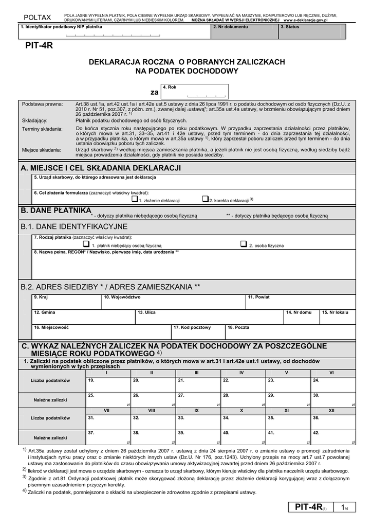 POLTAX POLA JASNE WYPEŁNIA PŁATNIK, POLA CIEMNE WYPEŁNIA URZĄD SKARBOWY. WYPEŁNIAĆ NA MASZYNIE, KOMPUTEROWO LUB RĘCZNIE, DUŻYMI, DRUKOWANYMI LITERAMI, CZARNYM LUB NIEBIESKIM KOLOREM. MOŻNA SKŁADAĆ W WERSJI ELEKTRONICZNEJ www.e-deklaracje.gov.pl 2. Nr dokumentu 1. Identyfikator podatkowy NIP płatnika 3. Status └────┴────┴────┴────┴────┴────┴────┴────┴────┴────┘ PIT-4R DEKLARACJA ROCZNA O POBRANYCH ZALICZKACH NA PODATEK DOCHODOWY za Podstawa prawna: Składający: Terminy składania: Miejsce składania: 4. Rok └────┴────┴────┴────┘ Art.38 ust.1a, art.42 ust.1a i art.42e ust.5 ustawy z dnia 26 lipca 1991 r. o podatku dochodowym od osób fizycznych (Dz.U. z 2010 r. Nr 51, poz.307, z późn. zm.), zwanej dalej ustawą"; art.35a ust.4a ustawy, w brzmieniu obowiązującym przed dniem ” 26 października 2007 r. 1) Płatnik podatku dochodowego od osób fizycznych. Do końca stycznia roku następującego po roku podatkowym. W przypadku zaprzestania działalności przez płatników, o których mowa w art.31, 33–35, art.41 i 42e ustawy, przed tym terminem - do dnia zaprzestania tej działalności, a w przypadku płatnika, o którym mowa w art.35a ustawy 1), który zaprzestał poboru zaliczek przed tym terminem - do dnia ustania obowiązku poboru tych zaliczek. Urząd skarbowy 2) według miejsca zamieszkania płatnika, a jeżeli płatnik nie jest osobą fizyczną, według siedziby bądź miejsca prowadzenia działalności, gdy płatnik nie posiada siedziby. A. MIEJSCE I CEL SKŁADANIA DEKLARACJI 5. Urząd skarbowy, do którego adresowana jest deklaracja 6. Cel złożenia formularza (zaznaczyć właściwy kwadrat): 1. złożenie deklaracji 2. korekta deklaracji 3) B. DANE PŁATNIKA * - dotyczy płatnika niebędącego osobą fizyczną ** - dotyczy płatnika będącego osobą fizyczną B.1. DANE IDENTYFIKACYJNE 7. Rodzaj płatnika (zaznaczyć właściwy kwadrat): 2. osoba fizyczna 1. płatnik niebędący osobą fizyczną 8. Nazwa pełna, REGON* / Nazwisko, pierwsze imię, data urodzenia ** B.2. ADRES SIEDZIBY * / ADRES ZAMIESZKANIA ** 9. Kraj 10. Województwo 12. Gmina 11. Powiat 13. Ulica 16. Miejscowość 14. Nr domu 17. Kod pocztowy 15. Nr lokalu 18. Poczta C. WYKAZ NALEŻNYCH ZALICZEK NA PODATEK DOCHODOWY ZA POSZCZEGÓLNE MIESIĄCE ROKU PODATKOWEGO 4) 1. Zaliczki na podatek obliczone przez płatników, o których mowa w art.31 i art.42e ust.1 ustawy, od dochodów wymienionych w tych przepisach I Liczba podatników II III IV V VI 19. 20. 21. 22. 23. 24. 25. 26. 27. 28. 29. 30. Należne zaliczki zł zł VII Liczba podatników zł VIII zł IX zł X zł XI XII 31. 32. 33. 34. 35. 36. 37. 38. 39. 40. 41. 42. Należne zaliczki zł zł zł zł zł zł 1) Art.35a ustawy został uchylony z dniem 26 października 2007 r. ustawą z dnia 24 sierpnia 2007 r. o zmianie ustawy o promocji zatrudnienia i instytucjach rynku pracy oraz o zmianie niektórych innych ustaw (Dz.U. Nr 176, poz.1243). Uchylony przepis na mocy art.7 ust.7 powołanej ustawy ma zastosowanie do płatników do czasu obowiązywania umowy aktywizacyjnej zawartej przed dniem 26 października 2007 r. 2) Ilekroć w deklaracji jest mowa o urzędzie skarbowym - oznacza to urząd skarbowy, którym kieruje właściwy dla płatnika naczelnik urzędu skarbowego. 3) Zgodnie z art.81 Ordynacji podatkowej płatnik może skorygować złożoną deklarację przez złożenie deklaracji korygującej wraz z dołączonym pisemnym uzasadnieniem przyczyn korekty. 4) Zaliczki na podatek, pomniejszone o składki na ubezpieczenie zdrowotne zgodnie z przepisami ustawy. PIT-4R (3) 1/4 POLA JASNE WYPEŁNIA PŁATNIK, POLA CIEMNE WYPEŁNIA URZĄD SKARBOWY. WYPEŁNIAĆ NA MASZYNIE, KOMPUTEROWO LUB RĘCZNIE, DUŻYMI, DRUKOWANYMI LITERAMI, CZARNYM LUB NIEBIESKIM KOLOREM. MOŻNA SKŁADAĆ W WERSJI ELEKTRONICZNEJ www.e-deklaracje.gov.pl POLTAX 2. Zaliczki na podatek obliczone przez płatników, o których mowa w art.33-35 ustawy, od dochodów wymienionych w tych przepisach I II III 44. 43. Należne zaliczki zł 50. 49. zł 53. zł zł XII XI 52. zł zł X 51. 48. zł IX VI 47. zł VIII V 46. zł VII IV 45. 54. zł zł zł 3. Suma należnych zaliczek za poszczególne miesiące roku podatkowego wykazanych w wierszach 1 i 2 I II 62. zł 65. zł zł XII XI 64. zł 60. zł X 63. zł 59. zł IX VI V 58. zł VIII 61. IV 57. zł VII Suma należnych zaliczek III 56. 55. 66. zł zł zł 4. Zaliczki na podatek, których pobór został ograniczony na podstawie art.32 ust.2 ustawy I II 74. zł 77. zł zł XII XI 76. zł 72. zł X 75. zł 71. zł IX VI V 70. zł VIII 73. IV 69. zł VII Kwoty zaliczek III 68. 67. 78. zł zł zł 5. Zaliczki, które przypadały do pobrania w związku z ograniczeniem poboru zaliczek w poprzednich miesiącach na podstawie art.32 ust.2 ustawy I II 86. zł 89. zł zł XII XI 88. zł 84. zł X 87. zł 83. zł IX VI V 82. zł VIII 85. IV 81. zł VII Kwoty zaliczek III 80. 79. 90. zł zł zł 6. Dodatkowo pobrany podatek wynikający z rozliczenia za rok ubiegły I II III 92. 91. Kwoty podatku zł zł VIII V VI XI XII 94. zł VII IV 93. zł IX X 7. Nadpłaty wynikające z rozliczenia za rok ubiegły oraz zwrot nadpłat w gotówce, zaliczone na poczet należnej zaliczki I II 95. Kwota nadpłaty zaliczonej 101. zł PIT-4R (3) 2/4 zł zł X 103. zł XII XI 104. zł 100. zł IX 102. 99. zł VIII VI V 98. zł VII IV 97. zł oraz zwróconej w gotówce III 96. 105. zł 106. zł zł POLTAX POLA JASNE WYPEŁNIA PŁATNIK, POLA CIEMNE WYPEŁNIA URZĄD SKARBOWY. WYPEŁNIAĆ NA MASZYNIE, KOMPUTEROWO LUB RĘCZNIE, DUŻYMI, DRUKOWANYMI LITERAMI, CZARNYM LUB NIEBIESKIM KOLOREM. MOŻNA SKŁADAĆ W WERSJI ELEKTRONICZNEJ www.e-deklaracje.gov.pl 8. Pobrany podatek, przekazany na PFRON oraz zakładowy fundusz rehabilitacji osób niepełnosprawnych albo zakładowy fundusz aktywności I II III 108. 107. Kwoty podatku zł 113. zł X 115. 