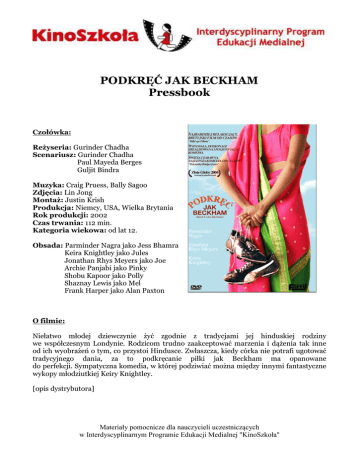 PODKRĘĆ JAK BECKHAM Pressbook Czołówka: Reżyseria: Gurinder Chadha Scenariusz: Gurinder Chadha Paul Mayeda Berges Guljit Bindra Muzyka: Craig Pruess, Bally Sagoo Zdjęcia: Lin Jong Montaż: Justin Krish Produkcja: Niemcy, USA, Wielka Brytania Rok produkcji: 2002 Czas trwania: 112 min. Kategoria wiekowa: od lat 12. Obsada: Parminder Nagra jako Jess Bhamra Keira Knightley jako Jules Jonathan Rhys Meyers jako Joe Archie Panjabi jako Pinky Shobu Kapoor jako Polly Shaznay Lewis jako Mel Frank Harper jako Alan Paxton O filmie: Niełatwo młodej dziewczynie żyć zgodnie z tradycjami jej hinduskiej rodziny we współczesnym Londynie. Rodzicom trudno zaakceptować marzenia i dążenia tak inne od ich wyobrażeń o tym, co przystoi Hindusce. Zwłaszcza, kiedy córka nie potrafi ugotować tradycyjnego dania, za to podkręcanie piłki jak Beckham ma opanowane do perfekcji. Sympatyczna komedia, w której podziwiać można między innymi fantastyczne wykopy młodziutkiej Keiry Knightley. [opis dystrybutora] Materiały pomocnicze dla nauczycieli uczestniczących w Interdyscyplinarnym Programie Edukacji Medialnej "KinoSzkoła" O twórcy: Gurinder Chadha Urodzona w Kenii w rodzinie pochodzącej z Indii, jednak wychowana w Londynie. W latach 80. pracowała jako dziennikarka radiowa dla BBC, karierę filmową zaczęła od filmów dokumentalnych. W 1990 zrealizowała dla Channel 4 „I'm British But...”, dokument o młodych Hindusach. Także później jej filmy będą poświęcone najczęściej mieszkającym w Wielkiej Brytanii przybyszom z Azji. W pełnym metrażu debiutowała na początku lat 90. Najbardziej znane jej filmy to „Bhaji on the Beach” (1993), „Podkręć jak Beckham” (2002) oraz „Duma i uprzedzenie” (2004). „Duma i uprzedzenie” to adaptacja powieści Jane Austen, a jej akcja została przeniesiona w realia Indii. Za wkład w rozwój filmu została odznaczona Orderem Imperium Brytyjskiego. Jej mężem jest reżyser Paul Mayeda Berges. [źródło: Wikipedia.pl] O aktorach: Parminder Nagra Brytyjska aktoka pochodzenia indyjskiego. Międzynarodowej publice dała się poznać jako dr Neela Rasgotra w znanym amerykańskim serialu telewizyjnym o tematyce medycznej - „Ostry dyżur”, jednak dopiero dzięki roli w filmie „Podkręć jak Beckham” zyskała właściwe uznanie. Keira Knightley Brytyjska aktorka, córka Sharman Macdonald, nagradzanej autorki sztuk teatralnych, oraz aktora Willa Knightleya. Zadebiutowała w wieku siedmiu lat, rolą w serialu telewizyjnym „Screen One”, dwa lata później grała w swoim pierwszym filmie fabularnym, „A Village Affair” (1994). Sukces przyszedł wraz z otrzymaniem drugoplanowej roli służącej królowej Amidali w filmie George'a Lucasa „Gwiezdne Wojny: część I – Mroczne Widmo”, jednak prawdziwym przełomem okazała się rola w filmie „Podkręć jak Beckham” (2002). Następnie kariera aktorki rozwijała się, Keira otrzymała główną rolę kobiecą w filmie Gore'a Verbinskiego „Piraci z Karaibów: Klątwa Czarnej Perły”. Obraz stał się początkiem popularnej i dochodowej serii, a Keira grała u boku takich gwiazd jak Johnny Depp, Orlando Bloom czy Geoffrey Rush. W 2005 roku, odgrywała postać Elizabeth Bennet w adaptacji powieści Jane Austen „Duma i uprzedzenie” w reżyserii Gurinder Chadha. Za rolę w tym obrazie otrzymała swoją pierwszą w karierze nominację do najlepszej aktorki pierwszoplanowej. Niespełna dwa lata później wystąpiła w filmie „Pokuta”, za którego otrzymała nominację do Złotego Globu i nagrody BAFTA. Materiały pomocnicze dla nauczycieli uczestniczących w Interdyscyplinarnym Programie Edukacji Medialnej "KinoSzkoła" Jonathan Rhys Meyers Irlandzki aktor filmowy i telewizyjny. Rozgłos i uznanie przyniósł mu udział w filmie „Idol” (1998), w którym wcielił się w postać gwiazdora rocka wzorowaną na Jobriathu. Od tego czasu najczęściej obsadzany jest w rolach charakterystycznych, ale niejednoznacznych, które niepokoją amoralnymi poglądami i raczej nie budzą sympatii; Pokonał 200. kandydatów do tytułowej kreacji 'króla rock and rolla' w telewizyjnym dramacie biograficznym CBS Elvis – Zanim został królem (2005) i otrzymał Złoty Glob, Satellite Award oraz nominację do nagrody Emmy. W serialu BBC/HBO Dynastia Tudorów (2007-2008) wcielił się w postać młodego króla Henryka VIII, za którą był nominowany do nagrody Złotego Globu. [informacje źródłowe: wikipedia.pl] Recenzja: O zacieraniu się różnic kulturowychi narastaniu pokoleniowych Obsypany deszczem prestiżowych nagród (np. w Locarno i Toronto - Publiczności) i nominacji (Rotterdam, BAFTA) "Podkręć jak Beckham" jest komedią (nie pierwszą zresztą) o życiu Hindusów w Anglii, o zacieraniu się różnic kulturowych i narastaniu pokoleniowych. O dobrych ojcach, składających swe przekonania religijne i dotyczące rodziny na ołtarzu miłości do dzieci. Choć te są wciąż naciskane przez rodziców do obrania "prawidłowej" drogi życiowej: szybkie małżeństwo z innym Hindusem, zakaz spotykania się z niebieskookimi blondynami i - co jest kluczowe dla tego obrazu - dotyczący dziewczyn zakaz gry w piłkę nożną. A Jess, której przeznaczono los prawnika, kocha kopać. I nie jest jedyną przedstawicielką płci pięknej o takich zainteresowaniach. Pewnego dnia spotyka Jules, Brytyjkę z krwi i kości, ojca i matki, która werbuje ją do semi-profesjonalnej żeńskiej drużyny futbolowej. Ponieważ rodzice zabraniają jej takiego hobby, Jess wszystko przed nimi ukrywa. Gdy prawda wychodzi na jaw, a jej siostra za mąż, zaczyna się prawdziwa walka przekonań. Film znacznie lepszy niż jego tytuł - dowcipny w mądry sposób, w treści nie tylko ciekawy, ale i ważki. W jednej z głównych ról Keira Knightley, dla której była to przepustka do świata wielkiego kina. http://www.stopklatka.pl/film/film.asp?fi=12455&sekcja=recenzja&ri=1582 Autor: Łukasz Figielski, Stop