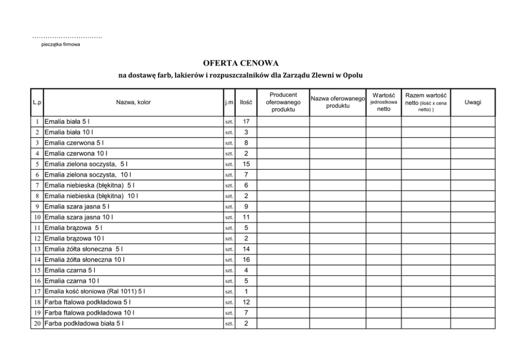 ………………………….. pieczątka firmowa OFERTA CENOWA na dostawę farb, lakierów i rozpuszczalników dla Zarządu Zlewni w Opolu L.p Nazwa, kolor j.m Ilość 1 Emalia biała 5 l szt. 17 2 Emalia biała 10 l szt. 3 3 Emalia czerwona 5 l szt. 8 4 Emalia czerwona 10 l szt. 2 5 Emalia zielona soczysta, 5 l szt. 15 6 Emalia zielona soczysta, 10 l szt. 7 7 Emalia niebieska (błękitna) 5 l szt. 6 8 Emalia niebieska (błękitna) 10 l szt. 2 9 Emalia szara jasna 5 l szt. 9 10 Emalia szara jasna 10 l szt. 11 11 Emalia brązowa 5 l szt. 5 12 Emalia brązowa 10 l szt. 2 13 Emalia żółta słoneczna 5 l szt. 14 14 Emalia żółta słoneczna 10 l szt. 16 15 Emalia czarna 5 l szt. 4 16 Emalia czarna 10 l szt. 5 17 Emalia kość słoniowa (Ral 1011) 5 l szt. 1 18 Farba ftalowa podkładowa 5 l szt. 12 19 Farba ftalowa podkładowa 10 l szt. 7 20 Farba podkładowa biała 5 l szt. 2 Producent oferowanego produktu Wartość Nazwa oferowanego jednostkowa produktu netto Razem wartość netto (ilość x cena netto) ) Uwagi strona 1 L.p Nazwa, kolor 21 Farba do malowania prosto na rdzę 2,5 l kolor zielony, połysk j.m Ilość szt. 1 22 Farba do malowania prosto na rdzę 2,5 l kolor żółty, połysk 1 23 Farba do malowania prosto na rdzę 2,5 l kolor zielony, połysk 1 24 Farba poliuretanowa (chemoutwardzalna) żółta litr 10 25 Farba poliwynylowa szara litr 0,5 26 Farba poliwynylowa żółta siarkowa (RAL 1016) litr 80 27 Farba poliwynylowa żólta litr 10 28 Farba poliwynylowa zielona litr 10 29 Farba poliwynylowa podkladowa litr 10 30 Rozcieńczalnik do farb ftalowych i asfaltowych 5 l szt. 50 31 Rozcieńczalnik do farb chlorokauczukowych i poliwynylowych 5 l szt. 30 32 Rozcieńczalnik do farb chlorokauczukowych i poliwynylowych 0,5 l szt. 35 33 Lakier asfaltowy czarny 20 l* szt. 50 34 Farba chlorokauczukowa biała litr 21 35 Farba chlorokauczukowa zielona litr 35 36 Farba chlorokauczukowa żółta litr 262 37 Farba chlorokauczukowa niebieska litr 5 38 Farba chlorokauczukowa szara jasna litr 275 39 Farba chlorokauczukowa czarna litr 40 40 Farba chlorokauczukowa czerwona litr 5 41 Farba chlorokauczukowa brązowa litr 20 42 Farba chlorokauczukowa podkładowa litr 180 43 Farba emulsyjna biała uniwersalna matowa 10 l 44 Farba emulsyjna biała uniwersalna matowa 20 l szt. 19 szt. 7 45 Emulsja fasadowa baiała matowa 10 l 46 Farba emulsyjna biała wewnętrzna mat. 10 l szt. 6 szt. 18 Producent oferowanego produktu Nazwa oferowanego produktu Wartość jednostkowa netto Razem wartość netto (ilość x cena netto) ) Uwagi strona 2 L.p Nazwa, kolor j.m Ilość 47 Impregnat do drewna 5 l kolor:palisander 48 Olej do drewna twardego kolor: palisander szt. 28 litr 160 49 Benzyna ekstrakcyjna 5 l szt. 7 50 Odrdzewiacz 5 l *¹ szt. 6 51 Aceton 5 l szt. 1 52 Grunt dyspersyjny pod farbę elewacyjną 5 l szt. 12 Producent oferowanego produktu Nazwa oferowanego produktu Wartość jednostkowa netto Razem wartość netto (ilość x cena netto) ) Uwagi dopuszcza się opakowania stanowiące 1/2 pojemności wymaganej przy zachowaniu zamawianej ilośći litrów *¹ dopuszcza się odchyłki pojemności +/- 10% Wartość oferty netto = Podatek VAT………. % = Wartośc oferty brutto = ………………………., …………………………… miejscowość data …………………………………………… (pieczęć i podpis osoby/ osób uprawnionej/ uprawnionych do reprezentowania wykonawcy/ wykonawców postępowaniu o udzielenie Zamówienia publicznego) strona 3