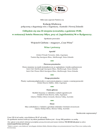 Miło nam zaprosić Państwa na Kolację Klubową połączoną z degustacją win z Argentyny, Australii i Nowej Zelandii Odbędzie się ona 22 sierpnia (czwartek), o godzinie 19.00, w restauracji hotelu Słoneczny Młyn, przy ul. Jagiellońskiej 96 w Bydgoszczy. Spotkanie prowadzi: Wojciech Giebuta – magazyn „Czas Wina” Wina i potrawy Aperitif Etchart Privado Torrontés, Salta, Argentyna Tuatara Bay Sauvignon Blanc, Marlborough, Nowa Zelandia Pierwsza przystawka Dorsz smażony na maśle tymiankowym ze szpinakiem i risotto szafranowym Saint Clair Marlborough Sauvignon Blanc, Marlborough, Nowa Zelandia Saint Clair Pioneer Block Sauvignon Blanc, Marlborough, Nowa Zelandia Druga przystawka Plastry wędzonej polędwiczki w czerwonym pieprzu z sosem z czarnej porzeczki Etchart Reserve Malbec, Salta, Argentyna Danie główne Rostbef duszony w rokitniku i ziołach ogrodowych Arnaldo B Gran Reserva, Salta, Argentyna Glaetzer Wallace Shiraz Grenache, Barossa Valley, Australia Deser Mus czekoladowy z lodami z gorzkiej czekolady i kremem owocowym Glaetzer Bishop Shiraz, Barossa Valley, Australia Serdecznie zapraszamy! Cena 120 zł od osoby, cena klubowa 90 zł* od osoby. Za spotkanie można rozliczyć się także punktami klubowymi – licząc 900 punktów za osobę. Aby zgłosić swój udział i dokonać przedpłaty proszę dzwonić pod numer telefonu 722 100 224 lub pisać na adres: [email protected] * Rabat w postaci „ceny klubowej” przysługuje członkom klubu, klientom sklepu oraz prenumeratorom Czasu Wina wraz z jedną osobą towarzyszącą.