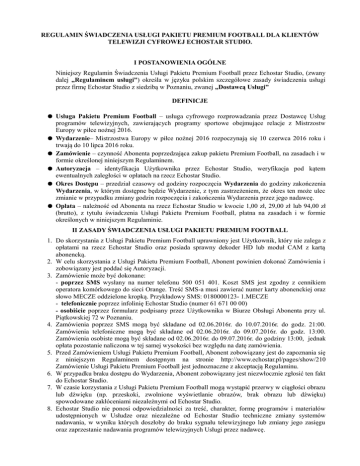 REGULAMIN ŚWIADCZENIA USŁUGI PAKIETU PREMIUM FOOTBALL DLA KLIENTÓW TELEWIZJI CYFROWEJ ECHOSTAR STUDIO. I POSTANOWIENIA OGÓLNE Niniejszy Regulamin Świadczenia Usługi Pakietu Premium Football przez Echostar Studio, (zwany dalej „Regulaminem usługi”) określa w języku polskim szczegółowe zasady świadczenia usługi przez firmę Echostar Studio z siedzibą w Poznaniu, zwanej „Dostawcą Usługi” DEFINICJE ● Usługa Pakietu Premium Football – usługa cyfrowego rozprowadzania przez Dostawcę Usług ● ● ● ● ● programów telewizyjnych, zawierających programy sportowe obejmujące relacje z Mistrzostw Europy w piłce nożnej 2016. Wydarzenie– Mistrzostwa Europy w piłce nożnej 2016 rozpoczynają się 10 czerwca 2016 roku i trwają do 10 lipca 2016 roku. Zamówienie – czynność Abonenta poprzedzająca zakup pakietu Premium Football, na zasadach i w formie określonej niniejszym Regulaminem. Autoryzacja – identyfikacja Użytkownika przez Echostar Studio, weryfikacja pod kątem ewentualnych zaległości w opłatach na rzecz Echostar Studio. Okres Dostępu – przedział czasowy od godziny rozpoczęcia Wydarzenia do godziny zakończenia Wydarzenia, w którym dostępne będzie Wydarzenie, z tym zastrzeżeniem, że okres ten może ulec zmianie w przypadku zmiany godzin rozpoczęcia i zakończenia Wydarzenia przez jego nadawcę. Opłata – należność od Abonenta na rzecz Echostar Studio w kwocie 1,00 zł, 29,00 zł lub 94,00 zł (brutto), z tytułu świadczenia Usługi Pakietu Premium Football, płatna na zasadach i w formie określonych w niniejszym Regulaminie. II ZASADY ŚWIADCZENIA USŁUGI PAKIETU PREMIUM FOOTBALL 1. Do skorzystania z Usługi Pakietu Premium Football uprawniony jest Użytkownik, który nie zalega z opłatami na rzecz Echostar Studio oraz posiada sprawny dekoder HD lub moduł CAM z kartą abonencką. 2. W celu skorzystania z Usługi Pakietu Premium Football, Abonent powinien dokonać Zamówienia i zobowiązany jest poddać się Autoryzacji. 3. Zamówienie może być dokonane: - poprzez SMS wysłany na numer telefonu 500 051 401. Koszt SMS jest zgodny z cennikiem operatora komórkowego do sieci Orange. Treść SMS-a musi zawierać numer karty abonenckiej oraz słowo MECZE oddzielone kropką. Przykładowy SMS: 0180000123- 1.MECZE - telefonicznie poprzez infolinię Echostar Studio (numer 61 671 00 00) - osobiście poprzez formularz podpisany przez Użytkownika w Biurze Obsługi Abonenta przy ul. Piątkowskiej 72 w Poznaniu. 4. Zamówienia poprzez SMS mogą być składane od 02.06.2016r. do 10.07.2016r. do godz. 21:00. Zamówienia telefoniczne mogą być składane od 02.06.2016r. do 09.07.2016r. do godz. 13:00. Zamówienia osobiste mogą być składane od 02.06.2016r. do 09.07.2016r. do godziny 13:00, jednak opłata pozostanie naliczona w tej samej wysokości bez względu na datę zamówienia. 5. Przed Zamówieniem Usługi Pakietu Premium Football, Abonent zobowiązany jest do zapoznania się z niniejszym Regulaminem dostępnym na stronie http://www.echostar.pl/pages/show/210 Zamówienie Usługi Pakietu Premium Football jest jednoznaczne z akceptacją Regulaminu. 6. W przypadku braku dostępu do Wydarzenia, Abonent zobowiązany jest niezwłocznie zgłosić ten fakt do Echostar Studio. 7. W czasie korzystania z Usługi Pakietu Premium Football mogą wystąpić przerwy w ciągłości obrazu lub dźwięku (np. przeskoki, zwolnione wyświetlanie obrazów, brak obrazu lub dźwięku) spowodowane zakłóceniami niezależnymi od Echostar Studio. 8. Echostar Studio nie ponosi odpowiedzialności za treść, charakter, formę programów i materiałów udostępnionych w Usłudze oraz niezależne od Echostar Studio techniczne zmiany systemów nadawania, w wyniku których doszłoby do braku sygnału telewizyjnego lub zmiany jego zasięgu oraz zaprzestanie nadawania programów telewizyjnych Usługi przez nadawcę. 9. Wydarzenie może być wykorzystana przez Użytkowników jedynie do własnego użytku osobistego na terytorium Rzeczypospolitej Polskiej. Zakazane jest: nagrywanie, publiczne udostępnianie Wydarzenia w jakiejkolwiek formie (niezależnie od tego czy jest ono połączone z pobieraniem z tego tytułu opłat czy nie) oraz jakiekolwiek inne wykorzystanie Wydarzenia niż opisane w zdaniu pierwszym niniejszego ustępu. 10. Echostar Studio nie ponosi odpowiedzialności za ewentualne szkody będące następstwem korzystania z Usługi Pakietu Premium Football oraz za skutki ujawnienia przez Abonenta treści udostępnionych w ramach Usługi Pakietu Premium Football osobom trzecim, w tym osobom niepełnoletnim, poprzez brak zachowania odpowiednich środków ostrożności. III PŁATNOŚĆ 1. Zamówienie Pakietu Premium Football wiąże się z koniecznością wniesienia opłaty na rzecz Echostar Studio w wysokości: a) Opłata Promocyjna 1,00 zł – dla dotychczasowych Użytkowników, którzy podpiszą umowę (lub aneks do dotychczasowej umowy) na conajmniej kolejne 24 miesiące na usługi Cyfrowej Telewizji pakiet Wygodny HD lub Bazowy HD w okresie od dnia wejścia w życie niniejszego regulaminu do dnia 09.07.2016 roku do godziny 13:00 b) Opłata Promocyjna 1,00 zł – dla Nowych Użytkowników, którzy podpiszą umowę na świadczenie na usługi Cyfrowej Telewizji pakiet Wygodny HD lub Bazowy HD na conajmniej 12 miesięcy w okresie od dnia wejścia w życie niniejszego regulaminu do dnia 09.07.2016 roku do godziny 13:00 c) Opłata Promocyjna 29,00 zł – dla dotychczasowych Użytkowników, którzy podpiszą umowę (lub aneks do dotychczasowej umowy) na kolejne 12 lub 18 miesiący na usługi Cyfrowej Telewizji pakiet Wygodny HD lub Bazowy HD w okresie od dnia wejścia w życie niniejszego regulaminu do dnia 09.07.2016 roku do godziny 13:00 d) Opłata Standardowa 94,00 zł – dla pozostałych Użytkowników Cyfrowej Telewizji pakiet Wygodny HD lub Bazowy HD 2. Opłata za Pakiet Premium Football zostanie wniesiona przez Użytkownika na podstawie faktury wyst