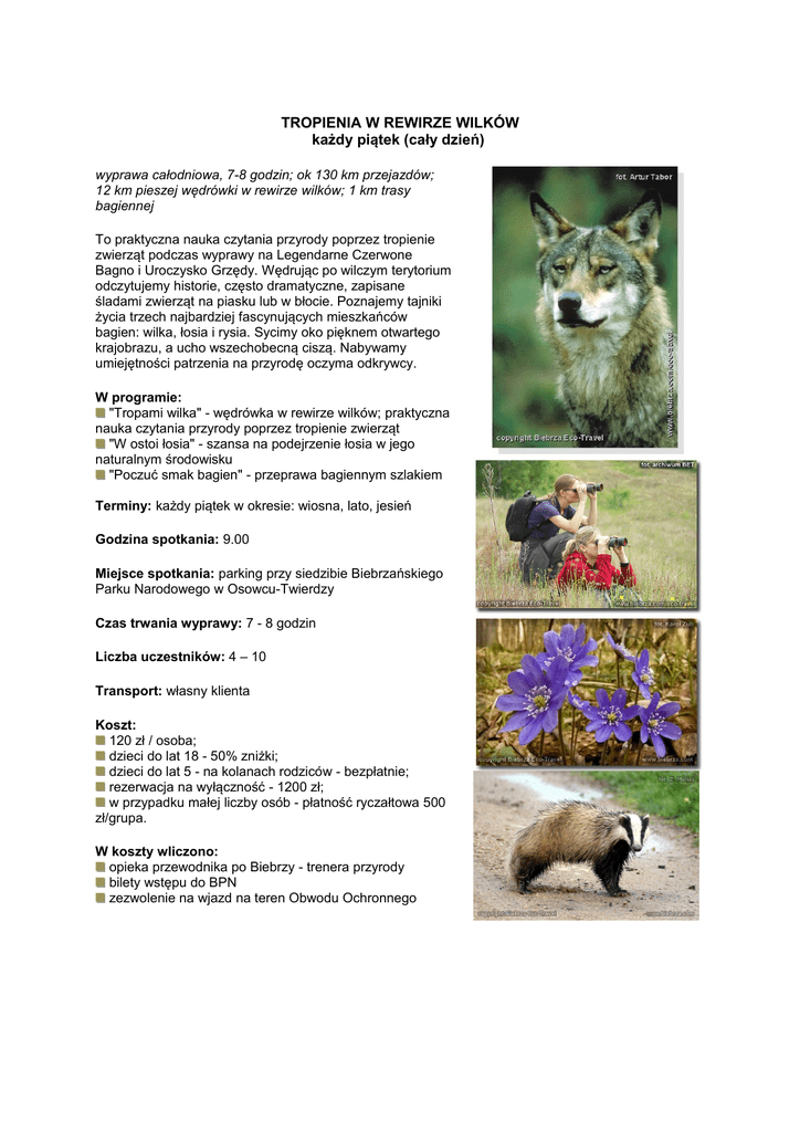 TROPIENIA W REWIRZE WILKÓW każdy piątek (cały dzień) wyprawa całodniowa, 7-8 godzin; ok 130 km przejazdów; 12 km pieszej wędrówki w rewirze wilków; 1 km trasy bagiennej To praktyczna nauka czytania przyrody poprzez tropienie zwierząt podczas wyprawy na Legendarne Czerwone Bagno i Uroczysko Grzędy. Wędrując po wilczym terytorium odczytujemy historie, często dramatyczne, zapisane śladami zwierząt na piasku lub w błocie. Poznajemy tajniki życia trzech najbardziej fascynujących mieszkańców bagien: wilka, łosia i rysia. Sycimy oko pięknem otwartego krajobrazu, a ucho wszechobecną ciszą. Nabywamy umiejętności patrzenia na przyrodę oczyma odkrywcy. W programie: "Tropami wilka" - wędrówka w rewirze wilków; praktyczna nauka czytania przyrody poprzez tropienie zwierząt "W ostoi łosia" - szansa na podejrzenie łosia w jego naturalnym środowisku "Poczuć smak bagien" - przeprawa bagiennym szlakiem Terminy: każdy piątek w okresie: wiosna, lato, jesień Godzina spotkania: 9.00 Miejsce spotkania: parking przy siedzibie Biebrzańskiego Parku Narodowego w Osowcu-Twierdzy Czas trwania wyprawy: 7 - 8 godzin Liczba uczestników: 4 – 10 Transport: własny klienta Koszt: 120 zł / osoba; dzieci do lat 18 - 50% zniżki; dzieci do lat 5 - na kolanach rodziców - bezpłatnie; rezerwacja na wyłączność - 1200 zł; w przypadku małej liczby osób - płatność ryczałtowa 500 zł/grupa. W koszty wliczono: opieka przewodnika po Biebrzy - trenera przyrody bilety wstępu do BPN zezwolenie na wjazd na teren Obwodu Ochronnego Grzędy podatek VAT Nieodpłatnie: upominki firmowe Dodatkowo można zamówić: wypożyczenie lornetki wypożyczenie gumowych osłonek na obuwie Jak należy przygotować się do wyprawy? Ze względu na czas trwania wyprawy polecamy zabranie ze sobą prowiantu, a w okresie letnich upałów obligatoryjnie 1 litr wody na osobę. Odzież wierzchnia winna być stonowana w kolorach oraz nieszeleszcząca. Wskazane jest posiadanie odzieży wodoodpornej oraz butów trekingowych. Do połowy czerwca - a w latach "mokrych" przez cały sezon - na 1 kilometrowym odcinku trasy jest niezbędne obuwie gumowe (możliwość wynajmu na miejscu). Wskazane jest posiadanie lornetek (możliwość wynajmu na miejscu). Wiosną należy zaopatrzyć się w środki odstraszające owady. Latem, niezależnie od pogody, należy nosić odzież z długimi rękawami oraz długimi nogawkami. Osobom o słabszej kondycji oraz rodzinom z małymi dziećmi (do lat 7) polecamy adekwatny program na wyłączność, w innych terminach Rezerwacje: tel. 85-738 0 785 lub 604 304 221 e-mail: [email protected] Więcej propozycji wypraw oraz szczegółowy terminarz imprez można znaleźć na www.biebrza.com