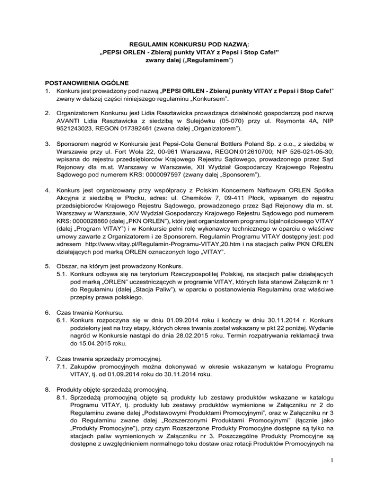 REGULAMIN KONKURSU POD NAZWĄ: „PEPSI ORLEN - Zbieraj punkty VITAY z Pepsi i Stop Cafe!” zwany dalej („Regulaminem”) POSTANOWIENIA OGÓLNE 1. Konkurs jest prowadzony pod nazwą „PEPSI ORLEN - Zbieraj punkty VITAY z Pepsi i Stop Cafe!” zwany w dalszej części niniejszego regulaminu „Konkursem”. 2. Organizatorem Konkursu jest Lidia Rasztawicka prowadząca działalność gospodarczą pod nazwą AVANTI Lidia Rasztawicka z siedzibą w Sulejówku (05-070) przy ul. Reymonta 4A, NIP 9521243023, REGON 017392461 (zwana dalej „Organizatorem”). 3. Sponsorem nagród w Konkursie jest Pepsi-Cola General Bottlers Poland Sp. z o.o., z siedzibą w Warszawie przy ul. Fort Wola 22, 00-961 Warszawa, REGON:012610700; NIP 526-021-05-30; wpisana do rejestru przedsiębiorców Krajowego Rejestru Sądowego, prowadzonego przez Sąd Rejonowy dla m.st. Warszawy w Warszawie, XII Wydział Gospodarczy Krajowego Rejestru Sądowego pod numerem KRS: 0000097597 (zwany dalej „Sponsorem”). 4. Konkurs jest organizowany przy współpracy z Polskim Koncernem Naftowym ORLEN Spółka Akcyjna z siedzibą w Płocku, adres: ul. Chemików 7, 09-411 Płock, wpisanym do rejestru przedsiębiorców Krajowego Rejestru Sądowego, prowadzonego przez Sąd Rejonowy dla m. st. Warszawy w Warszawie, XIV Wydział Gospodarczy Krajowego Rejestru Sądowego pod numerem KRS: 0000028860 (dalej „PKN ORLEN”), który jest organizatorem programu lojalnościowego VITAY (dalej „Program VITAY”) i w Konkursie pełni rolę wykonawcy technicznego w oparciu o właściwe umowy zawarte z Organizatorem i ze Sponsorem. Regulamin Programu VITAY dostępny jest: pod adresem http://www.vitay.pl/Regulamin-Programu-VITAY,20.htm i na stacjach paliw PKN ORLEN działających pod marką ORLEN oznaczonych logo „VITAY”. 5. Obszar, na którym jest prowadzony Konkurs. 5.1. Konkurs odbywa się na terytorium Rzeczypospolitej Polskiej, na stacjach paliw działających pod marką „ORLEN” uczestniczących w programie VITAY, których lista stanowi Załącznik nr 1 do Regulaminu (dalej „Stacja Paliw”), w oparciu o postanowienia Regulaminu oraz właściwe przepisy prawa polskiego. 6. Czas trwania Konkursu. 6.1. Konkurs rozpoczyna się w dniu 01.09.2014 roku i kończy w dniu 30.11.2014 r. Konkurs podzielony jest na trzy etapy, których okres trwania został wskazany w pkt 22 poniżej. Wydanie nagród w Konkursie nastąpi do dnia 28.02.2015 roku. Termin rozpatrywania reklamacji trwa do 15.04.2015 roku. 7. Czas trwania sprzedaży promocyjnej. 7.1. Zakupów promocyjnych można dokonywać w okresie wskazanym w katalogu Programu VITAY, tj. od 01.09.2014 roku do 30.11.2014 roku. 8. Produkty objęte sprzedażą promocyjną. 8.1. Sprzedażą promocyjną objęte są produkty lub zestawy produktów wskazane w katalogu Programu VITAY, tj. produkty lub zestawy produktów wymienione w Załączniku nr 2 do Regulaminu zwane dalej „Podstawowymi Produktami Promocyjnymi”, oraz w Załączniku nr 3 do Regulaminu zwane dalej „Rozszerzonymi Produktami Promocyjnymi” (łącznie jako „Produkty Promocyjne”), przy czym Rozszerzone Produkty Promocyjne dostępne są tylko na stacjach paliw wymienionych w Załączniku nr 3. Poszczególne Produkty Promocyjne są dostępne z uwzględnieniem normalnego toku dostaw oraz rotacji Produktów Promocyjnych na 1 stacjach. Produkty Promocyjne wskazane w Załączniku nr 2 jako dostępne na wybranych stacjach są dostępne z uwzględnieniem zasad organizacyjnych na stacjach. 8.2. Promocja polega na przyznawaniu, za zakup na Stacjach Paliw Produktów Promocyjnych, punktów w rozumieniu Regulaminu Programu VITAY (dalej „Punkty VITAY”) w ilości wskazanej w katalogu Programu VITAY, tj. w ilości która została wskazana w Załączniku nr 2 i 3 do niniejszego Regulaminu. 8.3. W razie rozbieżności między danymi wskazanymi w katalogu Programu VITAY i w Załącznikach do niniejszego Regulaminu, dotyczącymi w szczególności Produktów Promocyjnych i przyznawanych za ich zakup Punktów VITAY, decydujące znaczenie mają dane wskazane w katalogu Programu VITAY. 8.4. W celu uniknięcia wątpliwości, niniejszy Regulamin nie jest postawą do naliczenia jakichkolwiek Punktów VITAY, dodatkowych w stosunku do Punktów naliczanych na podstawie katalogu Programu VITAY. RODZAJE NAGRÓD ORAZ WARTOŚĆ PULI NAGRÓD 9. Wykaz nagród w Konkursie: 9.1. Nagroda I stopnia w postaci skutera Barton Motors Firefox o wartości 3 250,00 zł (słownie: trzy tysiące dwieście pięćdziesiąt złotych) brutto wraz z nagrodą pieniężną w wysokości 361,00 zł (słownie: trzysta sześćdziesiąt jeden złotych). Przed wydaniem nagrody I stopnia płatnik (AVANTI Lidia Rasztawicka) potrąca na poczet zryczałtowanego podatku dochodowego, o którym mowa w art. 30 ust. 1 pkt 2 ustawy o podatku dochodowym od osób fizycznych kwotę odpowiadającą nagrodzie pieniężnej – 45 nagród I stopnia – o łącznej wartości 162 495,00 zł (słownie: sto sześćdziesiąt dwa tysiące czterysta dziewięćdziesiąt pięć złotych) brutto. 9.2. Nagroda II stopnia w postaci karty zakupowej ORLEN (tj. karty paliwowej przedpłaconej TANKBANK) ważnej do dnia 30.09.2015 r., o nominale 100 PLN o wartości 100,00 zł (słownie: sto złotych) brutto wraz z nagrodą pieniężną w wysokości 11,00 zł (słownie: jedenaście złotych). Przed wydaniem nagrody II stopnia płatnik (AVANTI Lidia Rasztawicka) potrąca na poczet zryczałtowanego podatku dochodowego, o którym mowa w art. 30 ust. 1 pkt 2 ustawy o podatku dochodowym od osób fizycznych kwotę odpowiadającą nagrodzie pieniężnej – 1 000 nagród II stopnia – o łącznej wartości 111 000,00 zł (słownie: sto jedenaście tysięcy złotych) brutto. Zasady dotyczące wykorzystania kart zakupowych określone są w regulaminie „Ogólne warunki sprzedaży i używania kart paliwowych przedpłaconych” stanowiącym załącznik nr 6 do Regulaminu. 10. Wartość wszystkich nagród w Konkursie wynosi 273 495,0