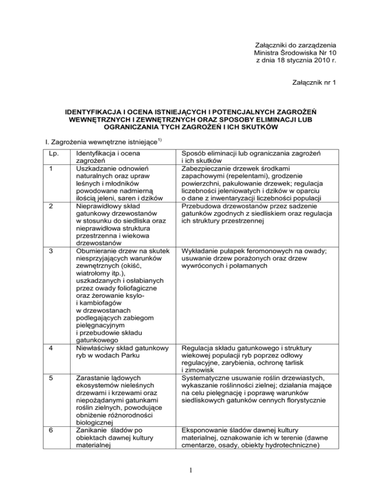 Załączniki do zarządzenia Ministra Środowiska Nr 10 z dnia 18 stycznia 2010 r. Załącznik nr 1 IDENTYFIKACJA I OCENA ISTNIEJĄCYCH I POTENCJALNYCH ZAGROŻEŃ WEWNĘTRZNYCH I ZEWNĘTRZNYCH ORAZ SPOSOBY ELIMINACJI LUB OGRANICZANIA TYCH ZAGROŻEŃ I ICH SKUTKÓW I. Zagrożenia wewnętrzne istniejące1) Lp. 1 2 3 4 5 6 Identyfikacja i ocena zagrożeń Uszkadzanie odnowień naturalnych oraz upraw leśnych i młodników powodowane nadmierną ilością jeleni, saren i dzików Nieprawidłowy skład gatunkowy drzewostanów w stosunku do siedliska oraz nieprawidłowa struktura przestrzenna i wiekowa drzewostanów Obumieranie drzew na skutek niesprzyjających warunków zewnętrznych (okiść, wiatrołomy itp.), uszkadzanych i osłabianych przez owady foliofagiczne oraz żerowanie ksyloi kambiofagów w drzewostanach podlegających zabiegom pielęgnacyjnym i przebudowie składu gatunkowego Niewłaściwy skład gatunkowy ryb w wodach Parku Zarastanie lądowych ekosystemów nieleśnych drzewami i krzewami oraz niepożądanymi gatunkami roślin zielnych, powodujące obniżenie różnorodności biologicznej Zanikanie śladów po obiektach dawnej kultury materialnej Sposób eliminacji lub ograniczania zagrożeń i ich skutków Zabezpieczanie drzewek środkami zapachowymi (repelentami), grodzenie powierzchni, pakułowanie drzewek; regulacja liczebności jeleniowatych i dzików w oparciu o dane z inwentaryzacji liczebności populacji Przebudowa drzewostanów przez sadzenie gatunków zgodnych z siedliskiem oraz regulacja ich struktury przestrzennej Wykładanie pułapek feromonowych na owady; usuwanie drzew porażonych oraz drzew wywróconych i połamanych Regulacja składu gatunkowego i struktury wiekowej populacji ryb poprzez odłowy regulacyjne, zarybienia, ochronę tarlisk i zimowisk Systematyczne usuwanie roślin drzewiastych, wykaszanie roślinności zielnej; działania mające na celu pielęgnację i poprawę warunków siedliskowych gatunków cennych florystycznie Eksponowanie śladów dawnej kultury materialnej, oznakowanie ich w terenie (dawne cmentarze, osady, obiekty hydrotechniczne) 1 7 Wydeptywanie pokrywy glebowej; uszkadzanie brzegów rzek i jezior przez pieszych 8 Zły stan populacji ryb łososiowatych; niewykorzystanie potencjalnych możliwości biotopu i tarlisk przez ryby łososiowate Proces eutrofizacji prowadzący do przebudowy zespołów ryb w niewłaściwym kierunku Możliwość przyspieszenia zmian degradacyjnych ichtiofauny pod wpływem eutrofizacji w wyniku złej organizacji wędkarstwa Niska liczebność niektórych cennych gatunków ptaków 9 10 11 Wykonanie zabezpieczeń technicznych, polegających na naprawie kładek, poręczy i schodków oraz pomostów wędkarskich; oznakowanie i utrzymanie szlaków turystycznych, miejsc postoju i biwakowania, przystani wodnych i miejsc rekreacyjnych zgodnie z regulaminem Monitoring stanu czystości wód; zarybianie; ochrona tarlisk; zimowisk; pozyskanie tarlaków; ograniczenia w dostępie do amatorskiego połowu ryb Programy ochrony i wspomagania gatunków, połowy regulacyjne, kontrolne, pozyskanie tarlaków, zarybienia Udostępnianie do amatorskiego połowu ryb na zasadach opisanych w regulaminie Wyznaczanie stref ochronnych; wywieszanie skrzynek lęgowych; pozostawianie drzew dziuplastych oraz zamierających i martwych II. Zagrożenia wewnętrzne potencjalne1) Lp. Identyfikacja zagrożeń 1 Zagrożenie pożarami 2 Osłabianie i obumieranie drzewostanów na skutek intensywnego żeru owadów foliofagicznych Zagrożenie zwierząt w okresie zimowym 3 Sposób eliminacji lub ograniczania zagrożeń i ich skutków Orka pasów przeciwpożarowych; usuwanie martwych roślin z pasów przeciwpożarowych; utrzymanie sprawności punktów czerpania wody; przejezdności dróg pożarowych; zabezpieczenie miejsc wyznaczonych na ogniska Wykładanie pułapek feromonowych na owady; kontrola liczebności; ocena zagrożenia; zwalczanie masowego pojawu owadów Dokarmianie w okresie śnieżnej i mroźnej zimy III. Zagrożenia zewnętrzne istniejące1) Lp. Identyfikacja zagrożeń 1 Dopływ zanieczyszczeń antropogenicznych i geogenicznych wnoszonych do Parku przez rzeki i inne cieki zlewni położone poza obszarem Parku Konflikt pomiędzy udostępnieniem Parku a ochroną przyrody, brak 2 Sposób eliminacji lub ograniczania zagrożeń i ich skutków Współdziałanie administracji Parku z organami administracji lokalnej i samorządami gmin w celu ochrony wód powierzchniowych i podziemnych zlewni Parku Troska o dostępność informacji na temat wartości przyrodniczych i kulturowych Parku oraz regionu, jego ochrony, prowadzenie działalności 2 akceptacji dla obowiązujących zakazów, niedostateczna wiedza o terenie Parku 3 Nie w pełni drożna przepławka na Elektrowni Wodnej Kamienna na Drawie edukacyjnej i wydawniczej; montaż tablic informacyjnych poza granicami Parku; współpraca z podmiotami zainteresowanymi ochroną przyrody Podjęcie starań zmierzających do polepszenia funkcjonowania przepławki IV. Zagrożenia zewnętrzne potencjalne 1) Lp. Identyfikacja zagrożeń 1 Eutrofizacja wód rzeki Drawy oraz skażenie gleby na skutek nawożenia gnojowicą pól położonych w bezpośrednim sąsiedztwie rzeki przez Fermę Tuczu Trzody Chlewnej w Chomętowie Zagrożenie zwierząt i ludzi wścieklizną 2 3 Niepożądany wpływ na rodzime, dzikie populacje zwierząt i roślin przez gatunki obce i inwazyjne Sposób eliminacji lub ograniczania zagrożeń i ich skutków Monitoring jakości gleb i wód; starania administracyjne o ograniczenie negatywnego wpływu funkcjonowania fermy na ekosystemy Parku Redukcja zwierząt rozprzestrzeniających chorobę oraz wykładanie szczepionek przeciwko wściekliźnie Monitoring, eliminacja obcych gatunków zwierząt i roślin _________________ 1) Zagrożenia uszeregowano od najistotniejszego 3