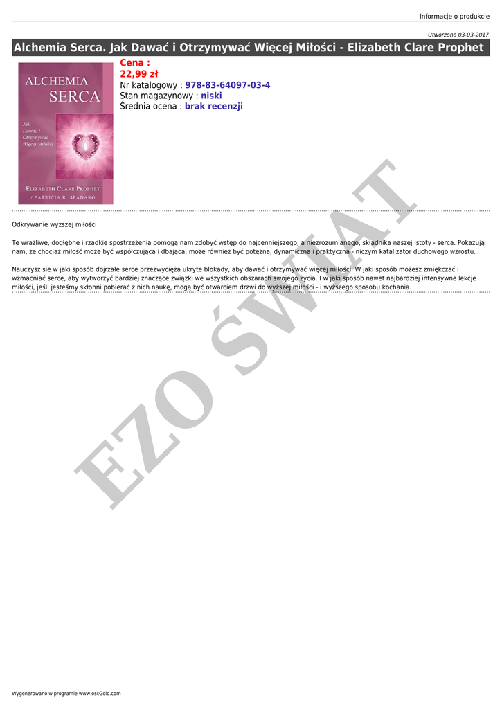 Informacje o produkcie Utworzono 03-03-2017 Alchemia Serca. Jak Dawać i Otrzymywać Więcej Miłości - Elizabeth Clare Prophet Cena : 22,99 zł IA T Nr katalogowy : 978-83-64097-03-4 Stan magazynowy : niski Średnia ocena : brak recenzji Odkrywanie wyższej miłości Te wrażliwe, dogłębne i rzadkie spostrzeżenia pomogą nam zdobyć wstęp do najcenniejszego, a niezrozumianego, składnika naszej istoty - serca. Pokazują nam, że chociaż miłość może być współczująca i dbająca, może również być potężna, dynamiczna i praktyczna - niczym katalizator duchowego wzrostu. EZ O ŚW Nauczysz sie w jaki sposób dojrzałe serce przezwycięża ukryte blokady, aby dawać i otrzymywać więcej miłości. W jaki sposób możesz zmiękczać i wzmacniać serce, aby wytworzyć bardziej znaczące związki we wszystkich obszarach swojego życia. I w jaki sposób nawet najbardziej intensywne lekcje miłości, jeśli jesteśmy skłonni pobierać z nich naukę, mogą być otwarciem drzwi do wyższej miłości - i wyższego sposobu kochania. Wygenerowano w programie www.oscGold.com
