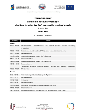 Harmonogram szkolenia specjalistycznego dla Koordynatorów CAF oraz osób wspierających 8-9.02.2010 r., Hotel Akor ul. Ludwikowo 1, Bydgoszcz Godziny Temat Dzień I 10:00 - 10.30 Wprowadzenie – przedstawienie planu działań podczas procesu samooceny w urzędach 10:30 – 11:30 Podstawowe zasady Modelu CAF i procesu prowadzenia samooceny 11.30 - 11.45 Przerwa kawowa 11.45 - 14.00 Omówienie wymagań Modelu CAF – Potencjał 14.00 – 14:45 Przerwa obiadowa 14.45 - 16.15 Omówienie wymagań Modelu CAF – Potencjał 16.15 – 16:30 Przerwa kawowa Zrozumienie punktacji klasycznej Modelu CAF oraz tzw. punktacji „dostrojonej” 16.30 - 18.00 Modelu CAF Dzień II 8.30 - 10.15 Omówienie kryteriów i skali oceny dla Wyników 10.30-11.15 Przerwa kawowa 11.15-11.30 Ćwiczenia 11.30-14.15 Przerwa obiadowa 13.00 - 14.15 Określanie obszarów do poprawy oraz mocnych stron 14.15 - 14.30 Przerwa kawowa 14.30 - 16.30 Planowanie działań doskonalących po przeprowadzonej samoocenie Partner projektu F5 Konsulting Sp. z o.o. ul. Składowa 5, 61-897 Poznań T: 061 856 69 60 F: 061 853 02 95