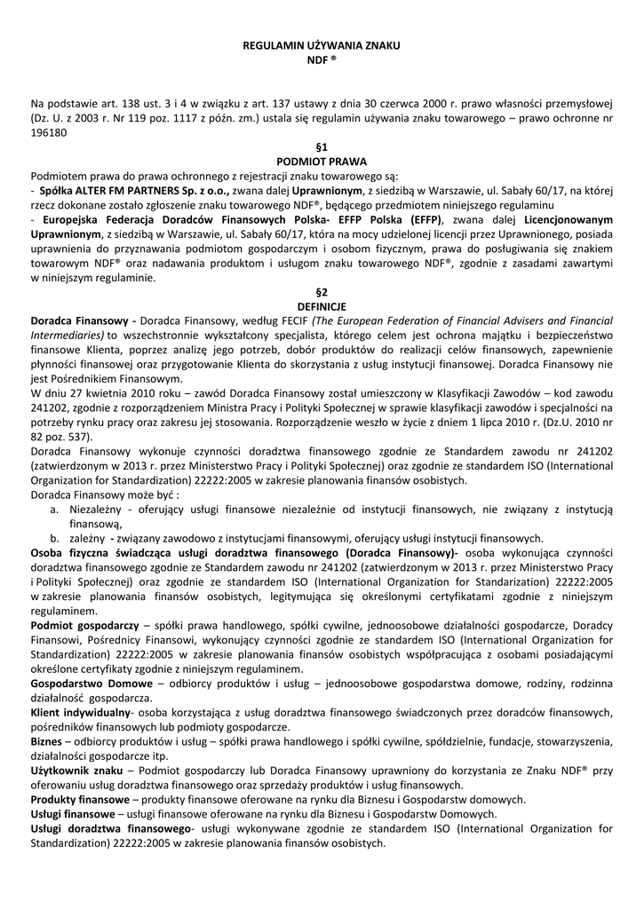 REGULAMIN UŻYWANIA ZNAKU NDF ® Na podstawie art. 138 ust. 3 i 4 w związku z art. 137 ustawy z dnia 30 czerwca 2000 r. prawo własności przemysłowej (Dz. U. z 2003 r. Nr 119 poz. 1117 z późn. zm.) ustala się regulamin używania znaku towarowego – prawo ochronne nr 196180 §1 PODMIOT PRAWA Podmiotem prawa do prawa ochronnego z rejestracji znaku towarowego są: - Spółka ALTER FM PARTNERS Sp. z o.o., zwana dalej Uprawnionym, z siedzibą w Warszawie, ul. Sabały 60/17, na której rzecz dokonane zostało zgłoszenie znaku towarowego NDF®, będącego przedmiotem niniejszego regulaminu - Europejska Federacja Doradców Finansowych Polska- EFFP Polska (EFFP), zwana dalej Licencjonowanym Uprawnionym, z siedzibą w Warszawie, ul. Sabały 60/17, która na mocy udzielonej licencji przez Uprawnionego, posiada uprawnienia do przyznawania podmiotom gospodarczym i osobom fizycznym, prawa do posługiwania się znakiem towarowym NDF® oraz nadawania produktom i usługom znaku towarowego NDF®, zgodnie z zasadami zawartymi w niniejszym regulaminie. §2 DEFINICJE Doradca Finansowy - Doradca Finansowy, według FECIF (The European Federation of Financial Advisers and Financial Intermediaries) to wszechstronnie wykształcony specjalista, którego celem jest ochrona majątku i bezpieczeństwo finansowe Klienta, poprzez analizę jego potrzeb, dobór produktów do realizacji celów finansowych, zapewnienie płynności finansowej oraz przygotowanie Klienta do skorzystania z usług instytucji finansowej. Doradca Finansowy nie jest Pośrednikiem Finansowym. W dniu 27 kwietnia 2010 roku – zawód Doradca Finansowy został umieszczony w Klasyfikacji Zawodów – kod zawodu 241202, zgodnie z rozporządzeniem Ministra Pracy i Polityki Społecznej w sprawie klasyfikacji zawodów i specjalności na potrzeby rynku pracy oraz zakresu jej stosowania. Rozporządzenie weszło w życie z dniem 1 lipca 2010 r. (Dz.U. 2010 nr 82 poz. 537). Doradca Finansowy wykonuje czynności doradztwa finansowego zgodnie ze Standardem zawodu nr 241202 (zatwierdzonym w 2013 r. przez Ministerstwo Pracy i Polityki Społecznej) oraz zgodnie ze standardem ISO (International Organization for Standardization) 22222:2005 w zakresie planowania finansów osobistych. Doradca Finansowy może być : a. Niezależny - oferujący usługi finansowe niezależnie od instytucji finansowych, nie związany z instytucją finansową, b. zależny - związany zawodowo z instytucjami finansowymi, oferujący usługi instytucji finansowych. Osoba fizyczna świadcząca usługi doradztwa finansowego (Doradca Finansowy)- osoba wykonująca czynności doradztwa finansowego zgodnie ze Standardem zawodu nr 241202 (zatwierdzonym w 2013 r. przez Ministerstwo Pracy i Polityki Społecznej) oraz zgodnie ze standardem ISO (International Organization for Standarization) 22222:2005 w zakresie planowania finansów osobistych, legitymująca się określonymi certyfikatami zgodnie z niniejszym regulaminem. Podmiot gospodarczy – spółki prawa handlowego, spółki cywilne, jednoosobowe działalności gospodarcze, Doradcy Finansowi, Pośrednicy Finansowi, wykonujący czynności zgodnie ze standardem ISO (International Organization for Standardization) 22222:2005 w zakresie planowania finansów osobistych współpracująca z osobami posiadającymi określone certyfikaty zgodnie z niniejszym regulaminem. Gospodarstwo Domowe – odbiorcy produktów i usług – jednoosobowe gospodarstwa domowe, rodziny, rodzinna działalność gospodarcza. Klient indywidualny- osoba korzystająca z usług doradztwa finansowego świadczonych przez doradców finansowych, pośredników finansowych lub podmioty gospodarcze. Biznes – odbiorcy produktów i usług – spółki prawa handlowego i spółki cywilne, spółdzielnie, fundacje, stowarzyszenia, działalności gospodarcze itp. Użytkownik znaku – Podmiot gospodarczy lub Doradca Finansowy uprawniony do korzystania ze Znaku NDF® przy oferowaniu usług doradztwa finansowego oraz sprzedaży produktów i usług finansowych. Produkty finansowe – produkty finansowe oferowane na rynku dla Biznesu i Gospodarstw domowych. Usługi finansowe – usługi finansowe oferowane na rynku dla Biznesu i Gospodarstw Domowych. Usługi doradztwa finansowego- usługi wykonywane zgodnie ze standardem ISO (International Organization for Standardization) 22222:2005 w zakresie planowania finansów osobistych. Usługi Rekomendowane - usługi okołobiznesowe, w tym informacje finansowe, analizy finansowe świadczone przez podmioty, które na zasadach określonych w niniejszym Regulaminie, mogą posługiwać się znakiem „REKOMENDACJANDF®”. Produkty Rekomendowane – produkty i instrumenty finansowe oraz produkty rzeczowe, które na zasadach określonych w niniejszym Regulaminie, mogą posługiwać się znakiem „REKOMENDACJA- NDF®”. Świadectwo Wiarygodności Produktu- wskazuje na wiarygodność produktu, z którego zamierza skorzystać Klient. Podstawowymi kryteriami przy ocenie usługi i produktu finansowego są: zrozumiałość zapisów w umowach, poziom precyzji zdefiniowanych pojęć (brak dowolności interpretacji), zgodność zapisów z obowiązującymi zapisami prawa, możliwość wpływania Klienta na treść (zawartość) zapisów umowy, uczciwość intencji dostawcy produktu przy formułowaniu zapisów umowy. Świadectwo Wiarygodności Produktu nadawane jest przez Europejską Federację Doradców Finansowych. 1. 2. 3. 4. 5. 6. 1. 2. 3. 4. 5. 6. §3 PRZEDMIOT REGULAMINU Przedmiotem regulaminu jest słowno-graficzny znak towarowy, który stanowi zestaw liter „NDF®”, zwany dalej Znakiem. Znak wyrażony jest w postaci NDF® Znak towarowy NDF®, w rozwinięciu, Niezależne Doradztwo Finansowe (ang. Independent Financial Adviser-IFA), świadczy o spełnianiu, przez osoby fizyczne i podmioty oferujące produkty i usługi doradztwa finansowego, dla podmiotów, gospodarstw domowych, klientów indywidualnych (w klasach towarowych 35 i 36), warunków okre