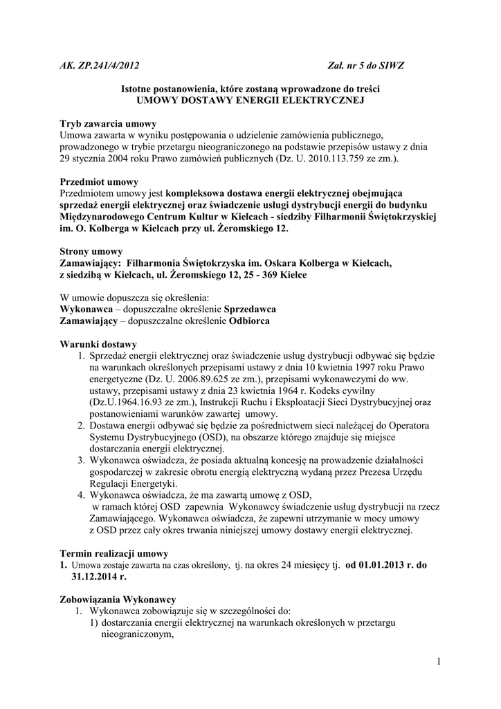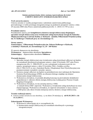 AK. ZP.241/4/2012 Zał. nr 5 do SIWZ Istotne postanowienia, które zostaną wprowadzone do treści UMOWY DOSTAWY ENERGII ELEKTRYCZNEJ Tryb zawarcia umowy Umowa zawarta w wyniku postępowania o udzielenie zamówienia publicznego, prowadzonego w trybie przetargu nieograniczonego na podstawie przepisów ustawy z dnia 29 stycznia 2004 roku Prawo zamówień publicznych (Dz. U. 2010.113.759 ze zm.). Przedmiot umowy Przedmiotem umowy jest kompleksowa dostawa energii elektrycznej obejmująca sprzedaż energii elektrycznej oraz świadczenie usługi dystrybucji energii do budynku Międzynarodowego Centrum Kultur w Kielcach - siedziby Filharmonii Świętokrzyskiej im. O. Kolberga w Kielcach przy ul. Żeromskiego 12. Strony umowy Zamawiający: Filharmonia Świętokrzyska im. Oskara Kolberga w Kielcach, z siedzibą w Kielcach, ul. Żeromskiego 12, 25 - 369 Kielce W umowie dopuszcza się określenia: Wykonawca – dopuszczalne określenie Sprzedawca Zamawiający – dopuszczalne określenie Odbiorca Warunki dostawy 1. Sprzedaż energii elektrycznej oraz świadczenie usług dystrybucji odbywać się będzie na warunkach określonych przepisami ustawy z dnia 10 kwietnia 1997 roku Prawo energetyczne (Dz. U. 2006.89.625 ze zm.), przepisami wykonawczymi do ww. ustawy, przepisami ustawy z dnia 23 kwietnia 1964 r. Kodeks cywilny (Dz.U.1964.16.93 ze zm.), Instrukcji Ruchu i Eksploatacji Sieci Dystrybucyjnej oraz postanowieniami warunków zawartej umowy. 2. Dostawa energii odbywać się będzie za pośrednictwem sieci należącej do Operatora Systemu Dystrybucyjnego (OSD), na obszarze którego znajduje się miejsce dostarczania energii elektrycznej. 3. Wykonawca oświadcza, że posiada aktualną koncesję na prowadzenie działalności gospodarczej w zakresie obrotu energią elektryczną wydaną przez Prezesa Urzędu Regulacji Energetyki. 4. Wykonawca oświadcza, że ma zawartą umowę z OSD, w ramach której OSD zapewnia Wykonawcy świadczenie usług dystrybucji na rzecz Zamawiającego. Wykonawca oświadcza, że zapewni utrzymanie w mocy umowy z OSD przez cały okres trwania niniejszej umowy dostawy energii elektrycznej. Termin realizacji umowy 1. Umowa zostaje zawarta na czas określony, tj. na okres 24 miesięcy tj. od 01.01.2013 r. do 31.12.2014 r. Zobowiązania Wykonawcy 1. Wykonawca zobowiązuje się w szczególności do: 1) dostarczania energii elektrycznej na warunkach określonych w przetargu nieograniczonym, 1 2) dostarczania energii elektrycznej bez nieprzerwanych dostaw, zgodnie z obowiązującymi parametrami technicznymi, dotrzymywania standardów jakościowych obsługi, 3) przyjmowania od Zamawiającego, w uzgodnionym czasie, zgłoszeń i reklamacji, dotyczących dostarczanej energii. 4) informowania Zamawiającego o terminach planowanych przerw i ograniczeń w dostarczaniu energii elektrycznej z wyprzedzeniem umożliwiającym przygotowanie się odbiorcy do wystąpienia tych przerw lub ograniczeń; 5) niezwłocznego przystąpienia do likwidacji przerw w dostarczaniu energii elektrycznej i zakłóceń w jej dostarczaniu; 6) umożliwienia Zamawiającemu wglądu do wskazań układu pomiaroworozliczeniowego oraz dokumentów stanowiących podstawę do rozliczeń za dostarczoną energię elektryczną oraz kontroli prawidłowości wskazań tych układów; 2. W przypadku niedotrzymania parametrów technicznych oraz jakościowych standardów obsługi, Zamawiającemu przysługuje, na jego pisemny wniosek, prawo do bonifikaty wg stawek określonych w rozporządzeniu Ministra Gospodarki z dnia 18 sierpnia 2011 r. w sprawie szczegółowych zasad kształtowania i kalkulacji taryf oraz rozliczeń w obrocie energii (Dz. U. 2011.189.1126). Zobowiązania Zamawiającego 1. Zamawiający zobowiązuje się w szczególności do: 1) pobierania energii elektrycznej zgodnie z obowiązującymi przepisami i warunkami niniejszej umowy, 2) podjęcia wszelkich starań mających na celu zabezpieczenie przed uszkodzeniem lub zniszczeniem należącej do niego sieci lub wewnętrznej instalacji zasilającej i odbiorczej, urządzeń pomiarowych oraz plomb legalizacyjnych na wszystkich elementach, a w szczególności plomb zabezpieczeń głównych i w układach pomiarowo-rozliczeniowych; 3) terminowego regulowania należności za energię elektryczną, 4) przekazywania Wykonawcy wszelkich informacji koniecznych do prawidłowej realizacji umowy; 5) umożliwienia upoważnionym przedstawicielom Wykonawcy dostępu, wraz z niezbędnym sprzętem, do należących do niego elementów sieci i urządzeń znajdujących się na terenie lub w obiekcie Zamawiającego, w celu przeprowadzania prac eksploatacyjnych lub usunięcia awarii w sieci, lub do układu pomiarowo-rozliczeniowego. Wartość przedmiotu umowy, rozliczenia stron 1. Wartość przedmiotu umowy określona ofertą przetargową Wykonawcy za przewidywane przez Zamawiającego zużycie energii elektrycznej na warunkach określonych w przetargu, według zaoferowanych przez Wykonawcę cen jednostkowych sprzedaży energii elektrycznej i jej dystrybucji, wynosi brutto ……….... zł. 2. Wartość określona w ust. 1 może ulec zmianie w zależności od faktycznego zużycia energii elektrycznej, ewentualnej zmiany Taryfy OSD lub zmiany podatku od towarów i usług VAT. 2 3. Ceny netto w zakresie sprzedaży energii elektrycznej będą stałe w okresie obowiązywania umowy. 4. Rozliczenia za sprzedaż energii elektrycznej i świadczenie usługi dystrybucji, dokonywane będą na podstawie wskazań układów pomiarowo-rozliczeniowych, oraz podanych w ofercie Wykonawcy cen jednostkowych sprzedaży energii oraz jej dystrybucji. 5. Rozliczenia za pobraną energię elektryczną obywać sie będą w 1- miesięcznych okresach rozliczeniowych. 6. Podstawą do wypłaty wynagrodzenia będą faktury wystawione przez Wykonawcę. 7. Faktury za energię elektryczną regulowane będą przelewem na konto Wykonawcy w terminie 21 dni od daty wystawienia faktury, o ile faktura zostanie dostarczona do siedziby Zam