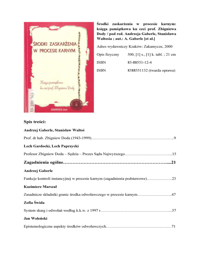 Środki zaskarżenia w procesie karnym: księga pamiątkowa ku czci prof. Zbigniewa Dody / pod red. Andrzeja Gaberle, Stanisława Waltosia ; aut.: A. Gaberle [et al.] Adres wydawniczy Kraków: Zakamycze, 2000 Opis fizyczny 500, [1] s., [1] k. tabl. ; 21 cm ISBN 83-88551-12-4 ISBN 8388551132 (twarda oprawa) Spis treści: Andrzej Gaberle, Stanisław Waltoś Prof. dr hab. Zbigniew Doda (1943-1999)……………………………………………………..9 Lech Gardocki, Lech Paprzycki Profesor Zbigniew Doda – Sędzia – Prezes Sądu Najwyższego……………………………...15 Zagadnienia ogólne…………………………………………………………....21 Andrzej Gaberle Funkcje kontroli instancyjnej w procesie karnym (zagadnienia podstawowe)……………….23 Kazimierz Marszał Zasadnicze składniki granic środka odwoławczego w procesie karnym……………………..47 Zofia Świda System skarg i odwołań według k.k.w. z 1997 r……………………………………………...57 Jan Woleński Epistemologiczne aspekty środków odwoławczych……………………………………….…71 Apelacja……………………………………………………………………….81 Karl Heinz Gossel Die Uberprufung tatsachlicher Feststellungen im Rechtsmittelzug des deutschen Strafverfahrens………………………………………………………………………………..83 Lech K. Paprzycki Obraza przepisów postępowania dotyczących przeprowadzania dowodu z opinii biegłego jako podstawa wniesienia środka odwoławczego, ze szczególnym uwzględnieniem opinii psychiatryczno-psychologicznej…………………………………………………………….107 Andrzej Wąsek Prawo oskarżonego pozbawionego wolności do udziału w rozprawie odwoławczej……….129 Thomas Weigend Das Rechtsmittel der Appellation Anmerkungen aus deutscher Sicht………………………147 Nadzwyczajne środki zaskarżenia……………………………………….…173 Piotr Kruszynski Podstawy kasacji w nowym k.p.k……………………………………………………..…….175 Andrzej Murzynowski Prawomocność orzeczeń sądowych jako przesłanka kasacji………………………………..191 Dobrosława Szumiło-Kulczycka Prawne warunki dopuszczalności wznowienia postępowania sądowego…………………...213 Andrzej Światłowski Odwołanie zeznań lub wyjaśnień pomawiających jako przyczyna wznowienia postępowania karnego………………………………………………………………………………………237 Nieważność z mocy samego prawa Zbigniew Gostyński Z problematyki zakazu reformationis in peius w związku z nieważnością orzeczenia……..251 Piotr Hofmański, Stanisław Zabłocki Nieważność orzeczeń - wybrane problemy………………………………………………….265 Romuald Kmiecik Przedmiot i kontrola formalna wniosku o stwierdzenie nieważności orzeczenia z mocy prawa (art. 102 § 2 k.p.k.)…………………………………………………………………..………309 Stanisław Waltoś Nieważność ipso iure, czyli przyczynek do hipertrofii środków zaskarżenia w polskim procesie karnym……………………………………………………………………………..325 Sprzeciwy Ireneusz Nowikowski Kwestia częściowego cofnięcia sprzeciwów w procesie karnym……………………..…….345 Kazimier Zgryzek Warunki dopuszczalności wniesienia sprzeciwu od nakazu karnego……………………….367 Inne zagadnienia Walter Gropp Rechtsschutz gegen Durchsuchungen und Beschlagnahmen im Ermittlungsverfahren…….389 Tomasz Grzegorczyk Odwołanie w systemie karno-procesowych środków zaskarżenia……………………...…..407 Barbara Nita Skarga konstytucyjna jako środek prawny umożliwiający korektę prawomocnego orzeczenia wydanego w postępowaniu karnym………………………………………………………....427 Edward Skrętowicz Zażalenie na postanowienie kończące postępowanie karne…………………………………449 Ryszard A. Stefański Zaskarżalność postanowień w przedmiocie środka zapobiegawczego……………………...455 Marianna Korcyl-Wolska Kilka uwag na temat zaskarżania postanowienia inicjującego postępowanie w sprawach nieletnich przed sądem rodzinnym………………………………....……………….………479 Wykaz publikacji Profesora Zbigniewa Dody……………………………………...…….489
